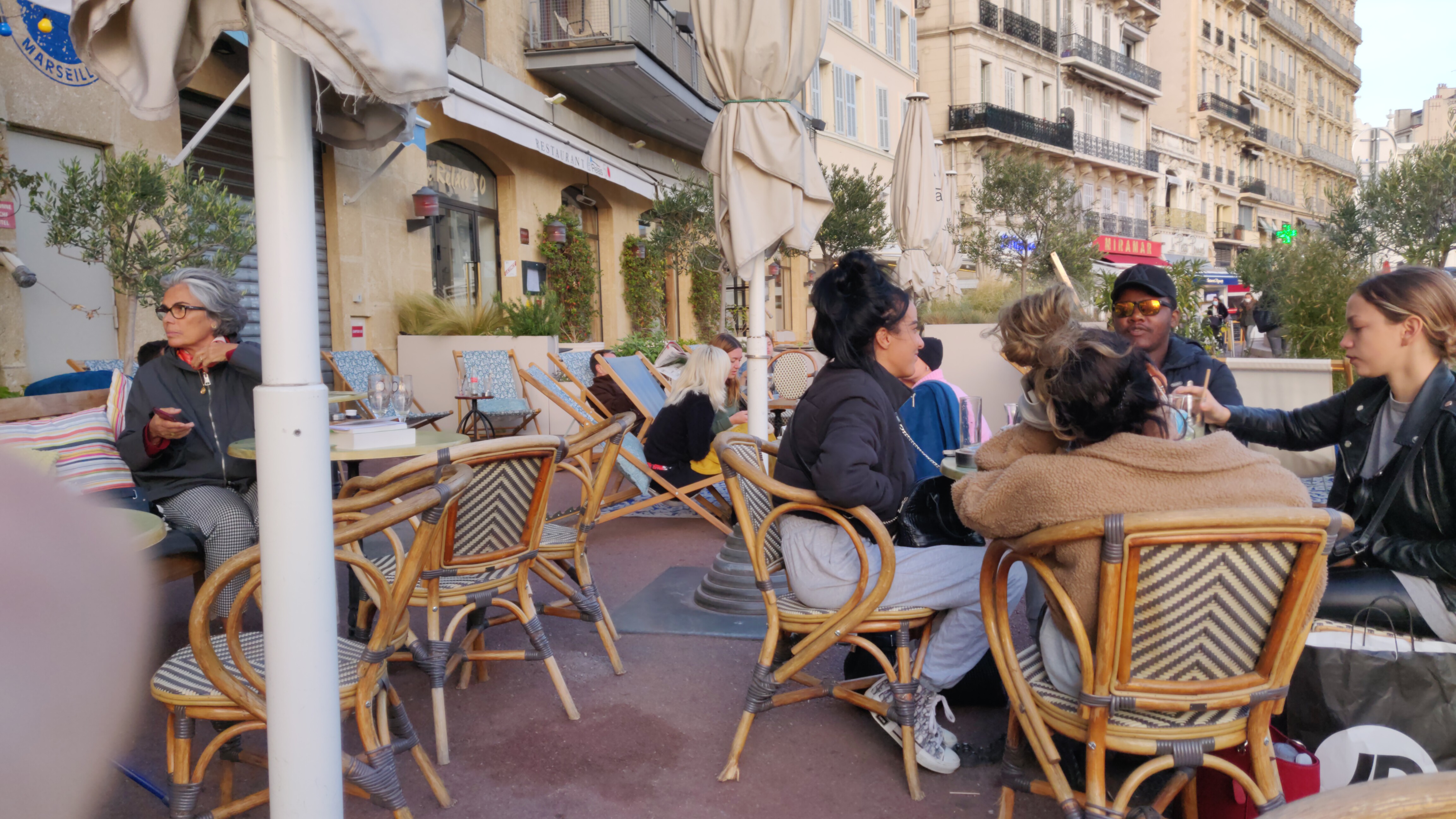Terrasse au soleil... côté Mairie vieux port...servie selon mes petits caprices,genre chocolat chaud mais dans un verre 😉... ,donc à la carte,et donc j'ai trouvé très sympa...d'autant que le serveur l'est aussi et cherche à faire plaisir ...même des petites couvertures à disposition s'il fait un peu frais ou froid en terrasse si soleil insuffisant ! Les serveurs ça fait beaucoup !😉