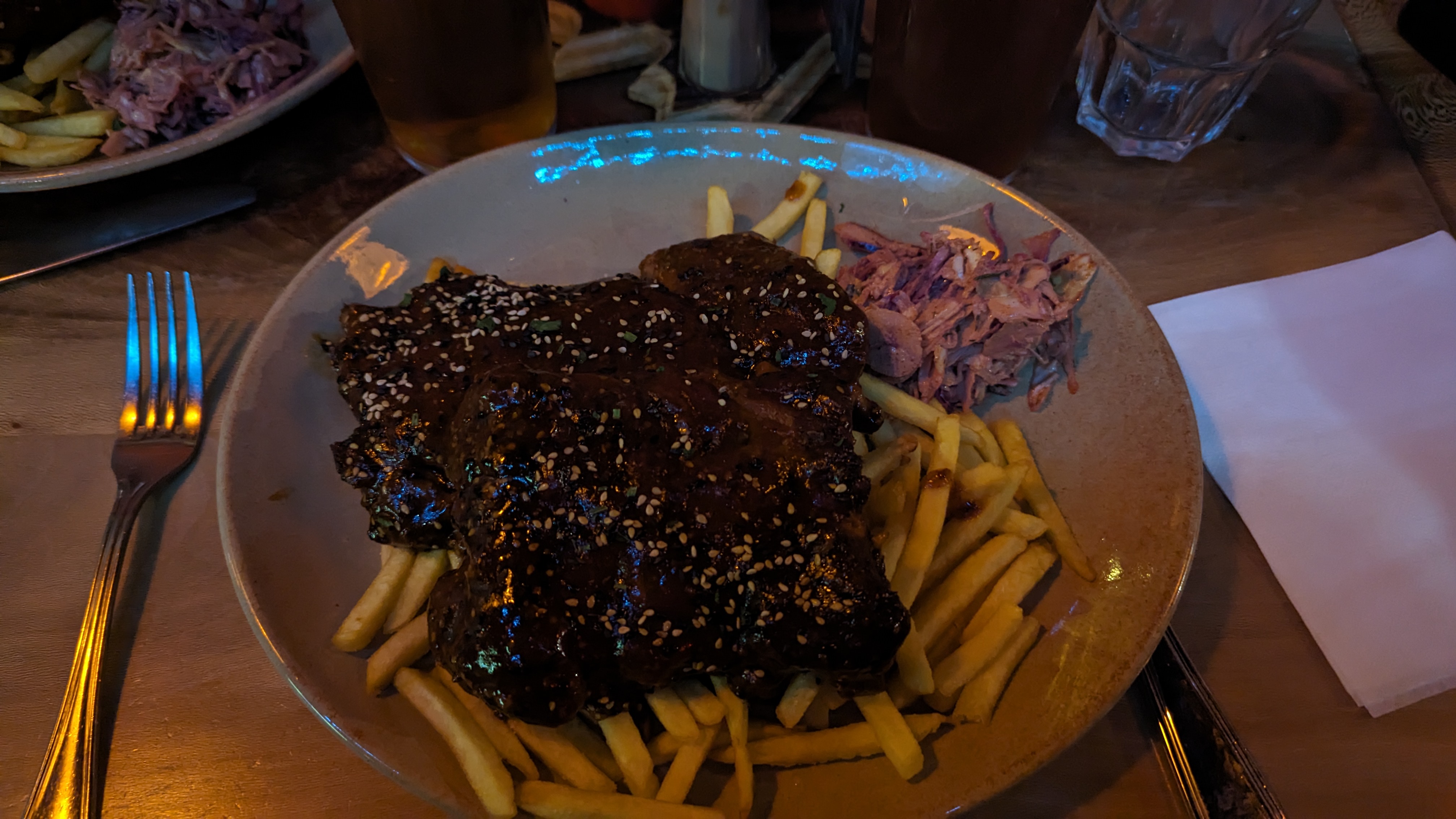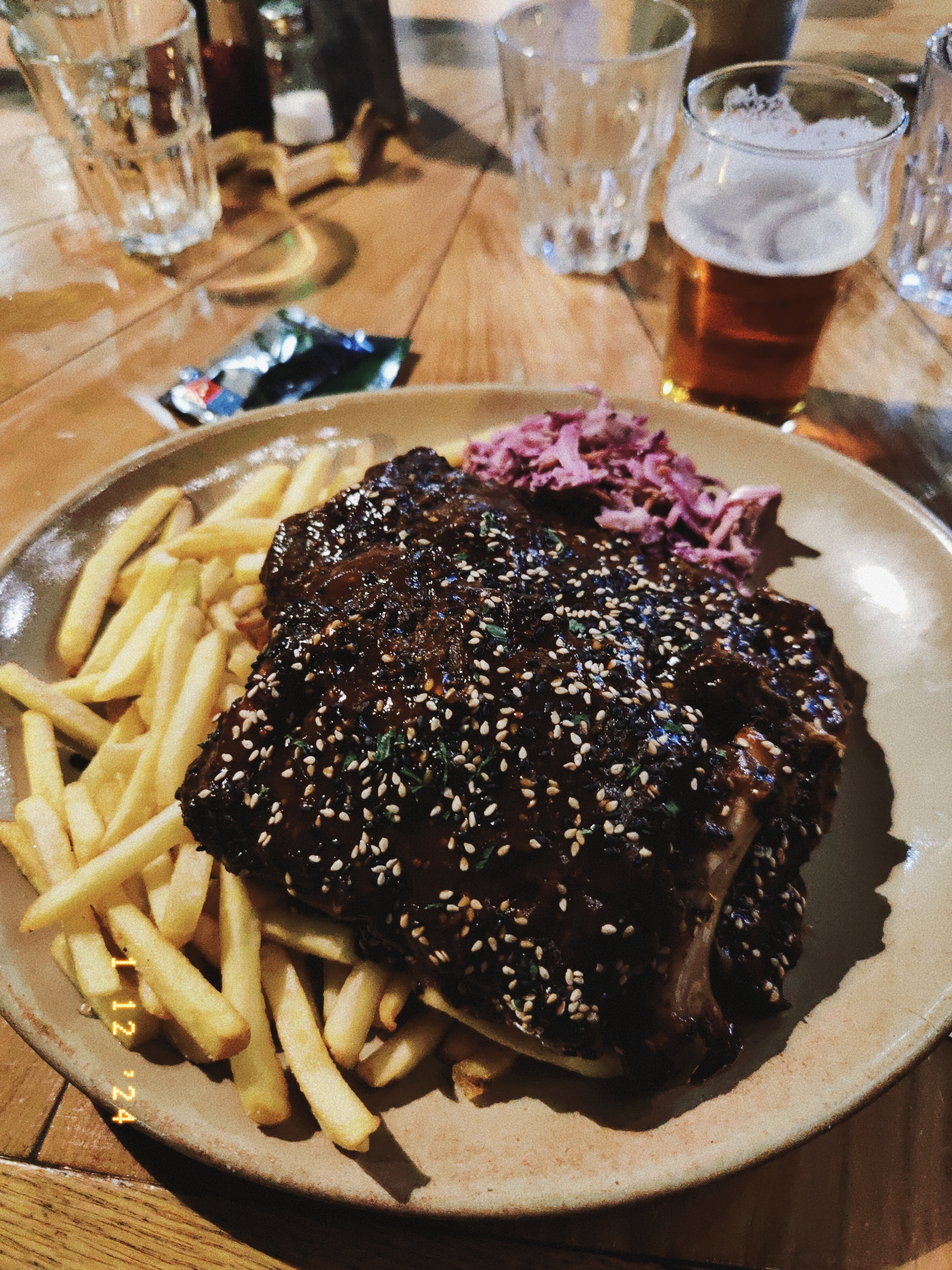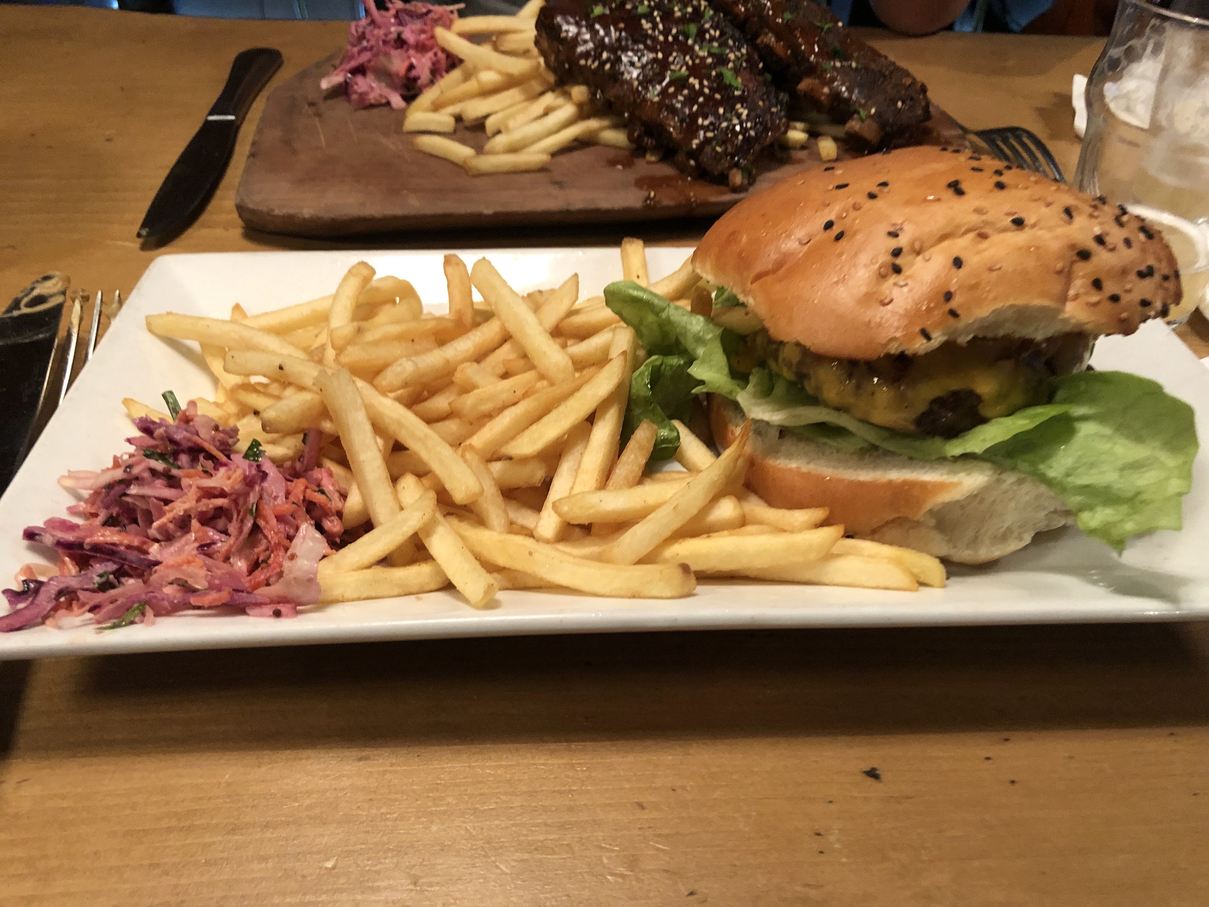 N'ayant pas très faim, nous avons pris un plat de ribs pour deux. Très copieux (donc bien pour deux petits mangeurs) et les ribs vraiment bonnes. Quant à la bière rousse, elle était vraiment top. Bonne adresse à Cham