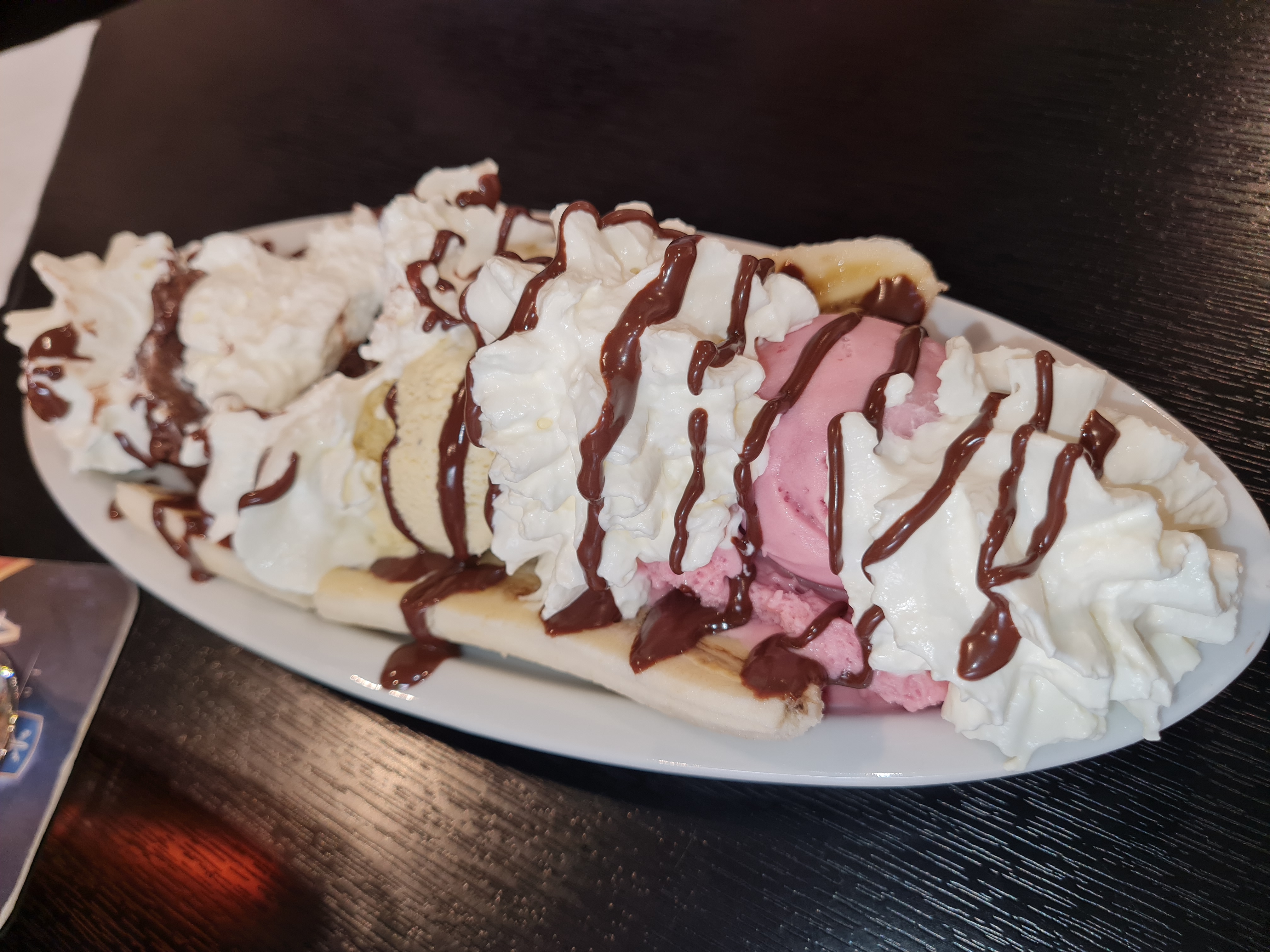 Patrons et employés très accueillant Je recommande de bonnes bananes splits Banane entière une boul le de glace au chocolat , une boule de glace vanille , une boule fraise chantilly et chocolat fondut un délice j en mange tellement c est bon