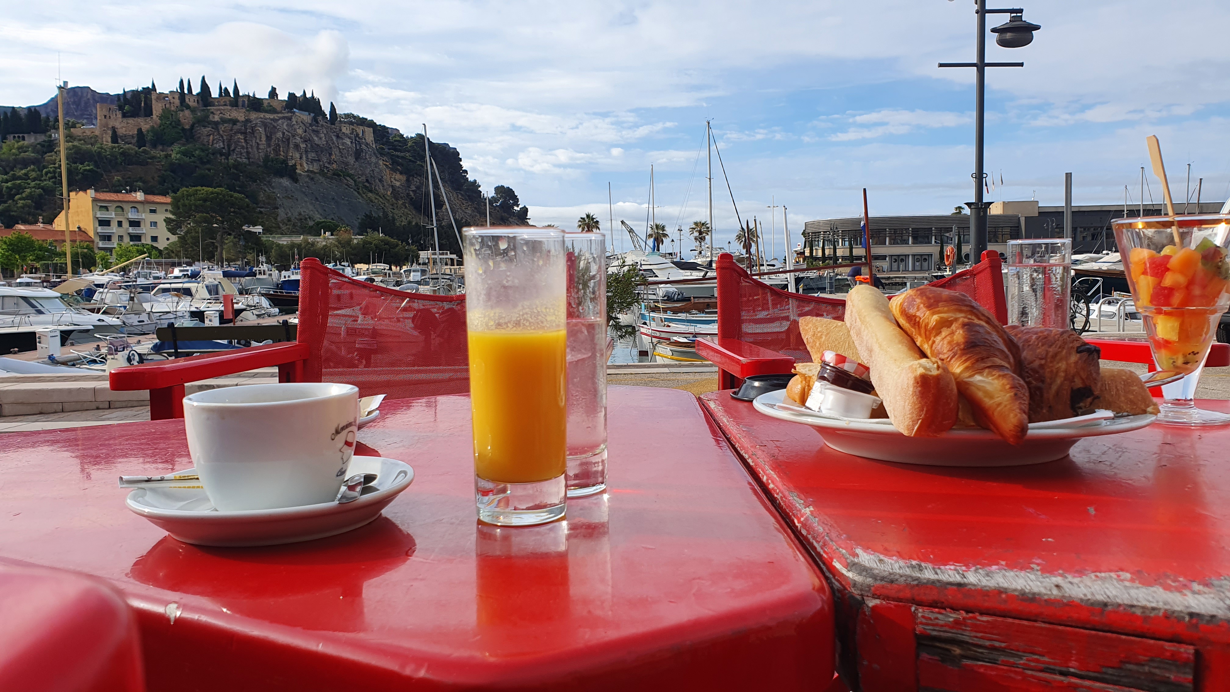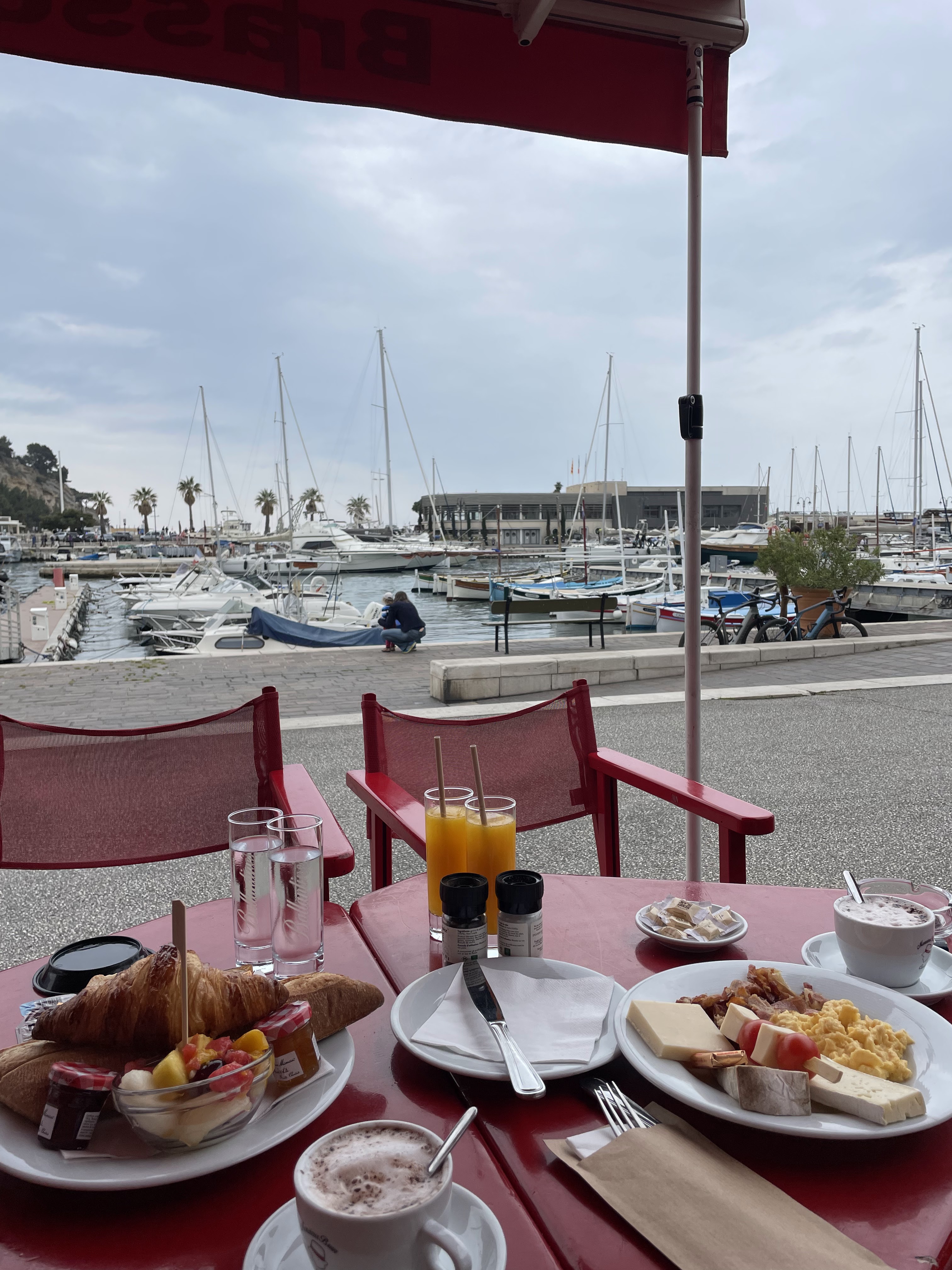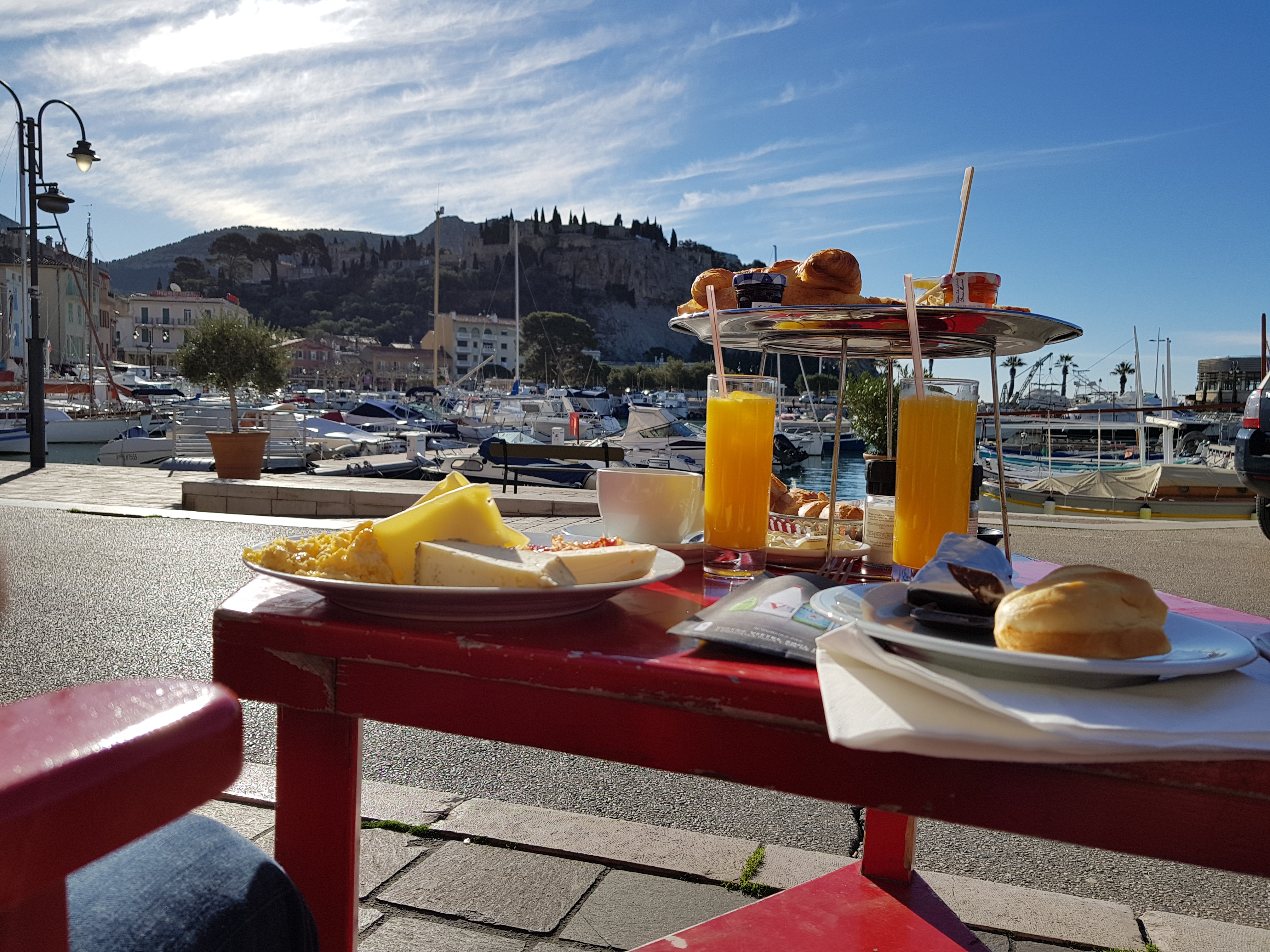 Petit déjeuner trop bon et très copieux face au magnifique port de Cassis