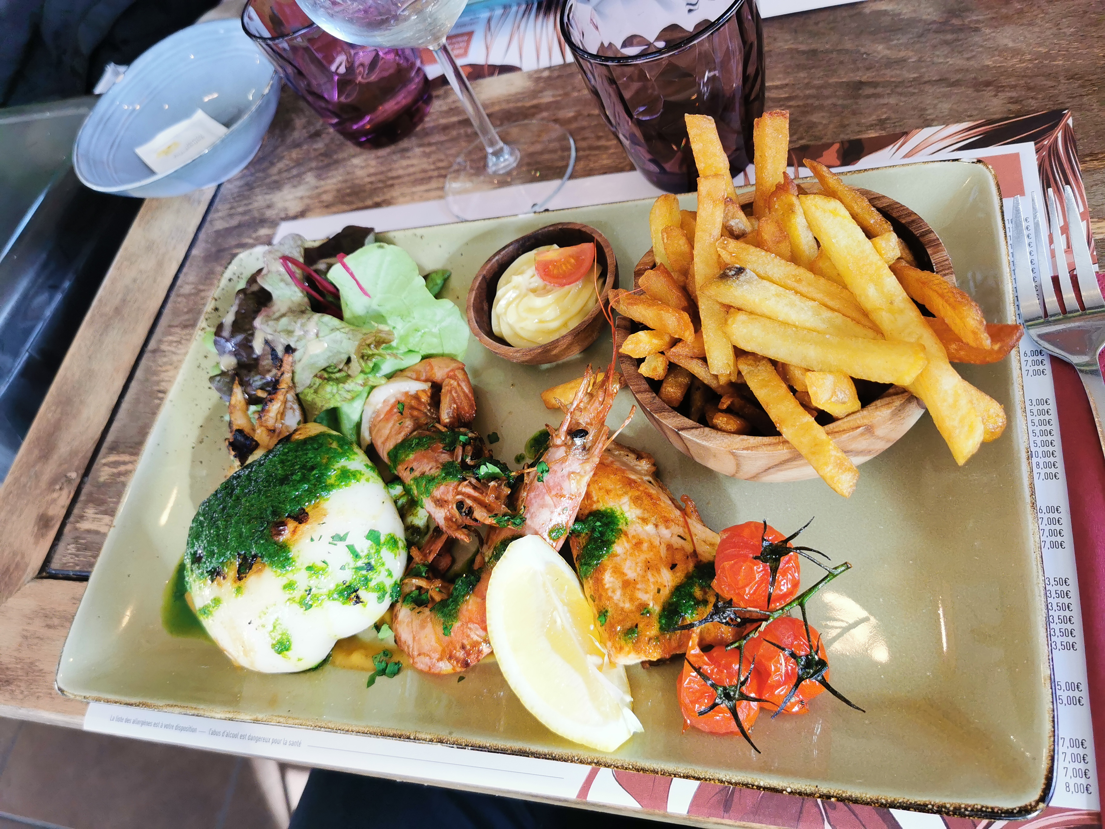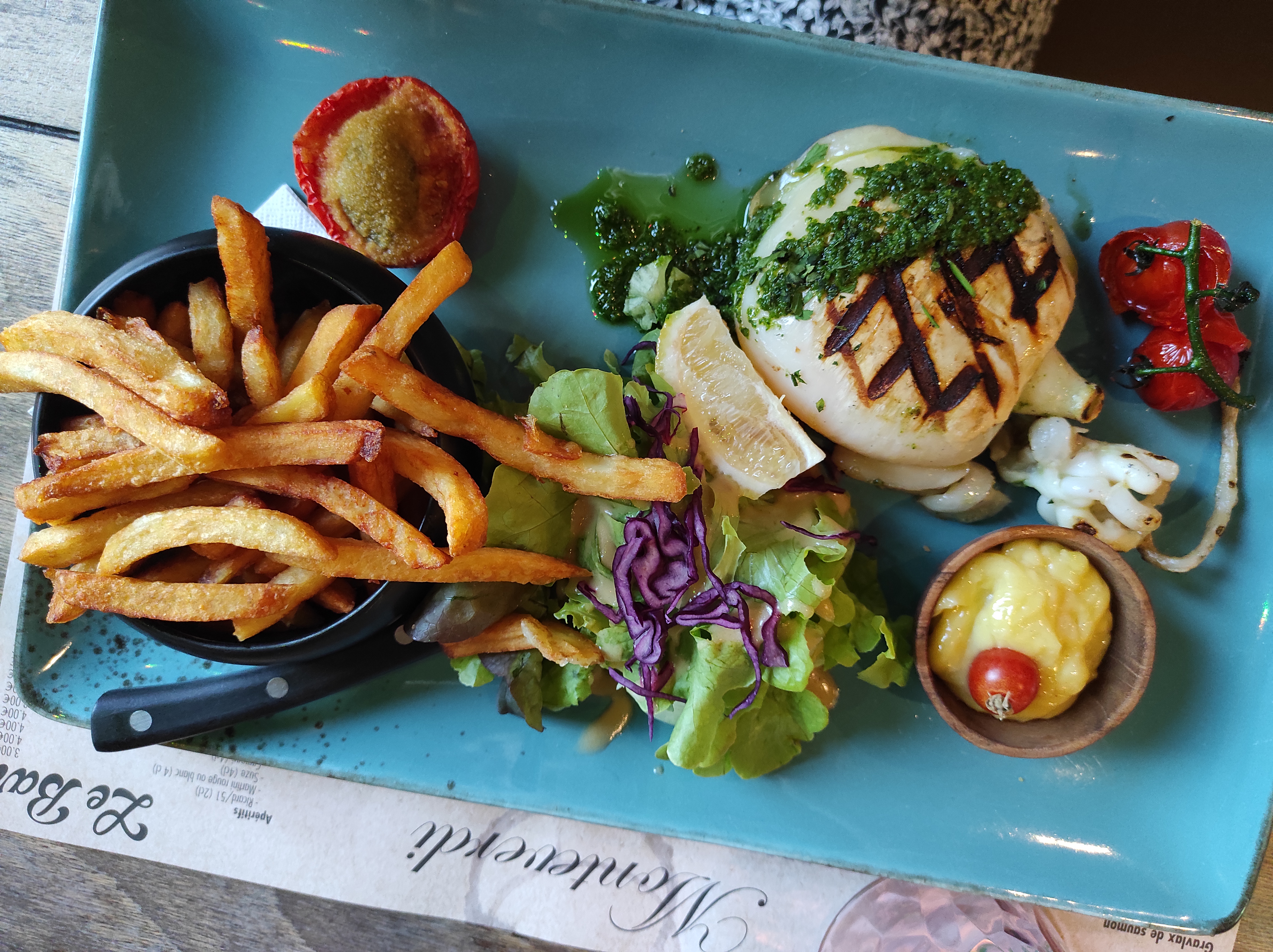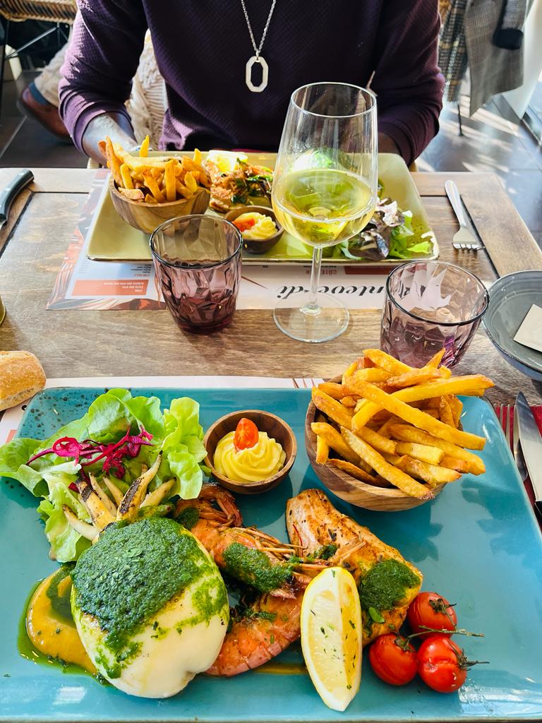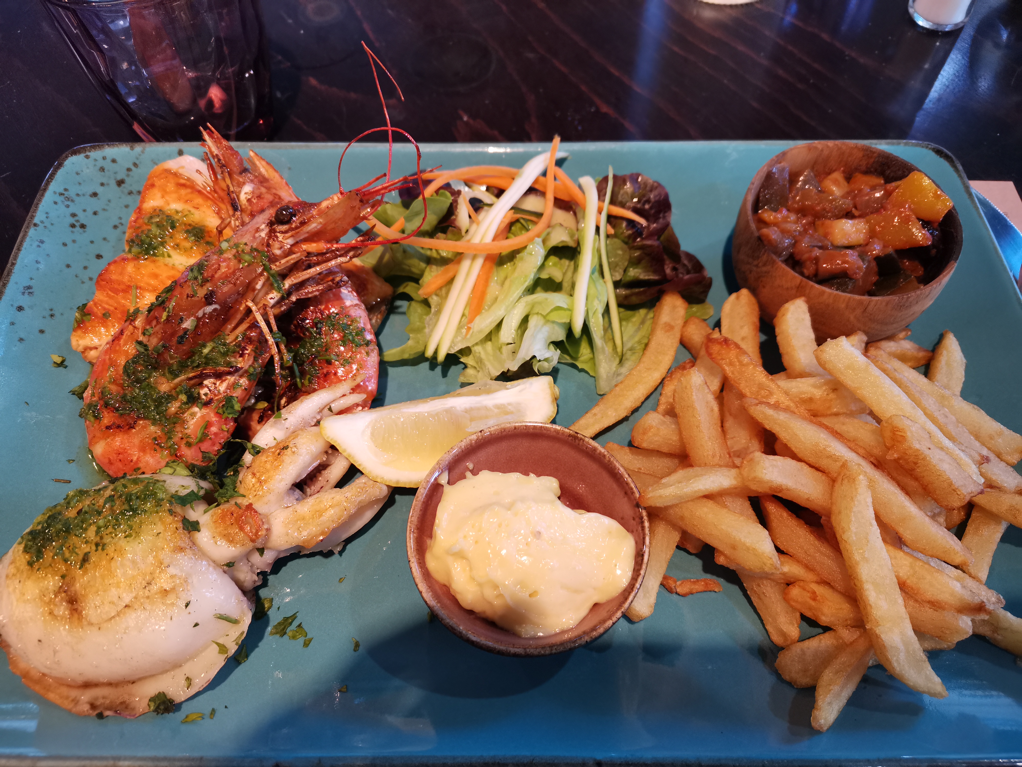 Une brasserie très chaleureuse, une carte assez complète, en passant par la salade césar très copieuse, le hamburger poulet très bon….un côté mer diversifié : saumon, seiches, gambas….côté terre, brochettes….. Un bon vin en accompagnement… Une déco qui sort de l’ordinaire mais très conviviale…. A recommander 👍