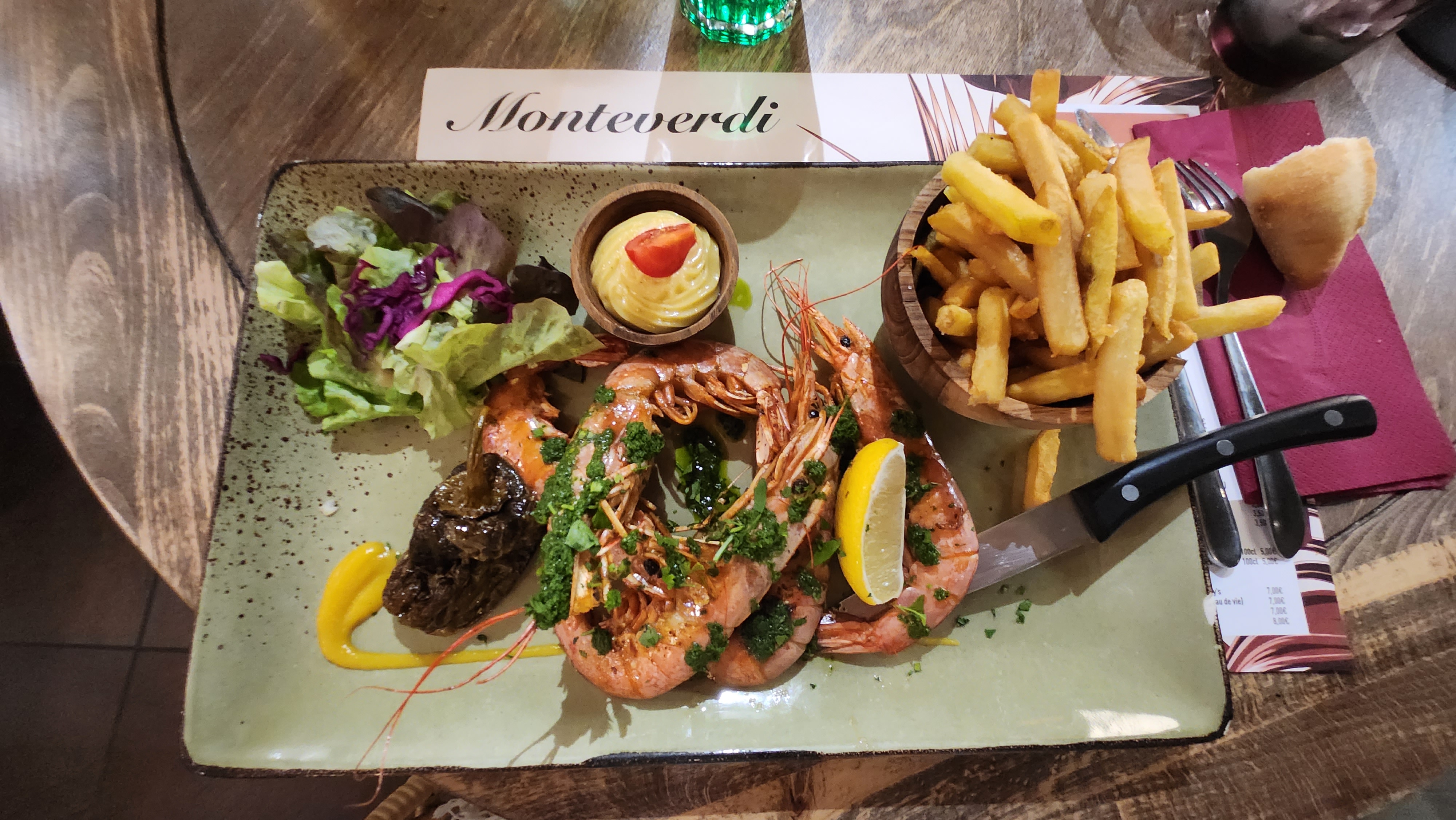 Un restaurant fantastique avec des sièges à l'extérieur et beaucoup d'espace à l'intérieur si vous préférez. Nous avons pris deux excellents repas ici pendant nos deux semaines de vacances près d'Orange et nous les avons appréciés tous les deux, l'entrée d'escargots était délicieuse. les hamburgers sont très bons et énormes, essayez le pavé du saumon avec du riz c'est superbe. Propriétaire et serveuse très sympathiques et le service est génial, tout comme la nourriture, essayez également une bière picon ici, c'est une façon très française d'ajouter du picon à une bière qui la transforme en quelque chose de merveilleux. essayez-la, vous allez l'adorer chez Monteverdi 👍