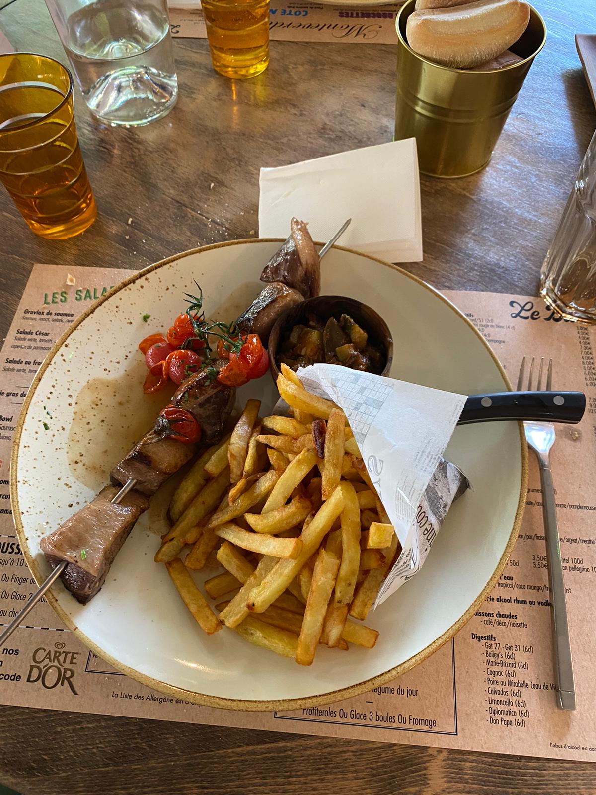 Délicieuses frites faites maison ! Avec carpaccio tout aussi bon. Une île flottante à tomber par terre ! Personnels très souriants