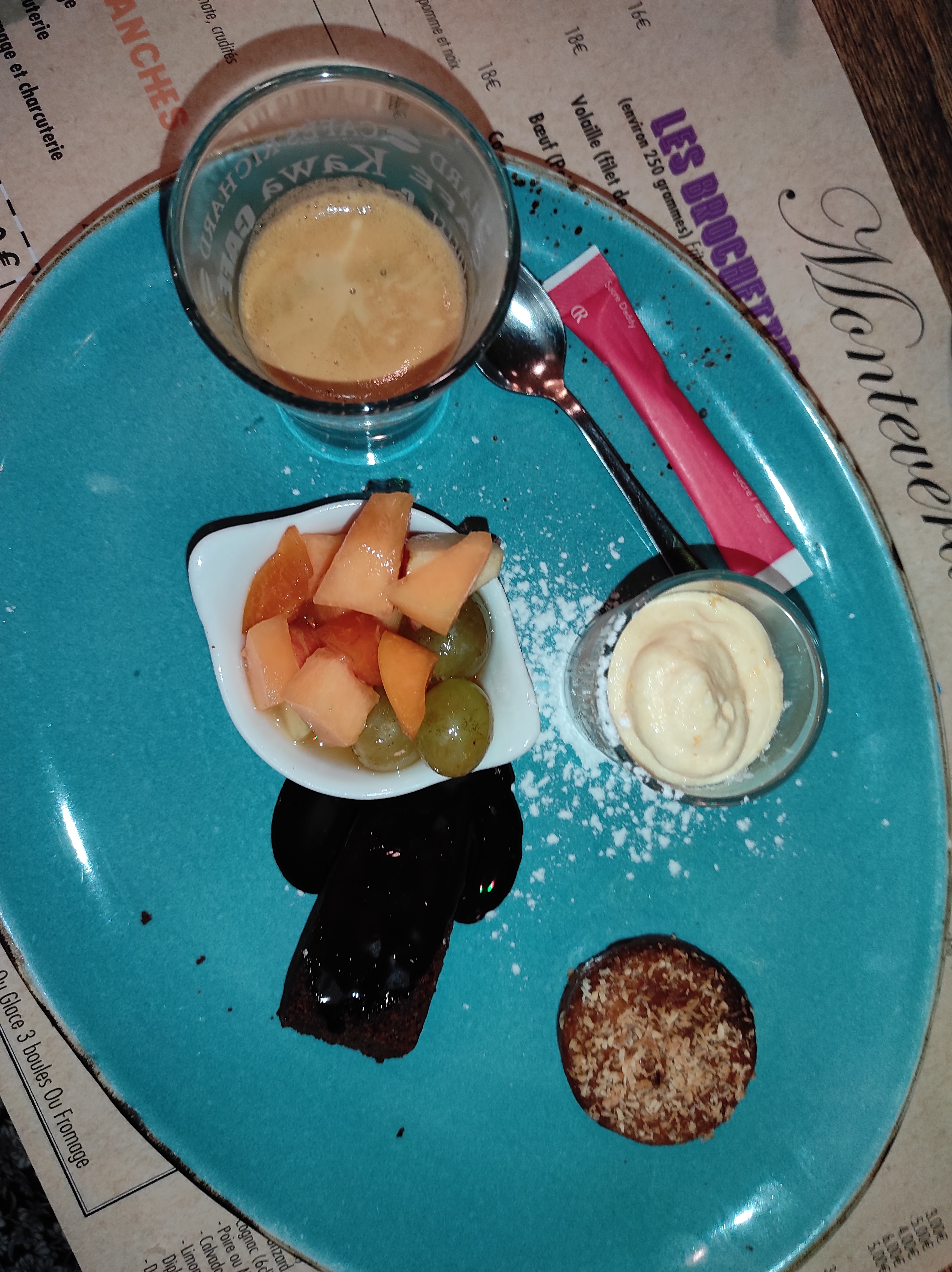 Pas terrible.... camembert rôti sec manque de salade, pain très basique pas terrible pour accompagner ce plat. Moelleux au caramel congelé et réchauffé au micro ondes et donc caoutchouc et sec.... Bon on n'y retournera pas.... tant pis
