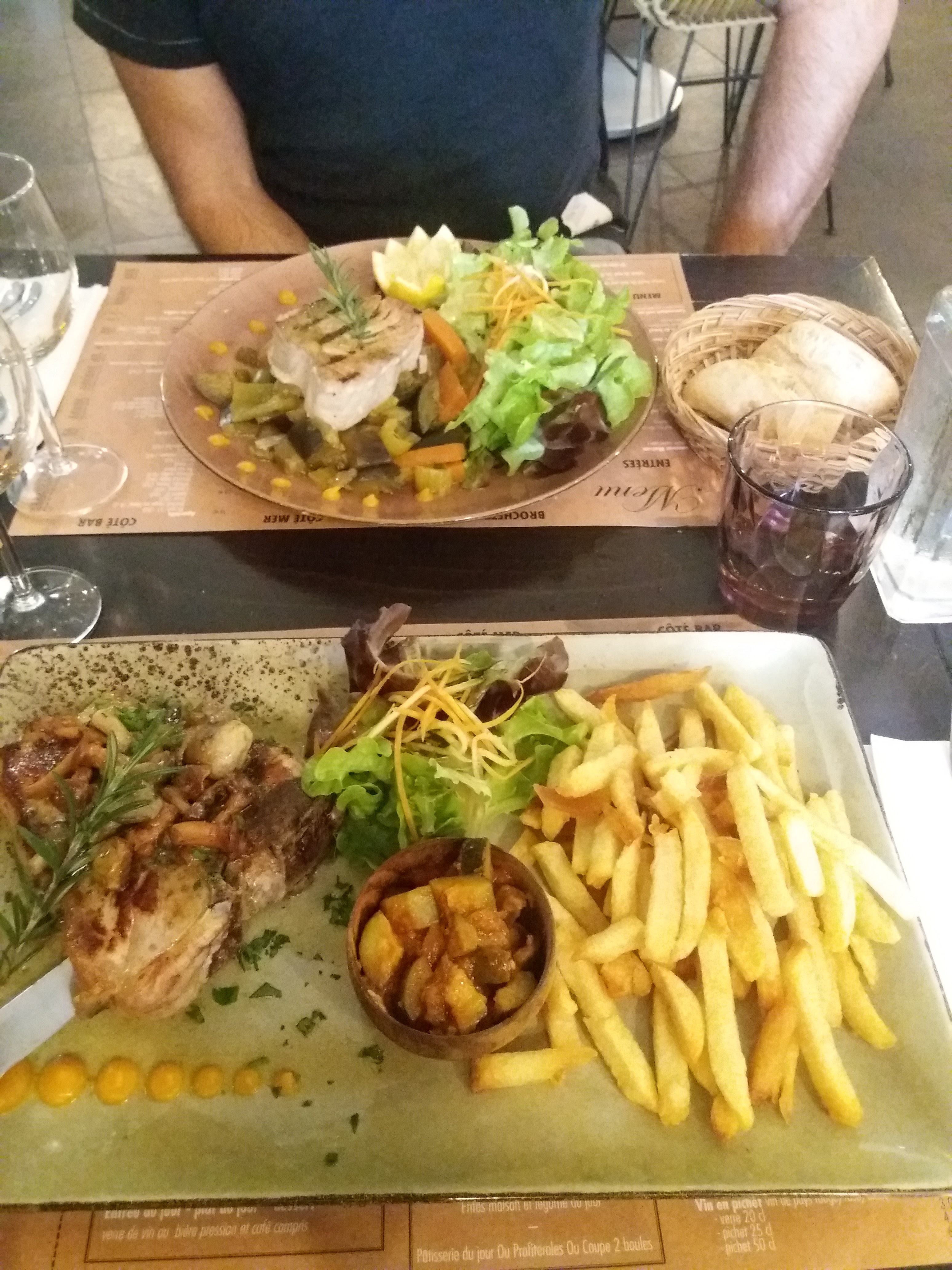 Un pavé de saumon avec courgettes, sauce tartare, riz basmati. Cadre moderne et très bon service. Le magret et les frites de mon ami très bien aussi avec des prix très intéressants. Les desserts ne sont pas maison mais très bons.