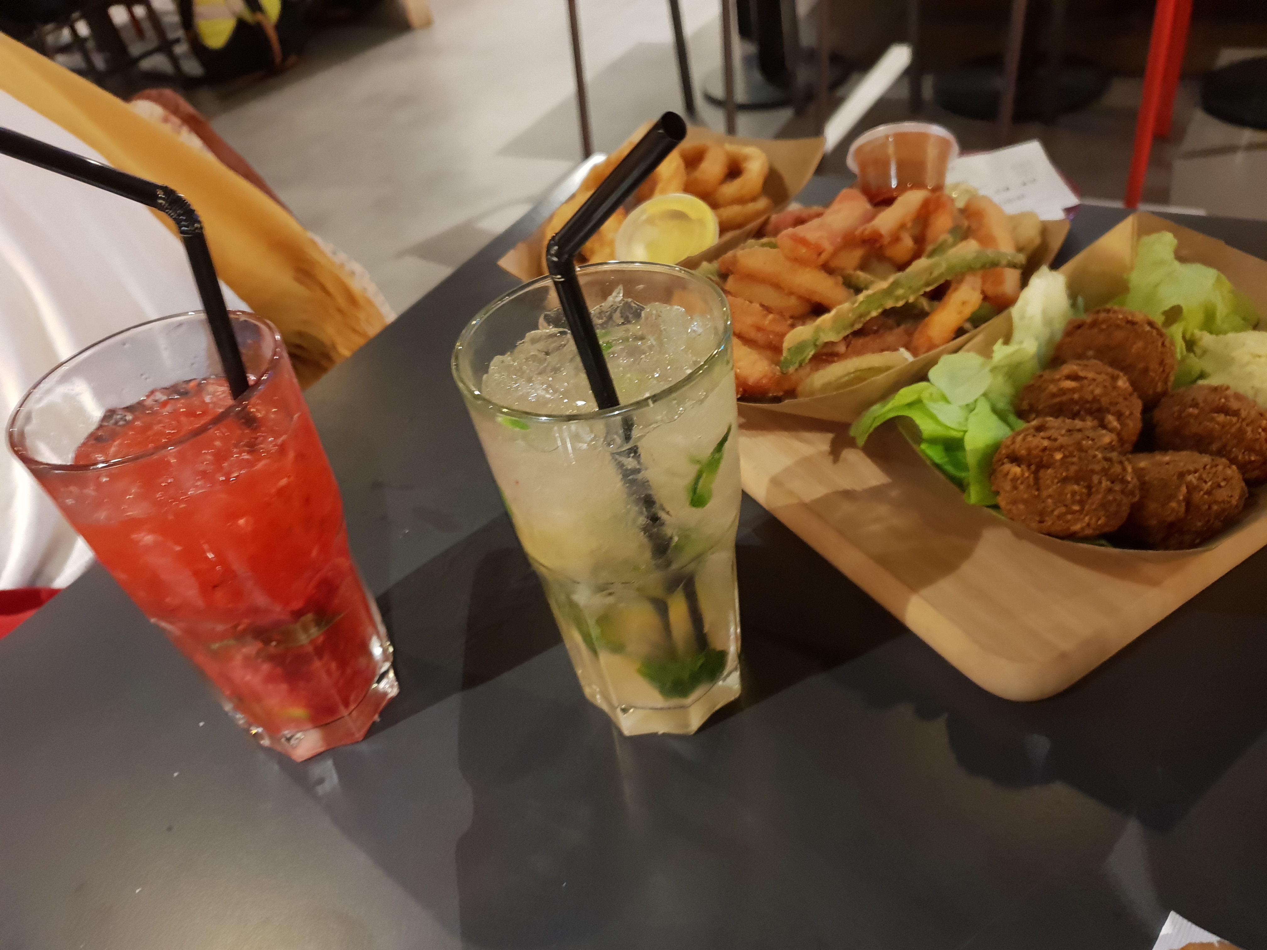 Les serveurs et l'accueille sont super. Nous avons choisi de grignoter des beignets de calamars (Très bon), tampoura de légumes (Très bon ), falafel avec un très movais houmous. Les portions son très généreuse , les serveurs au top, mais les cocktails( virgine morito) manques cruellement de sucre . Allez y a 2 ou à 10 C très simpat