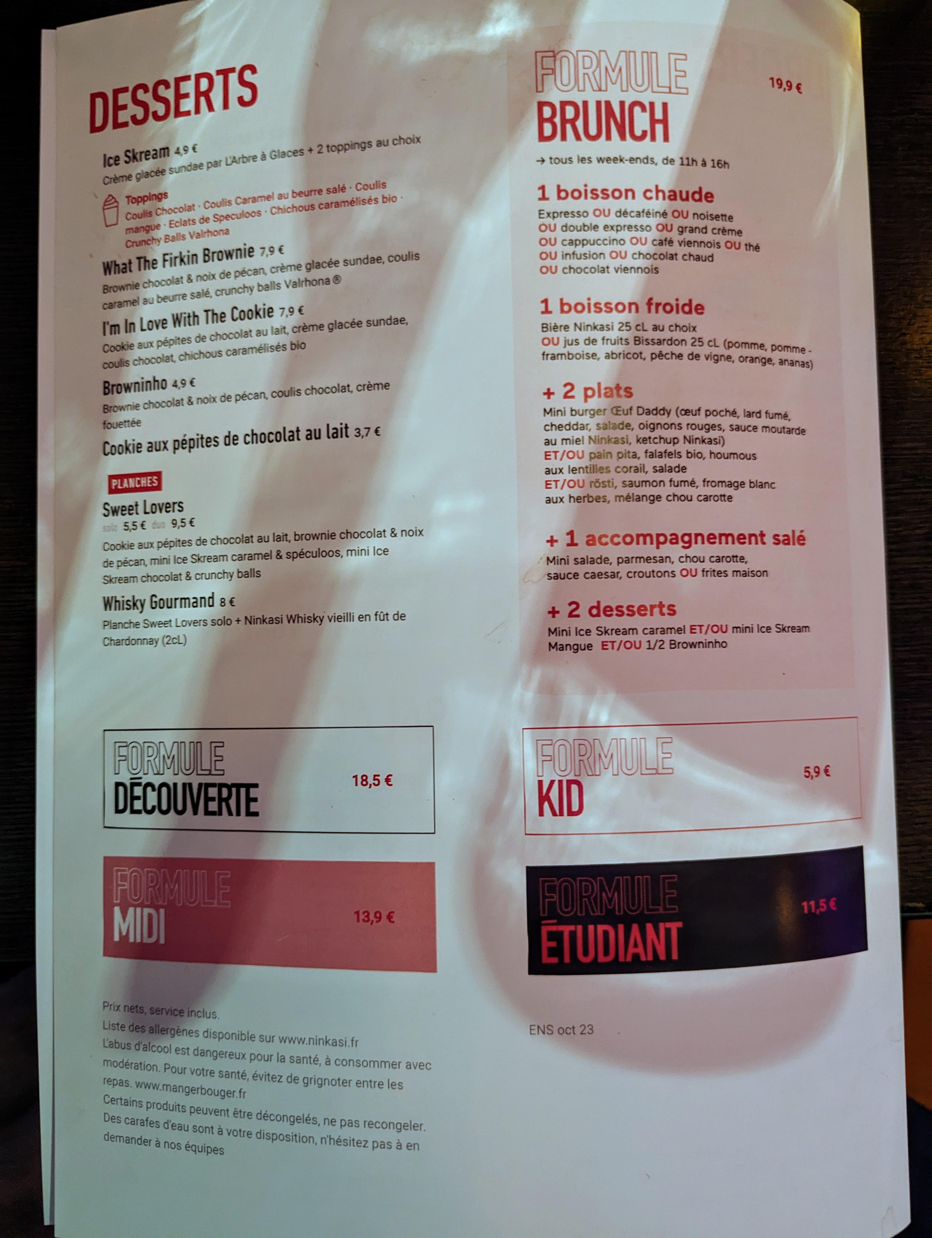 Nous avons mangé samedi soir au ninkasi . Absolument rien à dire sur la nourriture c'était bon . Mais nous avons été refroidi lorsque la serveuse est venue nous dire je vous encaisse on ferme , et elle avait l'appareil à carte avec elle, pour vraiment nous dire de partir. Au lieu de venir 10min avant en nous disant nous allons fermer, et nous laisser le temps de finir notre dessert . Ce n'est pas commerçant, ni professionnel Vous avez peut-être une heure de fermeture mais il y a la façon de le dire . Nous ne reviendrons pas .