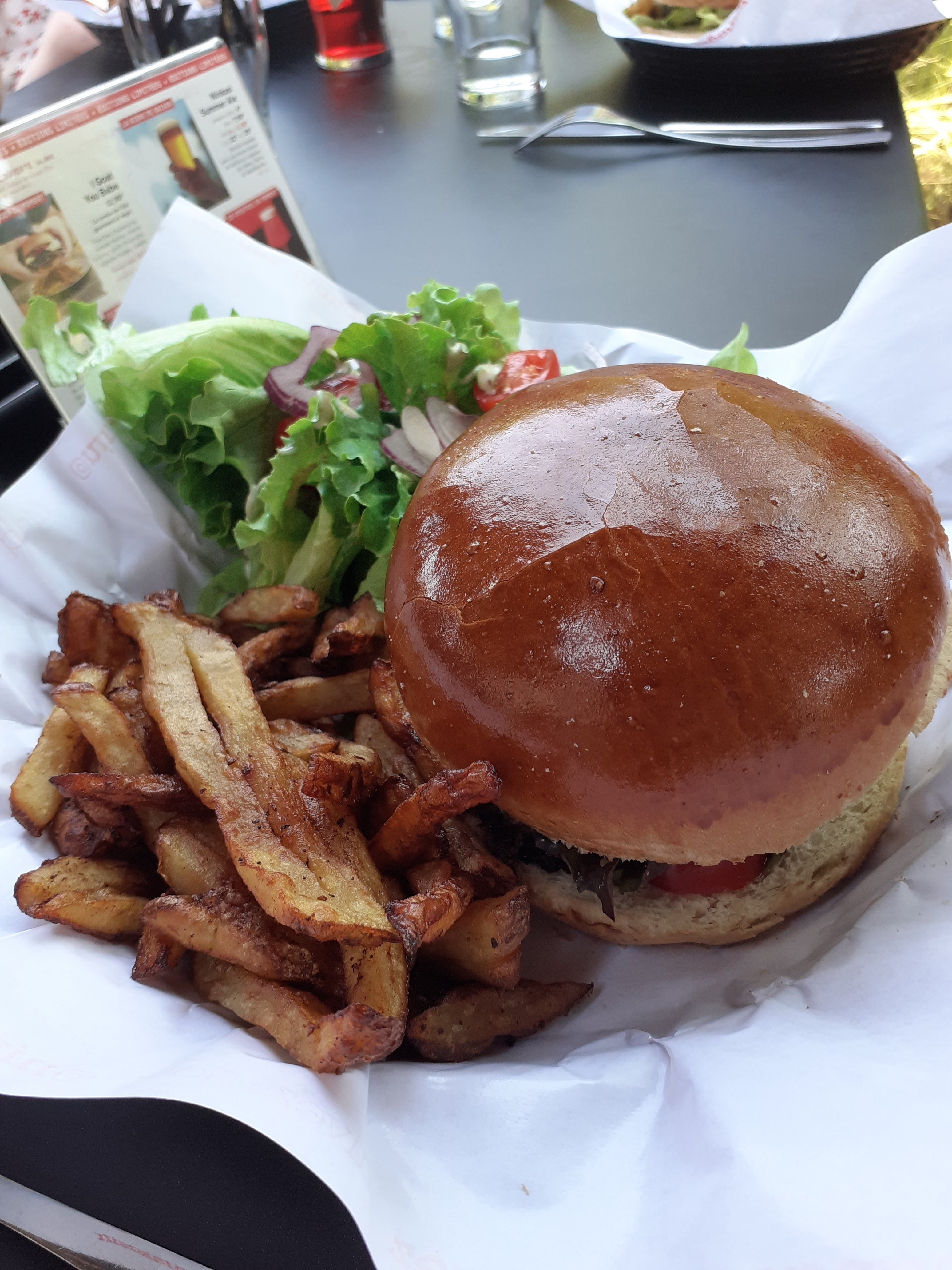 Repas Burger avec frites bien moyenne en cuisson .mais ambiance et bières excellente