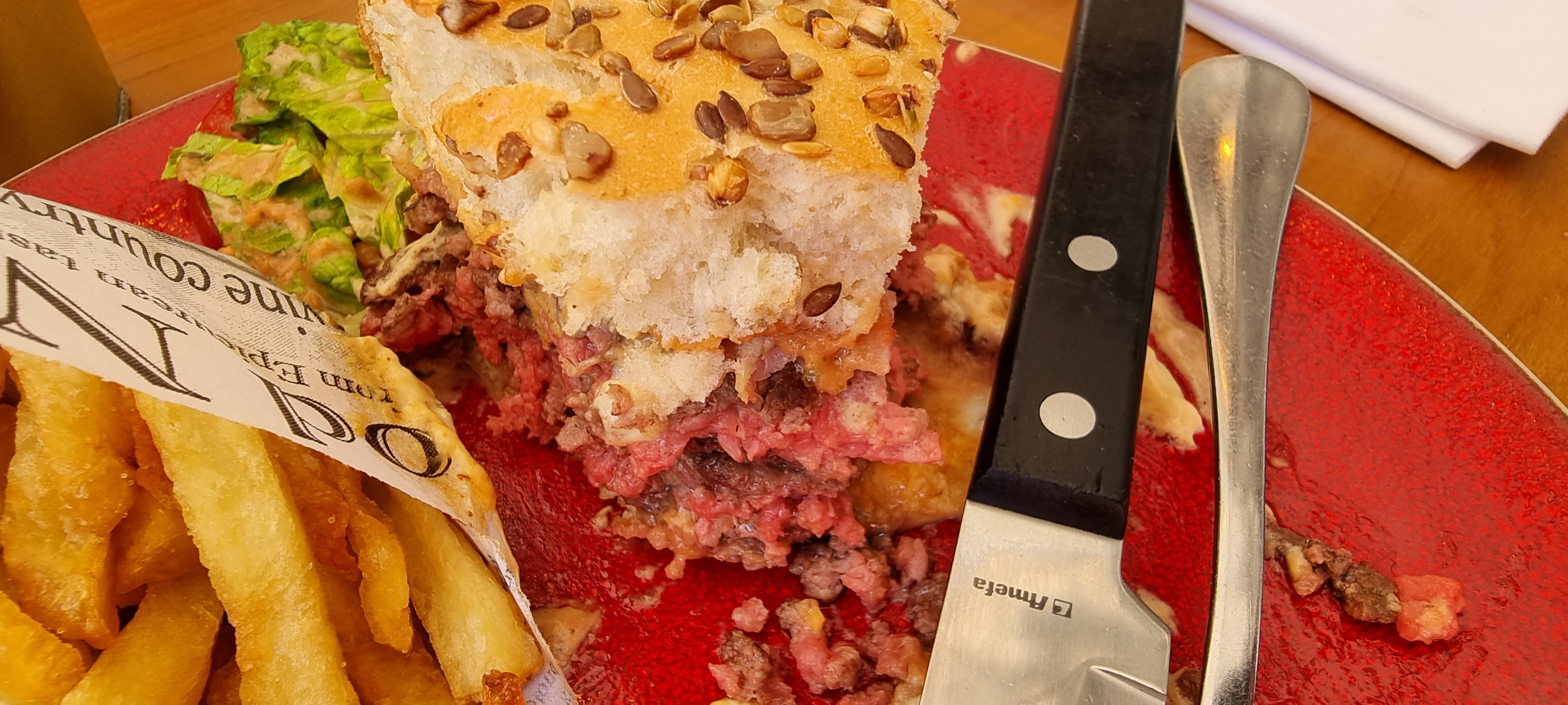Nous avons été très déçus. Même si je l'ai commandé bien fait, ce n'est pas possible. Surtout pas à vingt euros pour un burger avec des frites faites avec des restes et parfois frites deux fois. Le barman était sympathique mais cela n'a pas aidé les choses.