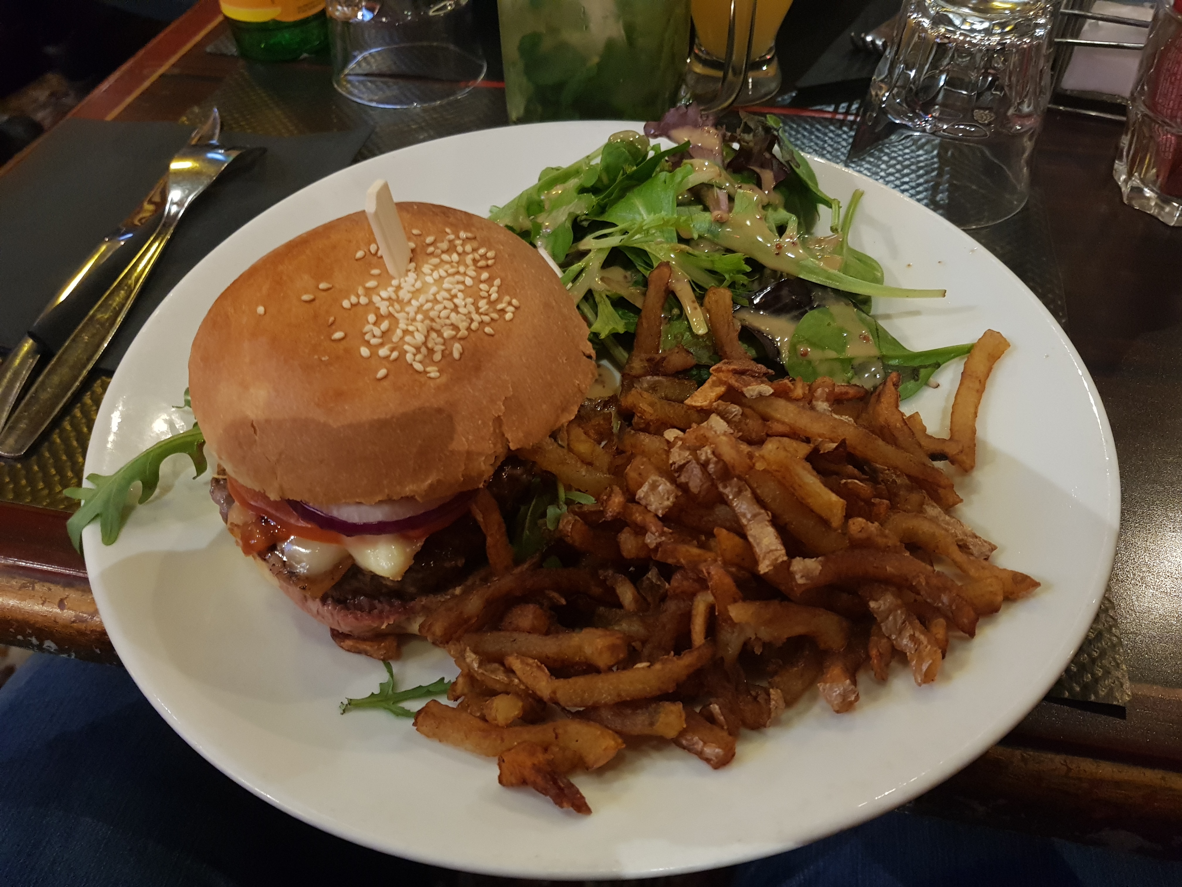Repas standard, produits vraisemblablement surgelés et peu travaillés. Service long, hygiène à revoir. Peut convenir pour boire un verre mais pas plus