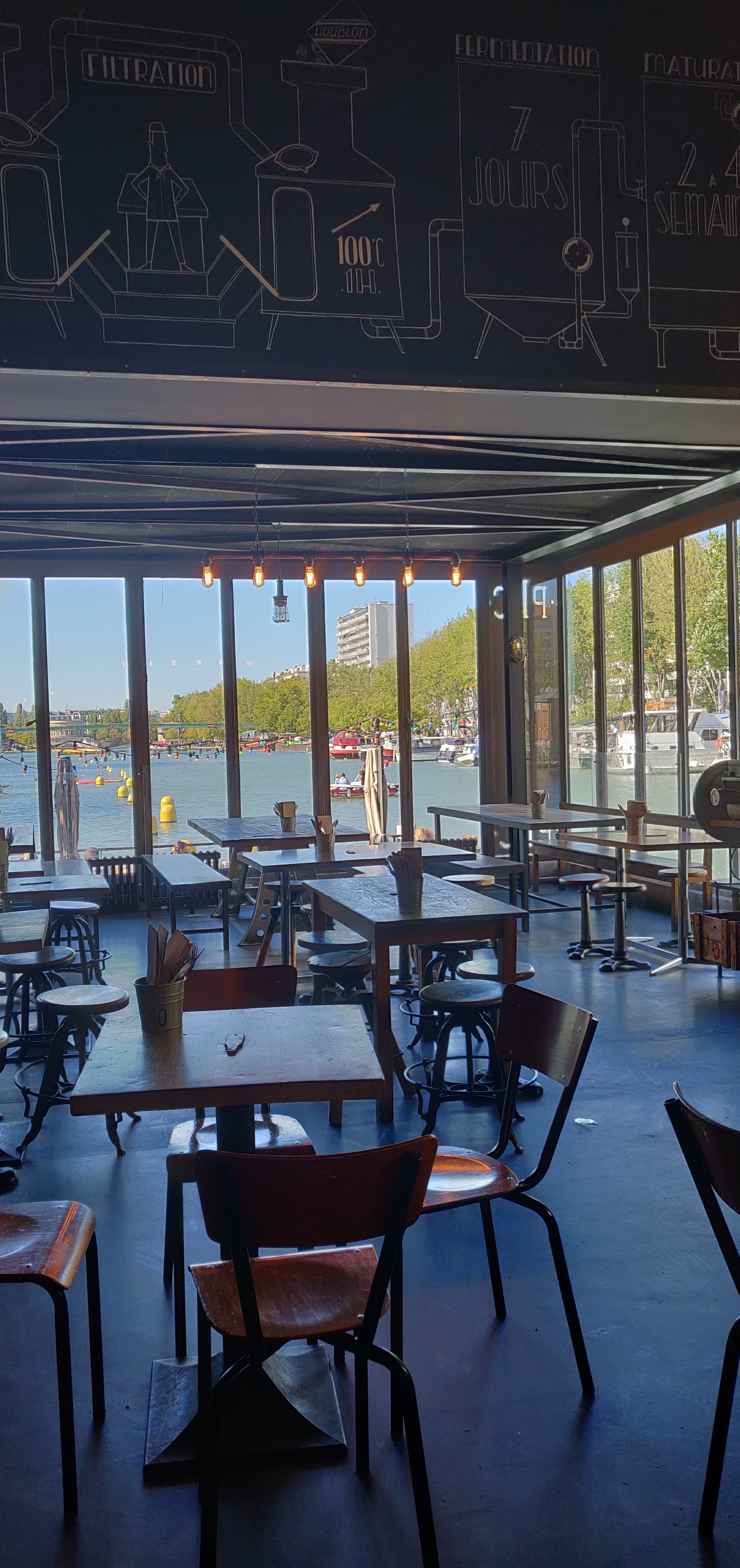 Cadre très sympa sur les bords du canal de l'Ourcq. Les bières brassées sur place exclusivement servies au Brewpub sont assez originales.