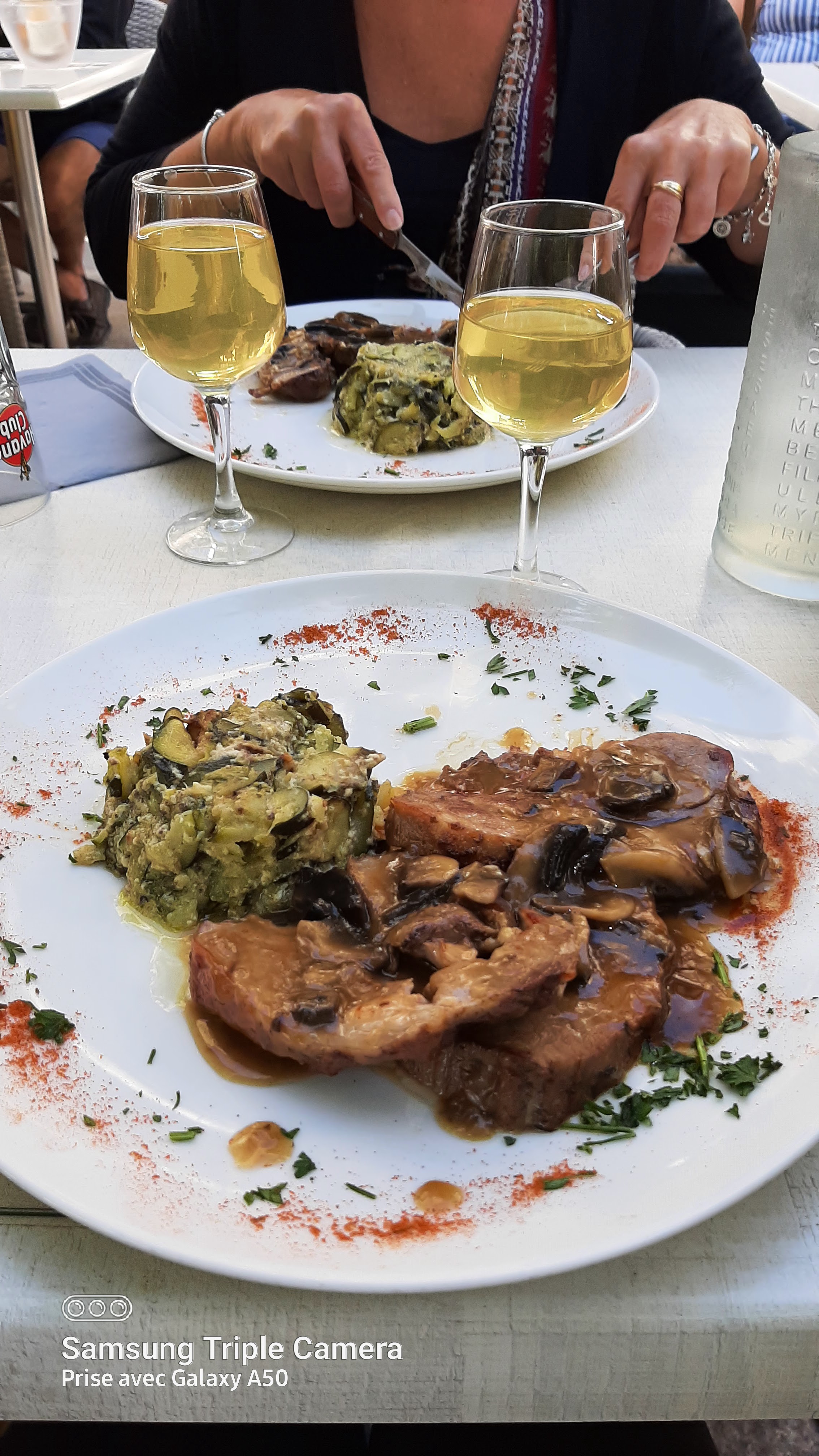 Plat du jour: Tripette de veau à la Sartenaise... A tomber...!! Escalope de veau à la forestière, pareil !! Que des bons produits et une cuisine excellente...! Incontournable, sur la place de Sartène...