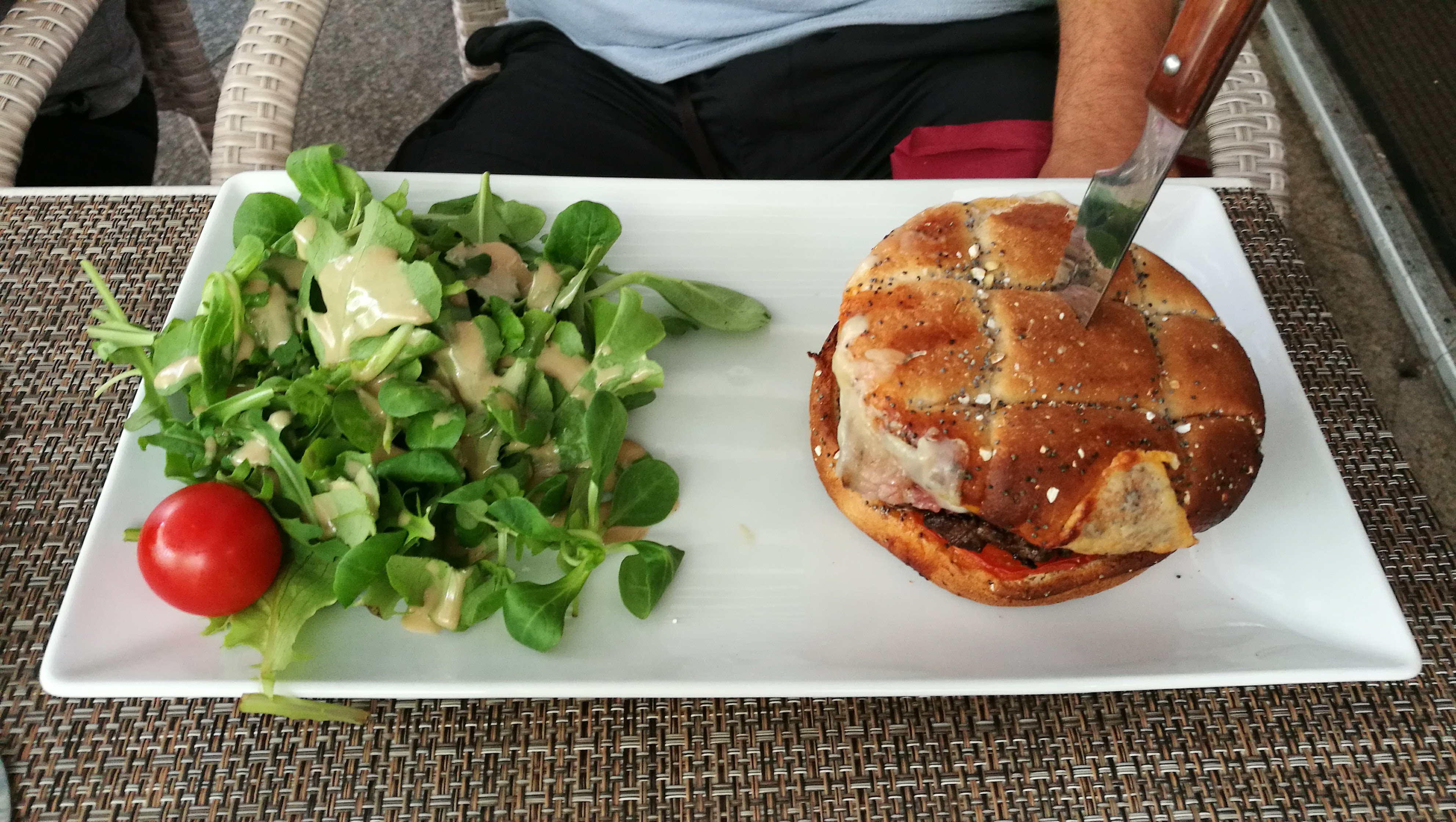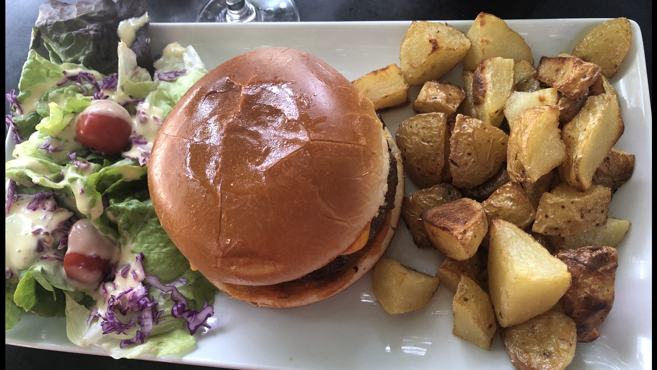 Pomme de terre maison un peu grasses avec un cheese burger bof. Très bonne salade. Rapport qualité prix un peu cher!
