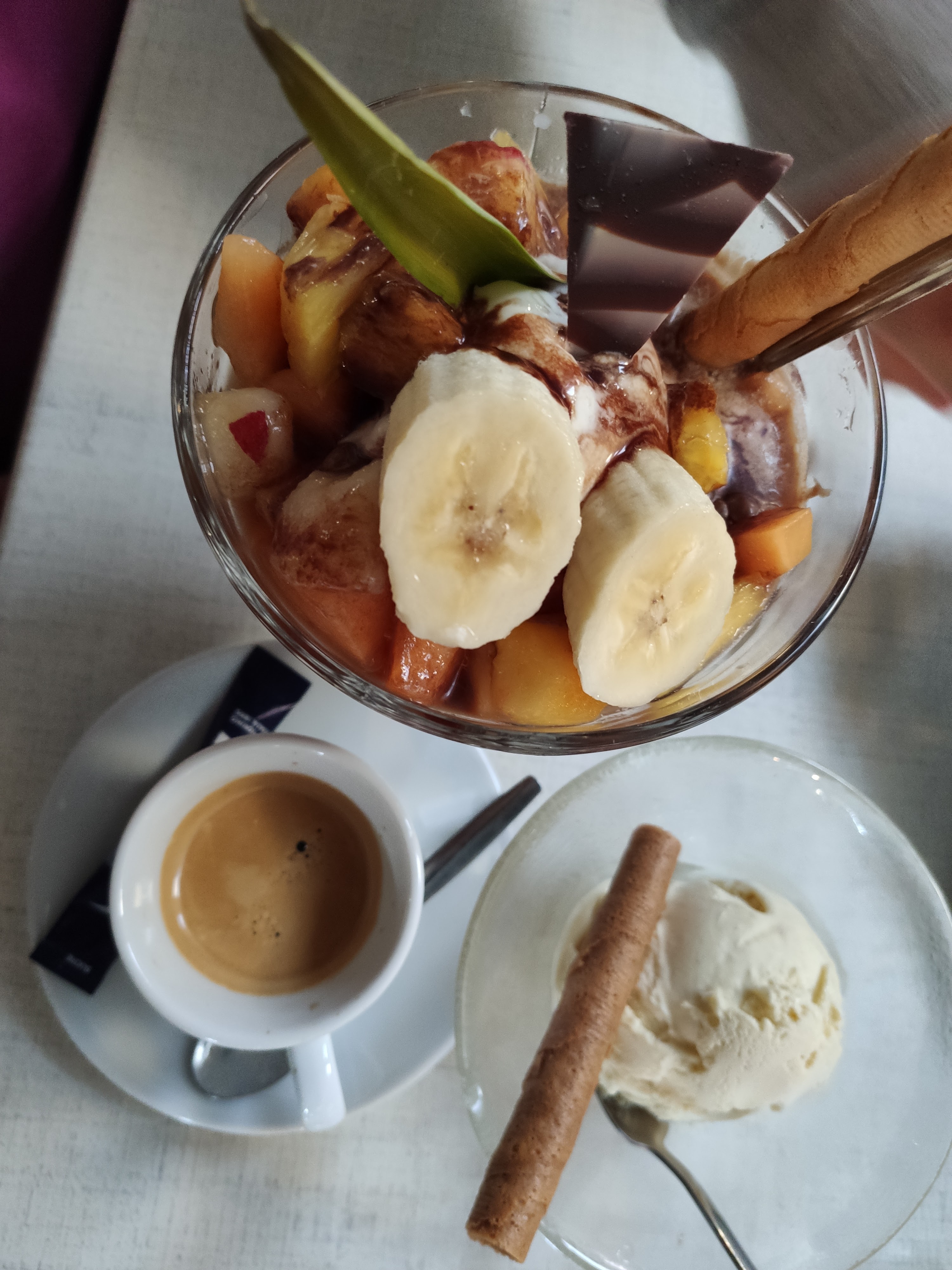 Nous avons bien mangé. Petit bémol sur le service, j'ai demandé une place au soleil, et au bout de quelques temps le soleil tapait tellement que mon fils ne se sentait pas bien. Je me suis excusée et ai demandé s'il était possible de changer de place, on m'a effectivement trouvé une table à l'ombre et on m'a gentiment dit, vous déménagerez votre table vous-même. Et après avoir fait un concours pour savoir combien de temps j'allais tenir au soleil m'a t-on dit.... bref j'ai trouvé ce comportement quelque peu moyen.