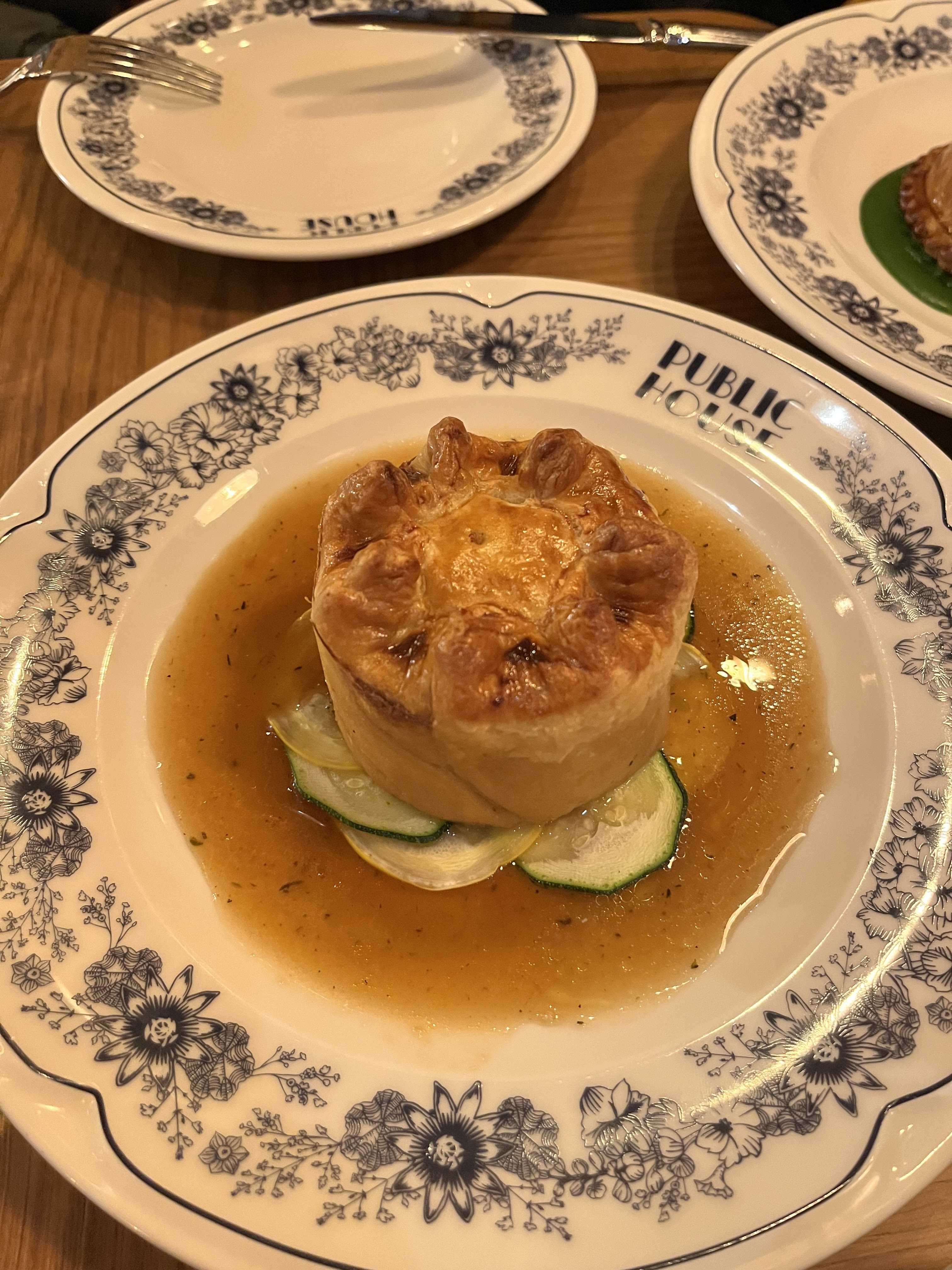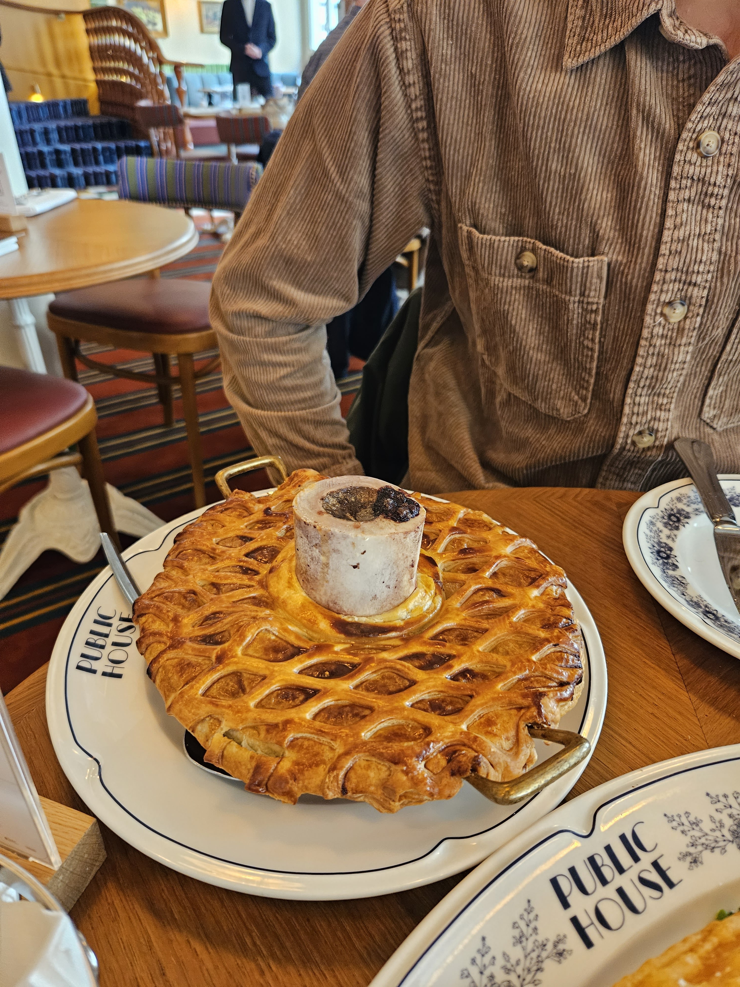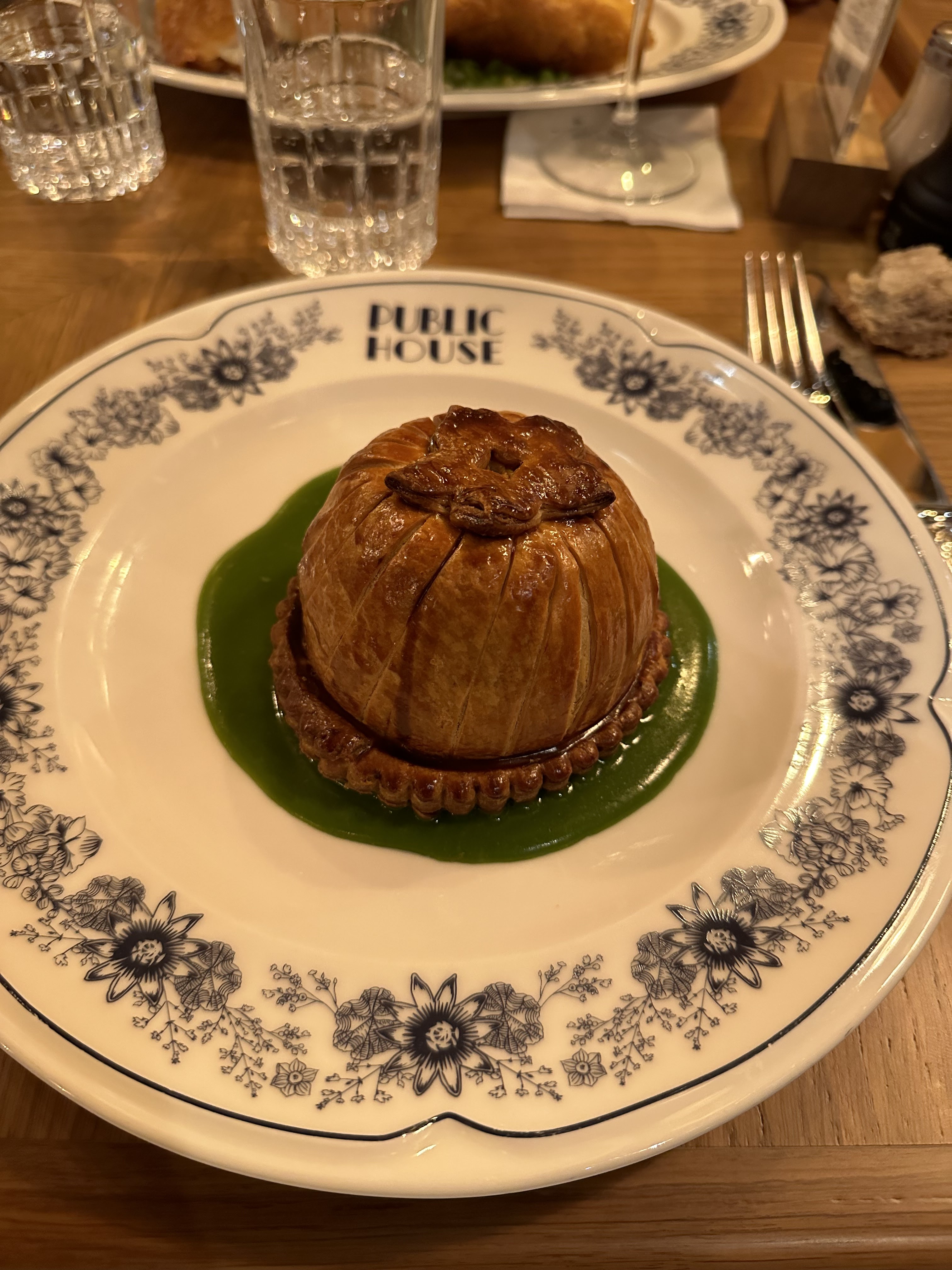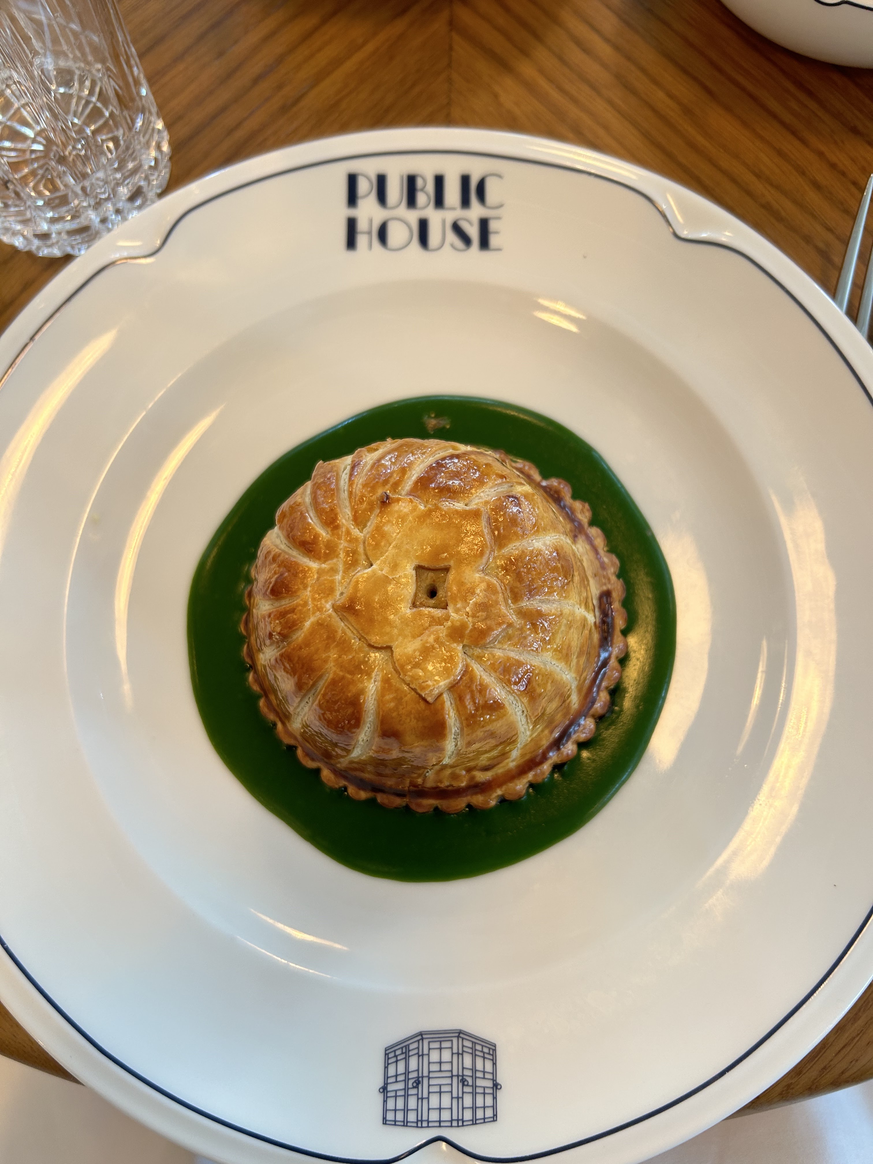 Public House est un joli lieu, avec une carte de la cuisine britannique authentique et de bonne qualité. Le copieux Beef Pie du chef, Calum Franklin (The Pie King), est incroyable avec son os à moëlle au milieu, et une délicieuse pâte. Nous avons beaucoup aimé les desserts : la Crème brulée au chocolat et le Trifle à la pomme et gingembre. Pour boire, une flûte de vin effervescent anglais (Gusbourne 2018), rare de trouver même en Angleterre. L'attente pour les desserts et la salle un peu bruyante ne m'empêcheront pas de mettre 5 étoiles. Notre serveuse, Hélène, était charmante et professionelle. J'ai déjà ma réservation pour demain soir !