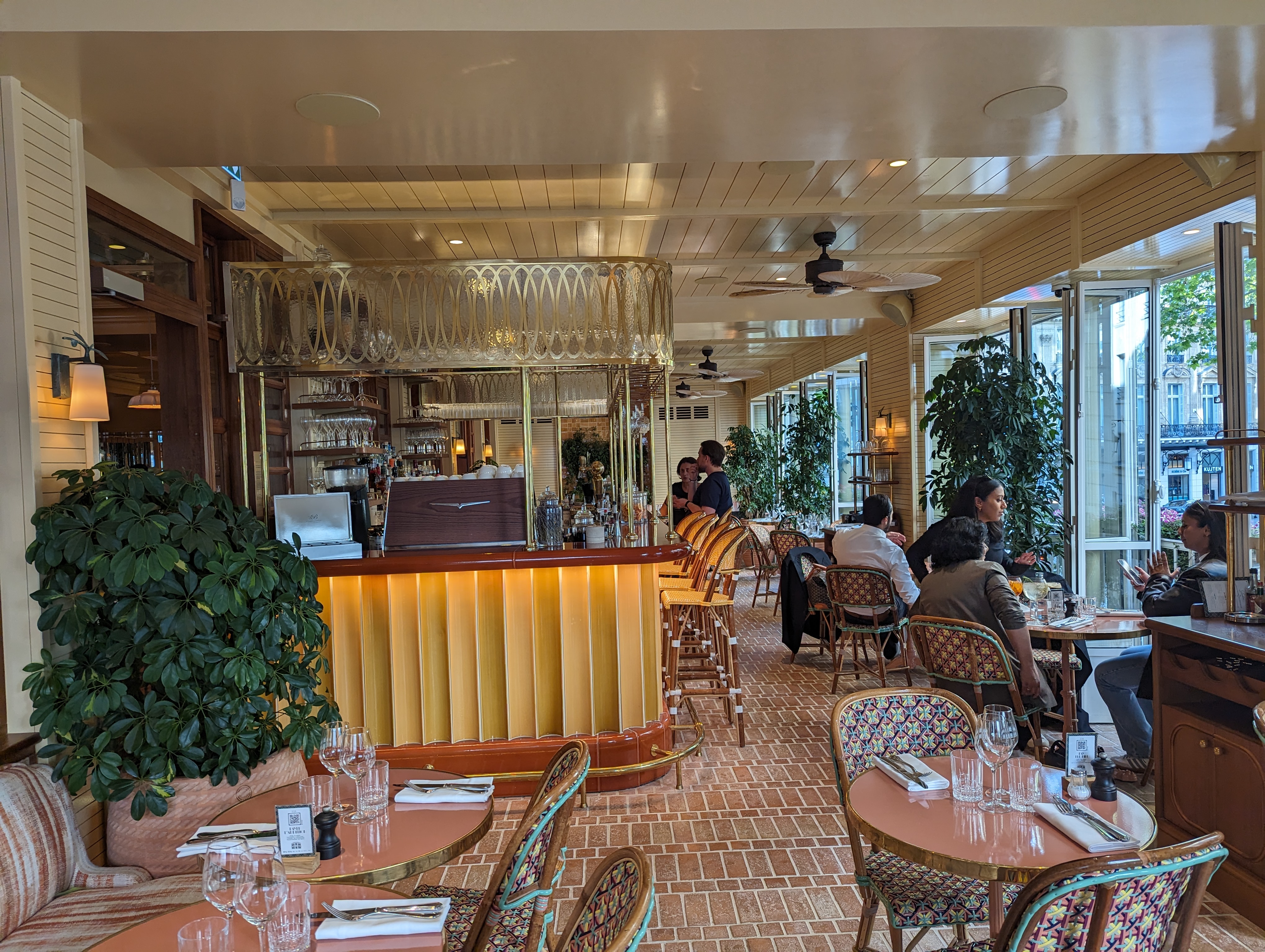 2ème venue dans ce belle établissement. L’épaisse moquette, les imprimés des banquettes et chaises, le bar monumental, nous dépaysent le temps d’un rapide déjeuner. Pour mon menu : un burger bon, juste et bien « comme il faut » bref, un moment agréable pour couper une journée de travail. J’y reviendrai… notamment pr essayer le bar de l’étage façon « terrasse-loggia » avec ses grandes fenêtres ouvertes !