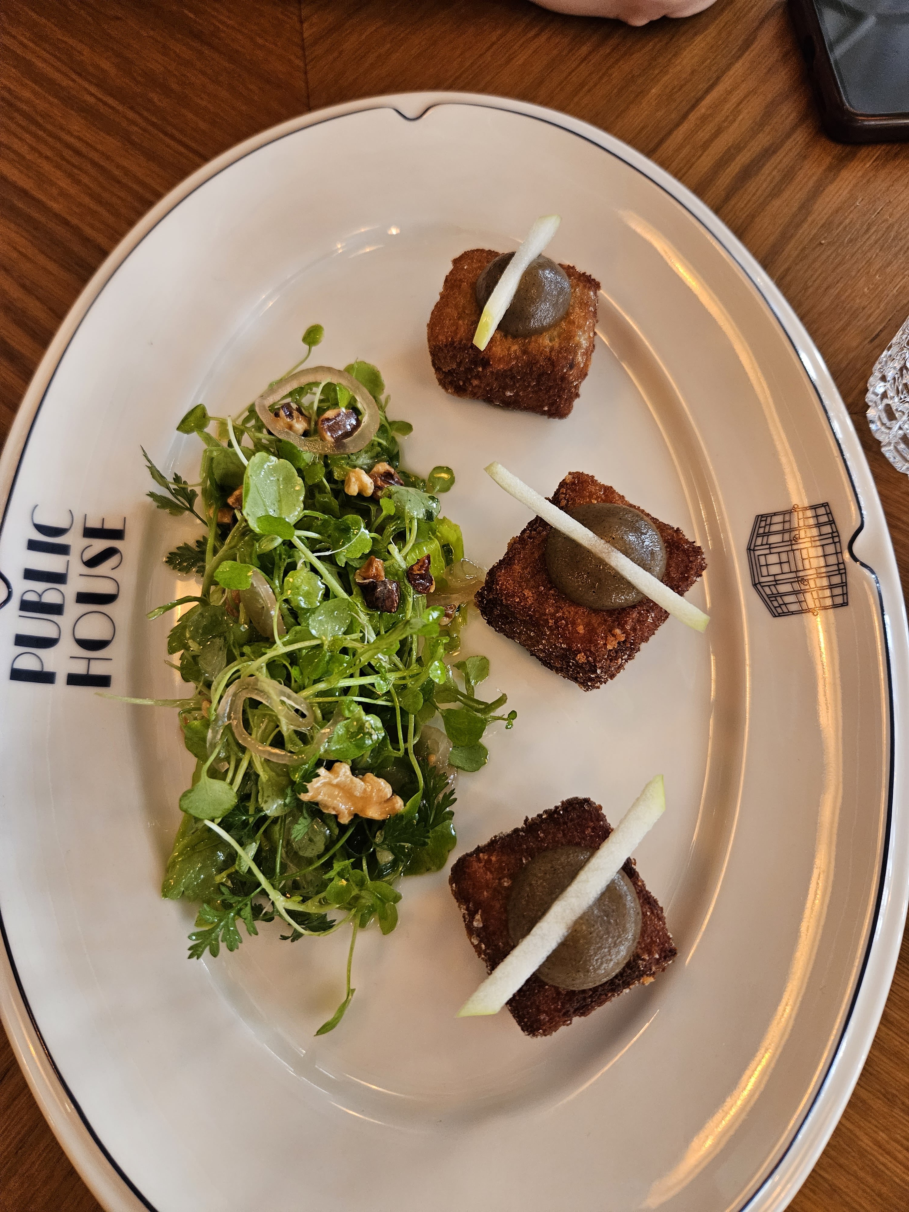 Premier dîner au Public House et j'ai été très satisfaite! La cuisine de Calum Franklin inspirée des pubs anglais était délicieuse, la carte des vins était parfaitement équilibrée entre vins français et étrangers provenant de domaines respectueux. Le service était très attentionnée et professionnelle, nous avons eu une excellente expérience grâce aux petites attentions de l’équipe. Je recommande vivement cet endroit pour des rendez-vous pro comme perso, c’est vraiment un lieu parfait pour profiter d'une excellente cuisine et d'un service de qualité dans ce quartier.