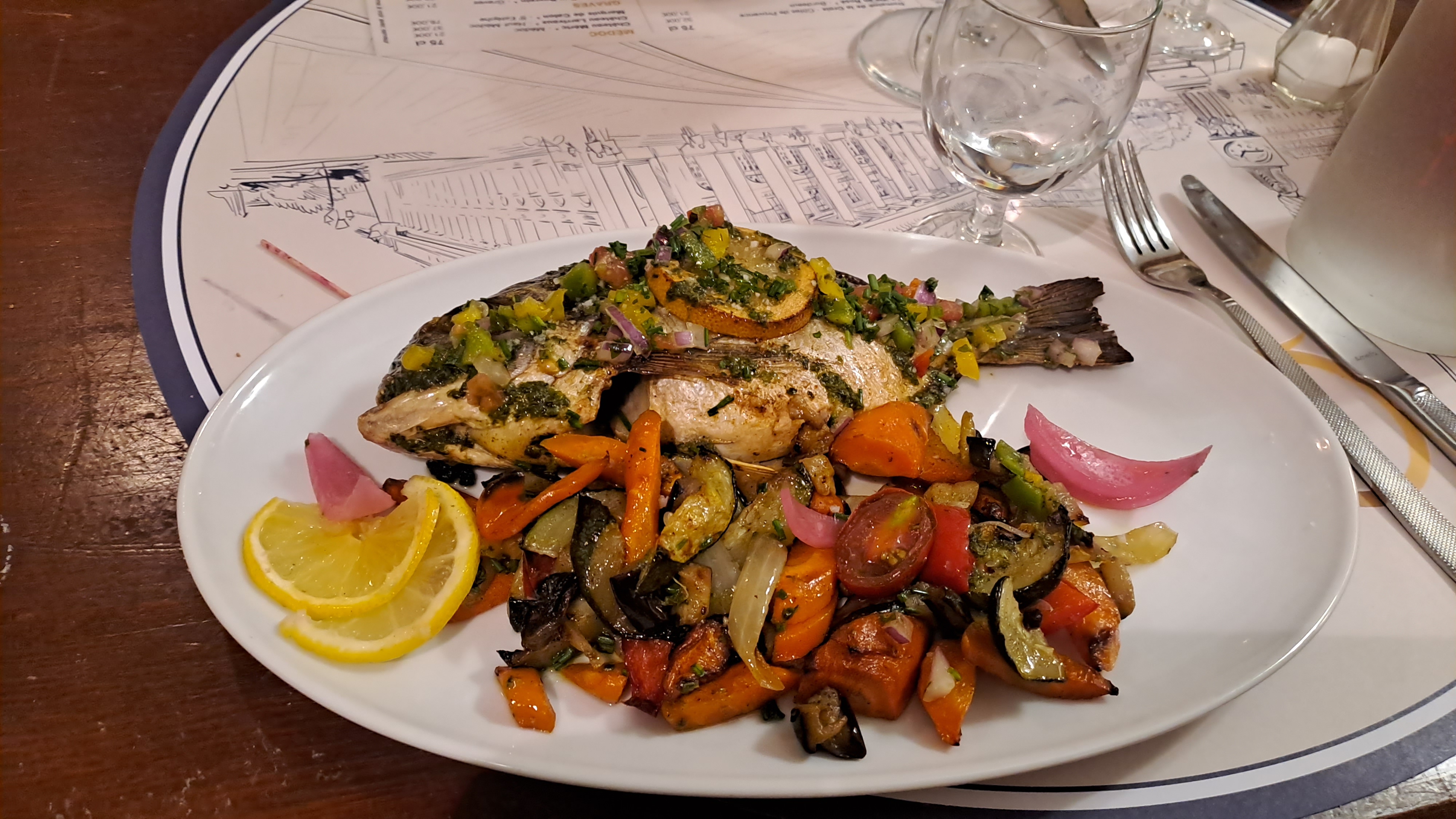 Ambiance sympa avec Bonne musique, service rapide, mon poisson légumes tb, pas le coup de bambou côté tarif, serveurs jovial , jolie déco intérieure.