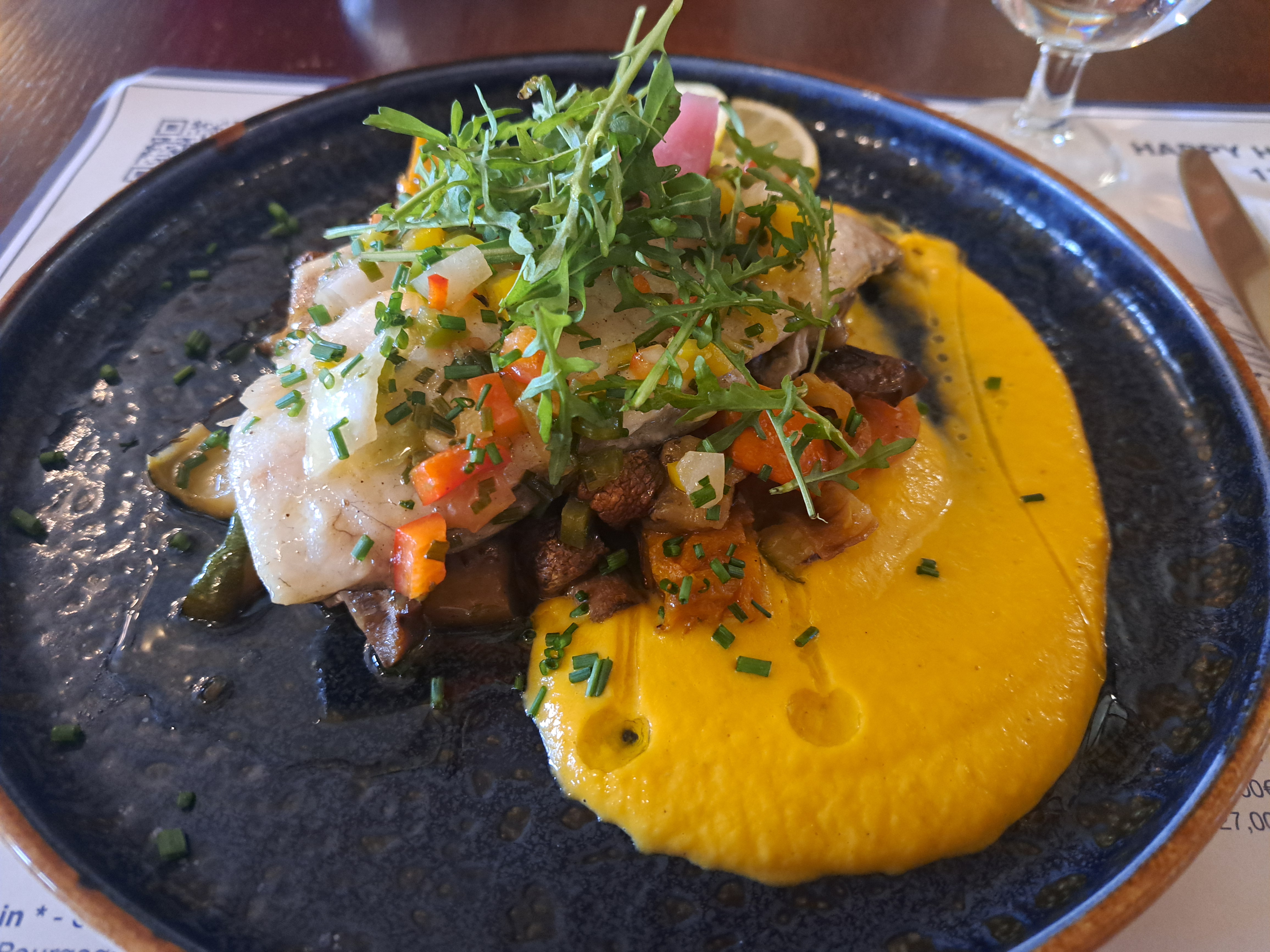 Dommage que le plat principal arrive a peine tiède et que l on soit obligé de le signaler. Un bel endroit mais faite attention aux marches dans cet établissement. Vous vous éviterez une chute et un genou douloureux le soir venu