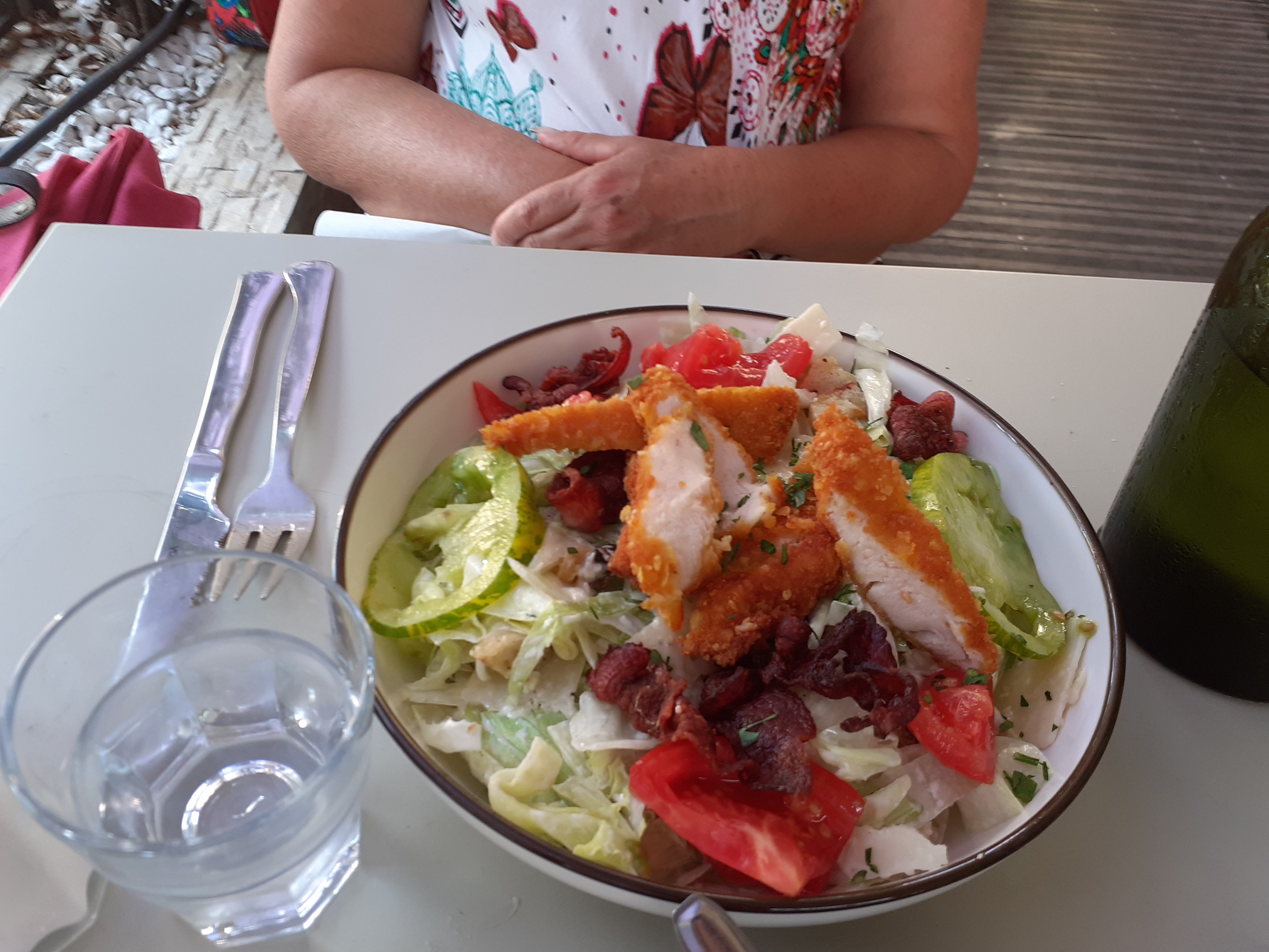 Restaurant agréable cuisine inégale Salade césar très aïllée Sauce vierge ,échalotes poivrons rouges,coriandre????? (Recette revisitée?????) Polpettes qui ressemblent beaucoup à un hamburger Assiette bien pleine Personnel prévenant Terrasse ensoleillée donnant sur la route Prix raisonnable