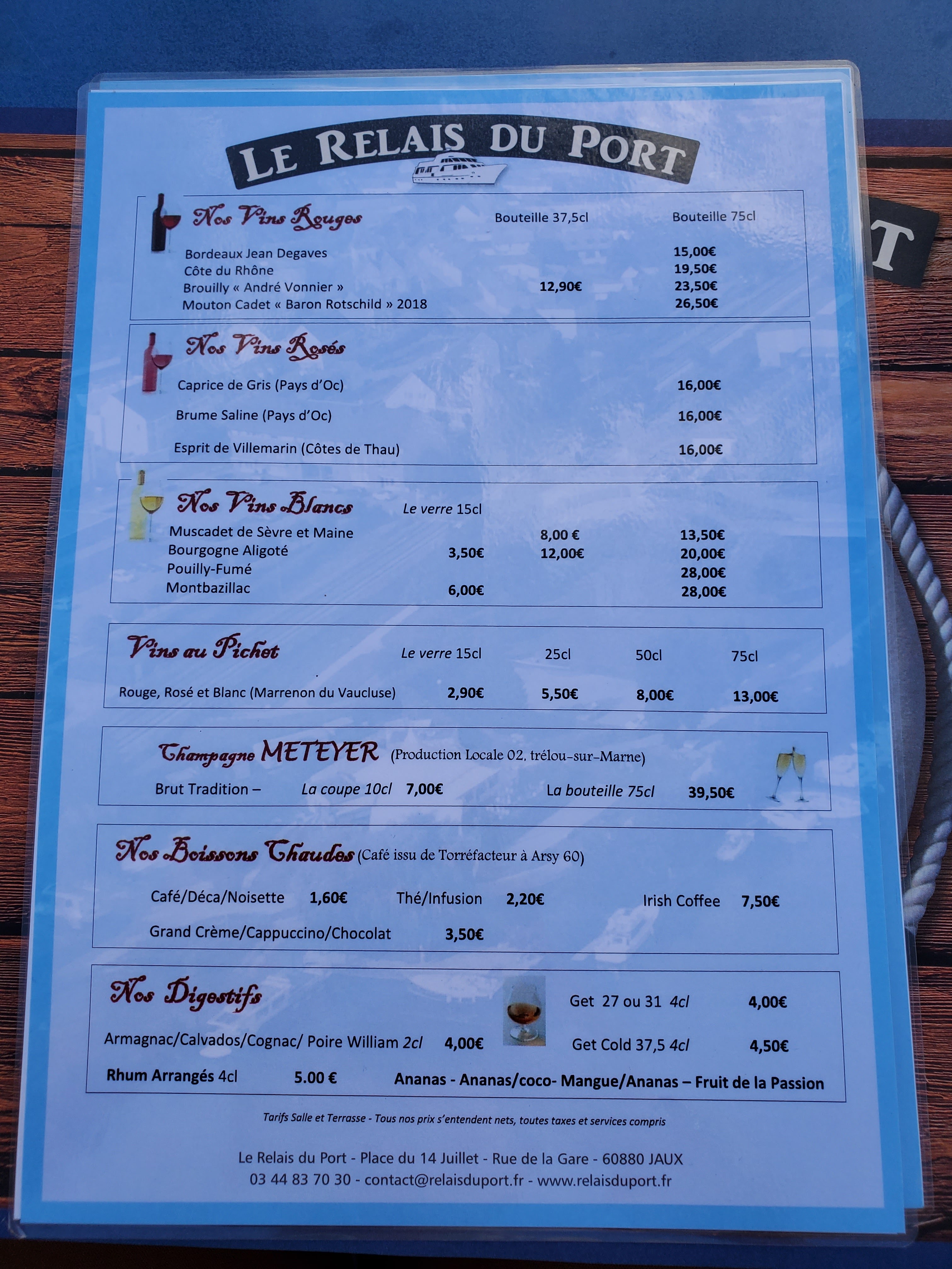 Le Relais du Port,c’est un lieu incontournable et incomparable sur la toute proche ville de Compiègne mais avec ce sentiment d’être dépaysé par le lieu atypique au bord de l’eau! Une cuisine très généreuse,une équipe aux petits soins des plus agréables et un Maître d’orchestre au top! Prix tout doux ,que du positif !
