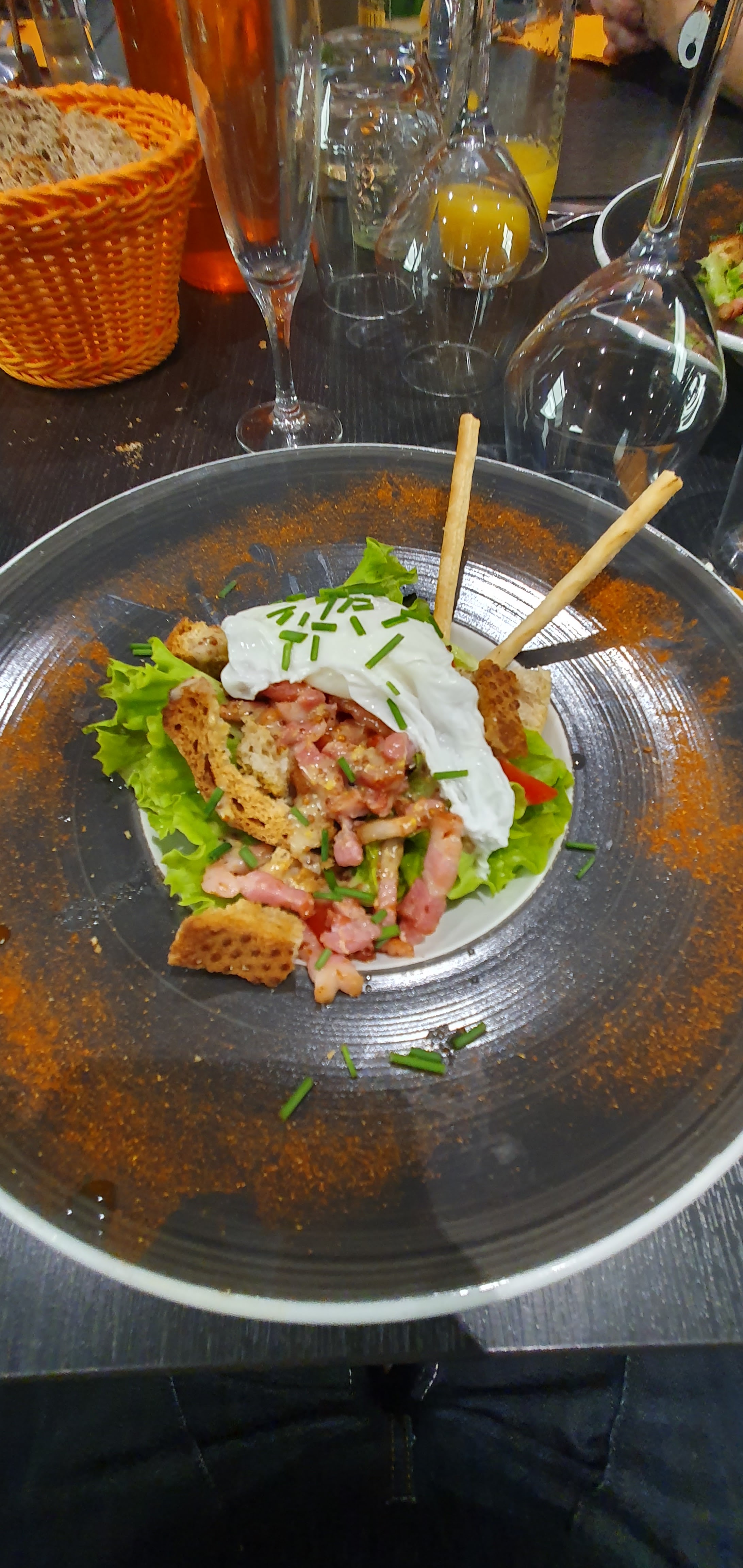 Nous étions un bon groupe d'amis. Uniquement des seniors, il s'agissait de nos retrouvailles, suite à nos vacances de fin septembre au 10 octobre dernier. Repas impeccable. En apéritif, j'ai bu un kir châtaigne, c'était super ! Même le pain, il n'y avait rien à redire. À part la seule raleuse de service, qui nous a cassé l'ambiance. Dommage pour nous et tant pis pour elle : il faut profiter de l'instant présent !