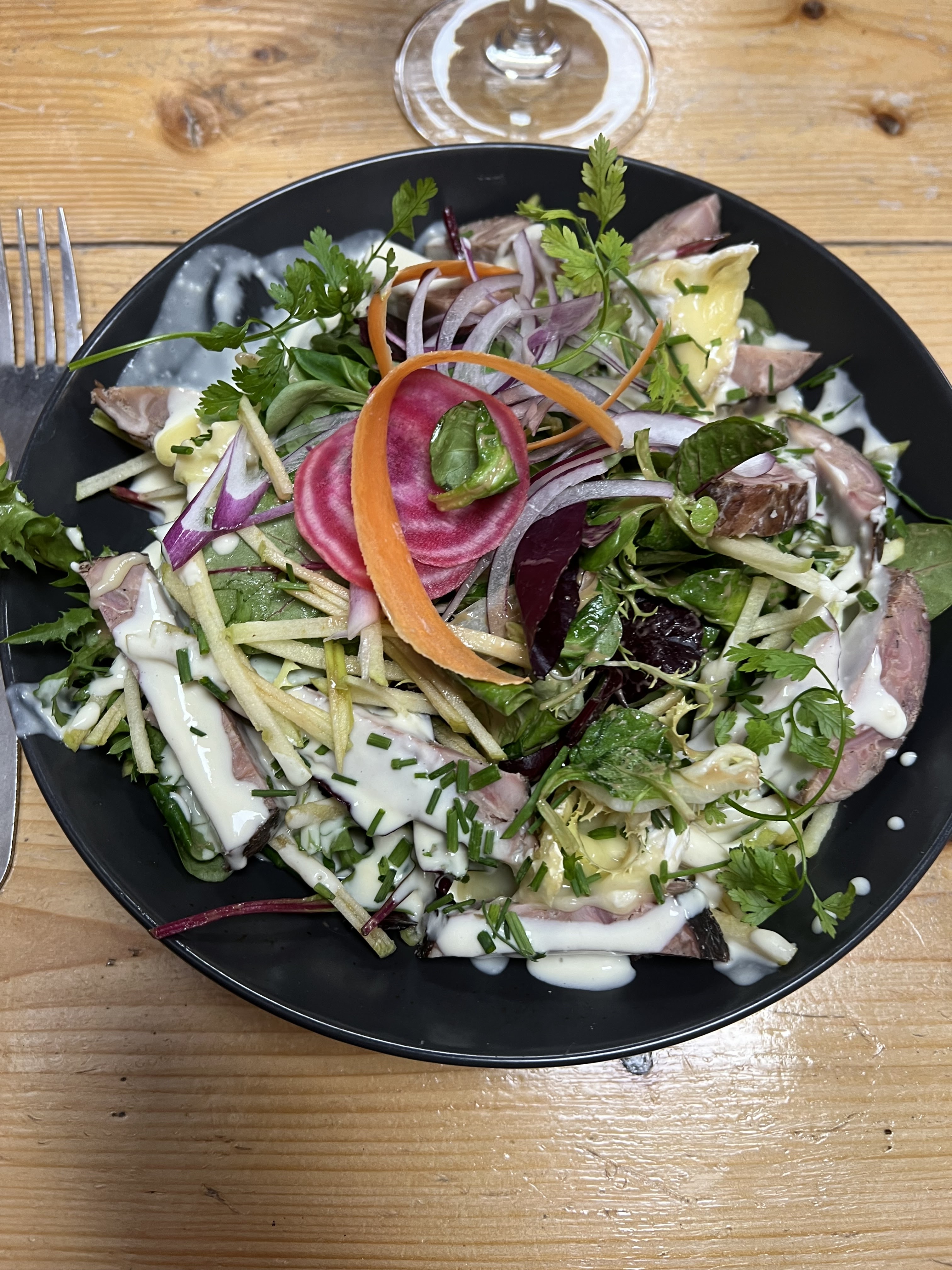 Salade copieuse normande, avec andouille, camembert, pomme, diverses salades, sauce camembert ! Trop bonne 👍