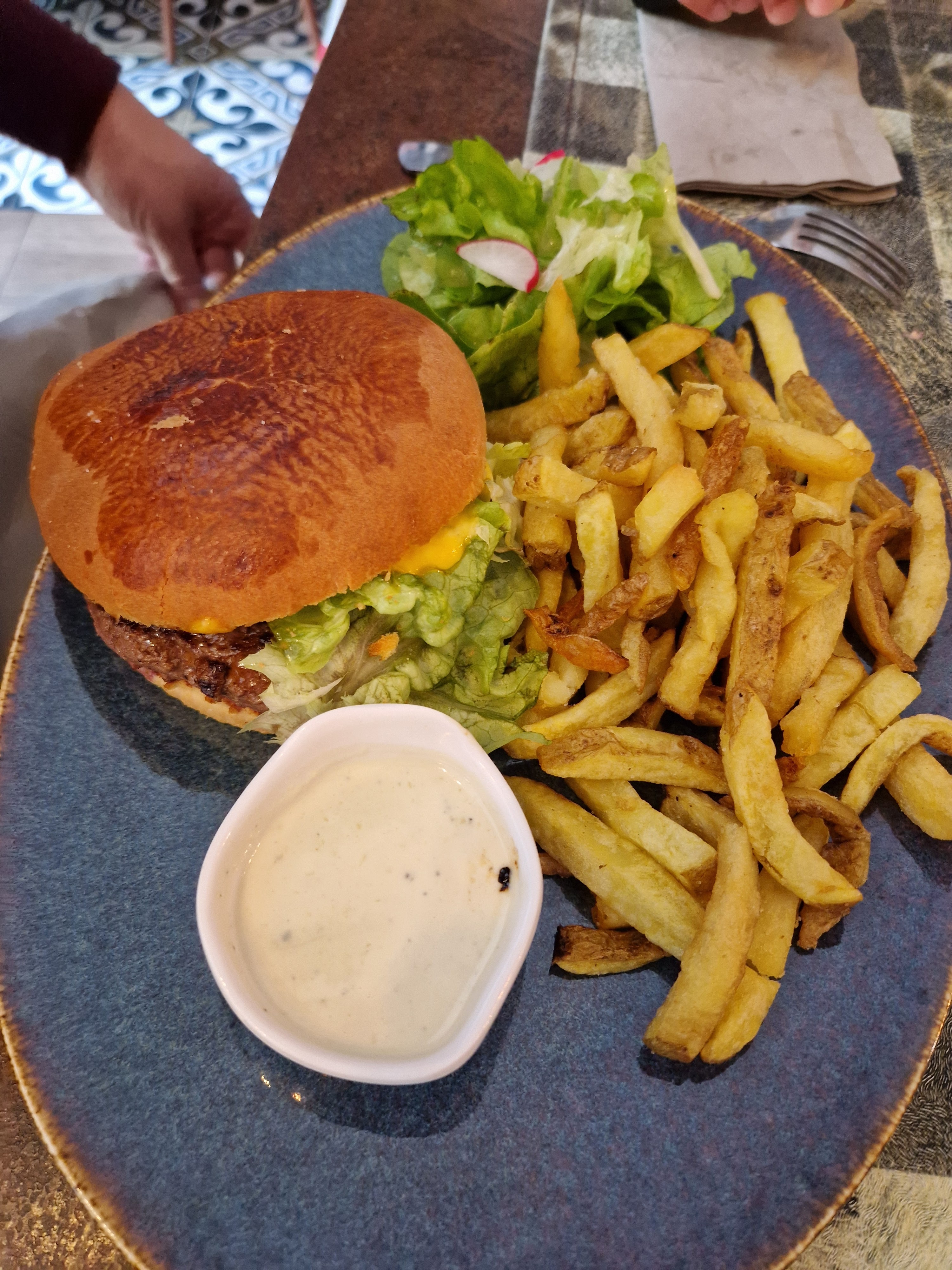Cadre très joli, restaurant propre, personnel souriant et gentil. Nous avons pris des burgers, je n’avais sincèrement jamais mangé de burger aussi bon!!! Pain maison, sauce maison, frites maison, mayonnaise maison. Tout était parfait. En dessert nous avons pris le sunday fraise, chantilly et glace maison, excellent de A à Z. Je vous recommande cette adresse si vous passez dans le coin, n’hésitez pas à réserver.