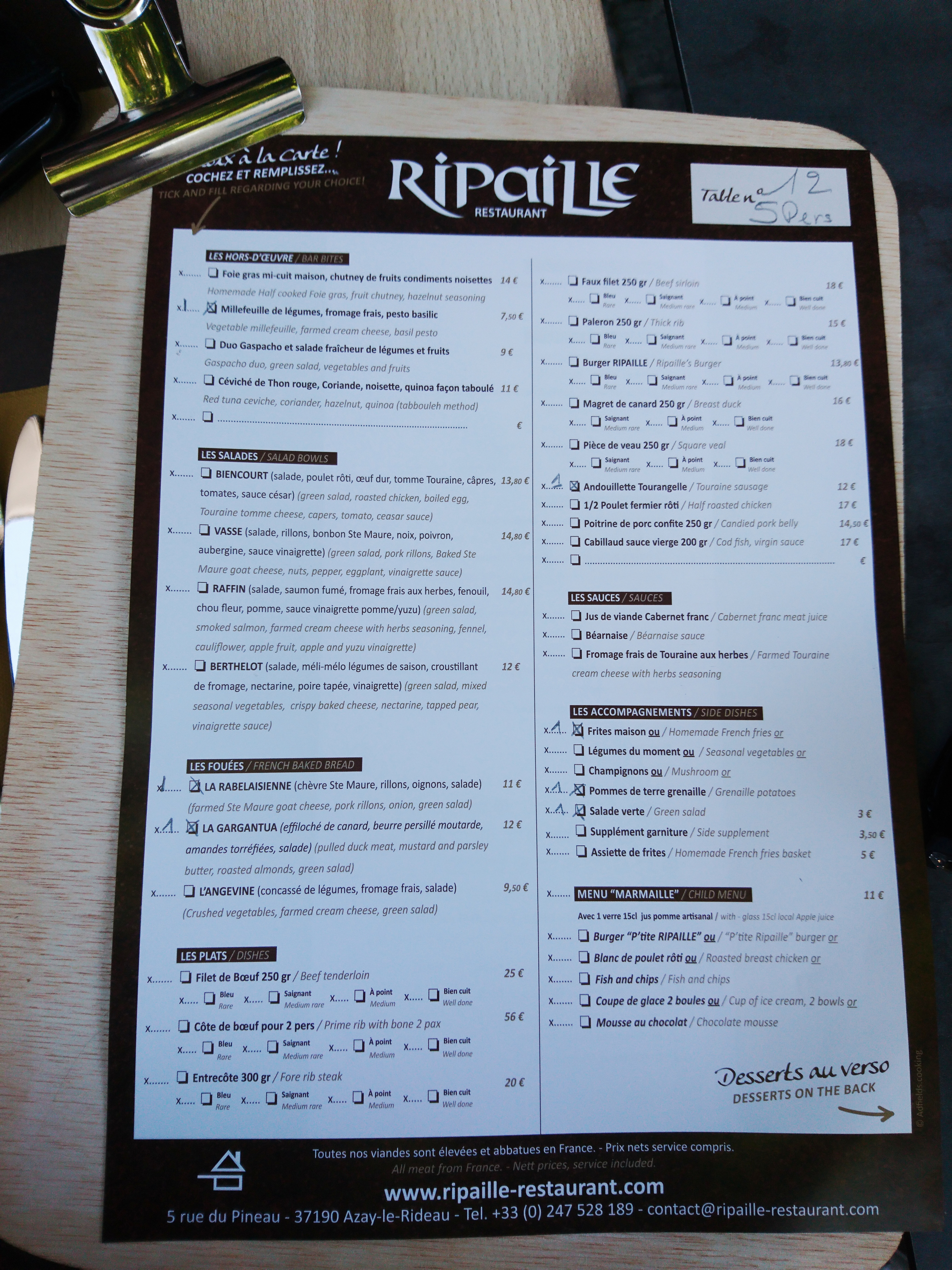Mon mari et moi avons suivi la recommandation de notre hôte au gîte où nous séjournions et sommes allés à la Ripaille le temps d'une soirée après une visite dans les châteaux de la Loire. Après une réservation téléphonique, nous sommes arrivés sur place environ une heure plus tard. Le temps du trajet, nous avons découvert la carte sur le site internet, qui nous a donné envie. Arrivés sur place, bien que l'accueil soit vraiment charmant, notre réservation était introuvable. Après un arrangement de dernière minute nous avons pris notre table, et découvert la carte ... qui n'était pas tout à fait identique à celle du site. Et justement, il n'y avait pas la partie des salades que nous souhaitions essayer. Une sacrée déconvenue pour nous, surtout à la dernière minute. Un peu refroidis, nous avons passé une commande et tenté de faire contre mauvaise fortune bon coeur. Outre les marmots de la région à qui l'éducation et le silence n'ont visiblement pas été inculqués, l'ambiance était sympathique et cosy. En dépit des déconvenues, nous avons été bien courtoisement servis. Le repas était bon, il n'y a rien à redire là-dessus. J'aurais cependant pour conseil d'oser davantage de sirop dans un diabolo afin que son goût soit vraiment présent, une meilleure cuisson des frites et une plus grande souplesse sur la possibilité de changer le parfum des pavlovas. L'expérience n'a pas été déplaisante, cependant la déconvenue du menu trompeur ne nous a pas permis d'apprécier cet établissement à sa juste valeur. C'est par politesse et respect que nous sommes restés après avoir découvert les différences dans le menu, rien de plus.