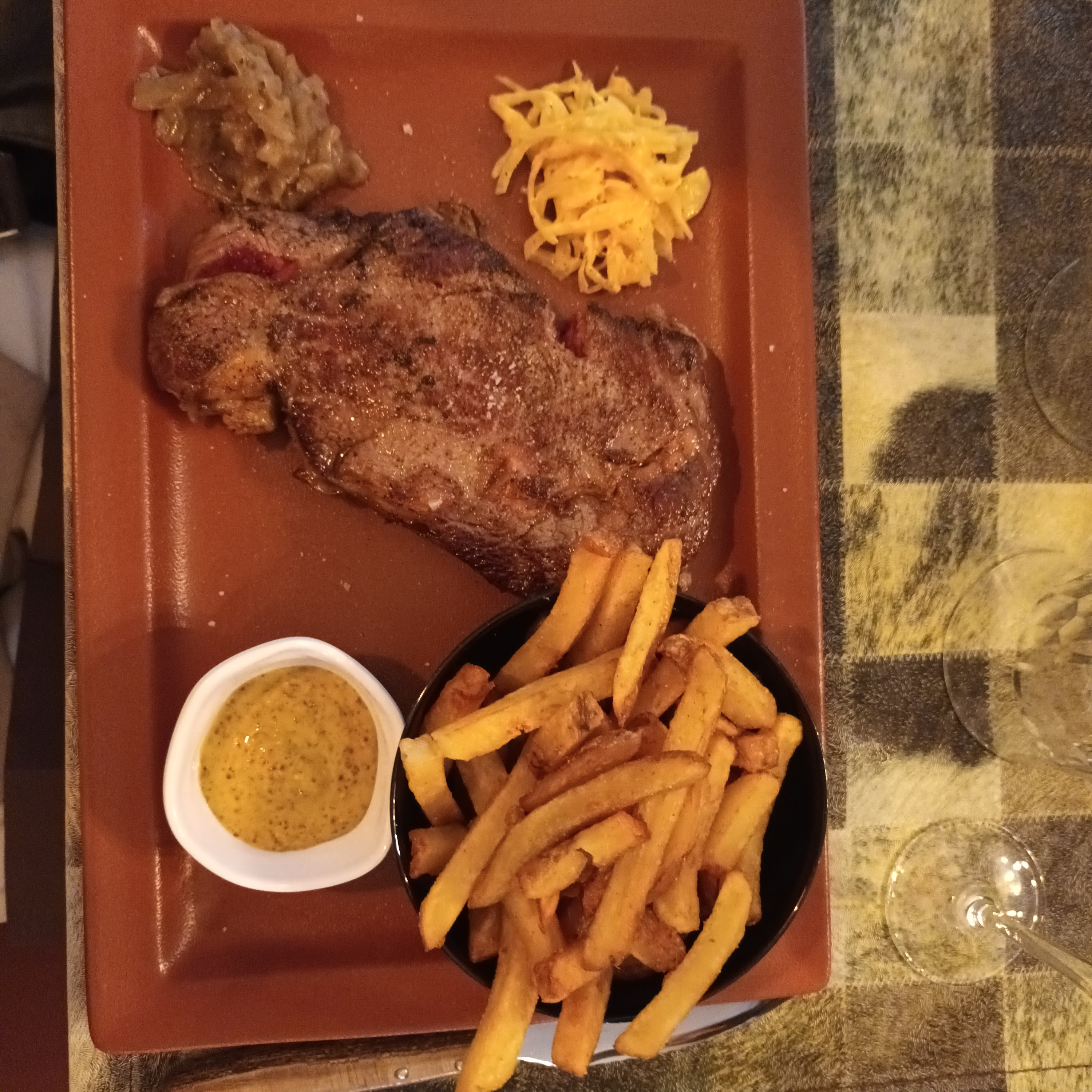 Malgré une reservation de dernière minute, une table pour 2 nous est accordée, accueil sympathique, notre choix se porte sur une côte de bœuf Normande, servie sur sa planchette, viande gouteuse, tendre et cuite à notre gout, nos 2 desserts sont excellents, la serveuse est très sympa et accepte sans soucis de nous garder l'os et le gras restant de notre viande pour régaler notre Cané Corso qui est resté à la maison. Nous reviendrons surement pour partager d'autres bons moments comme celui ci. Merci à vous et encouragement aux 2 serveuses qui malgré la forte activité ont toujours le sourire et un petit mot gentil pour les clients.
