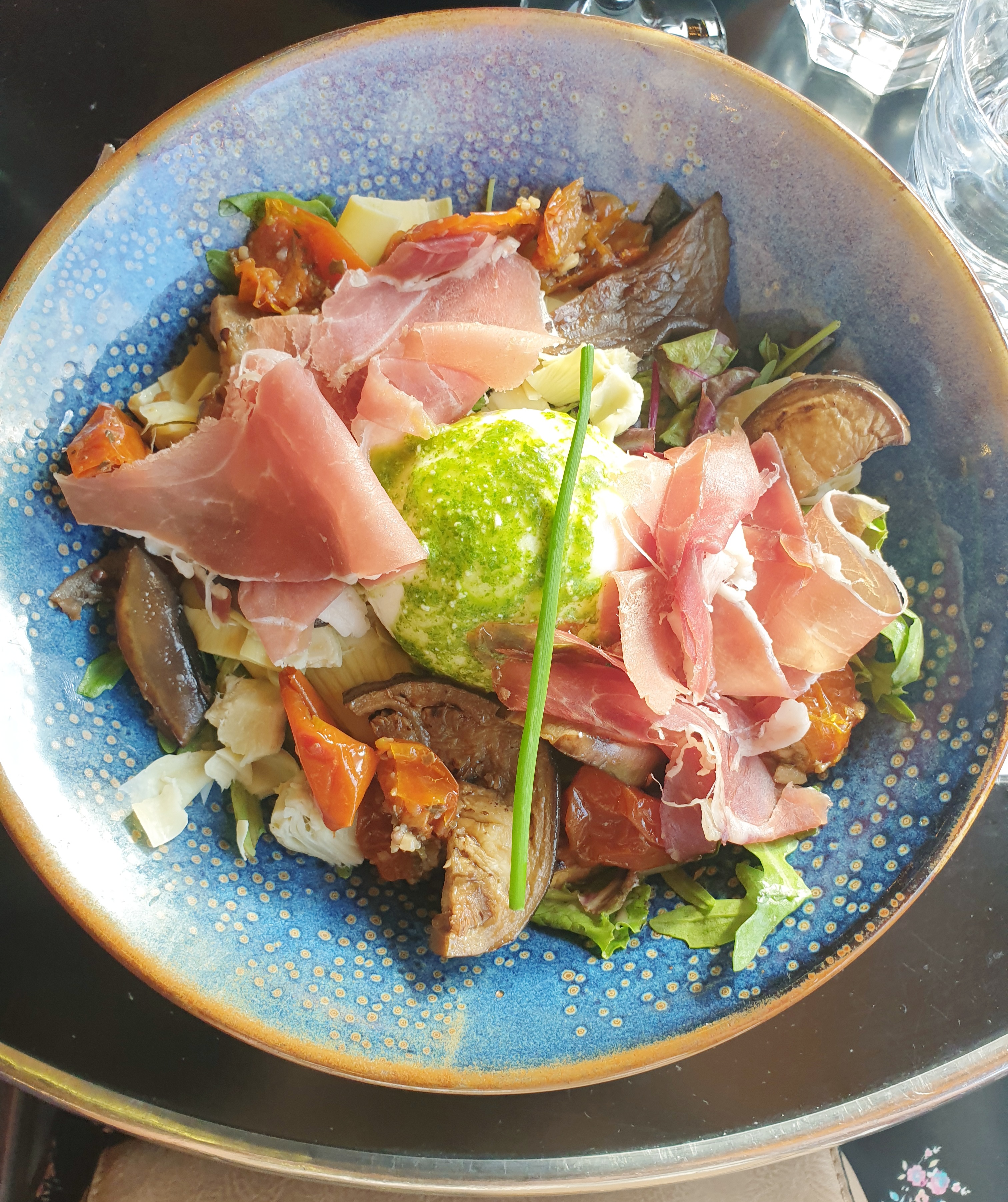 Bonne assiette de salades et de fromages dans un endroit magnifique :)
