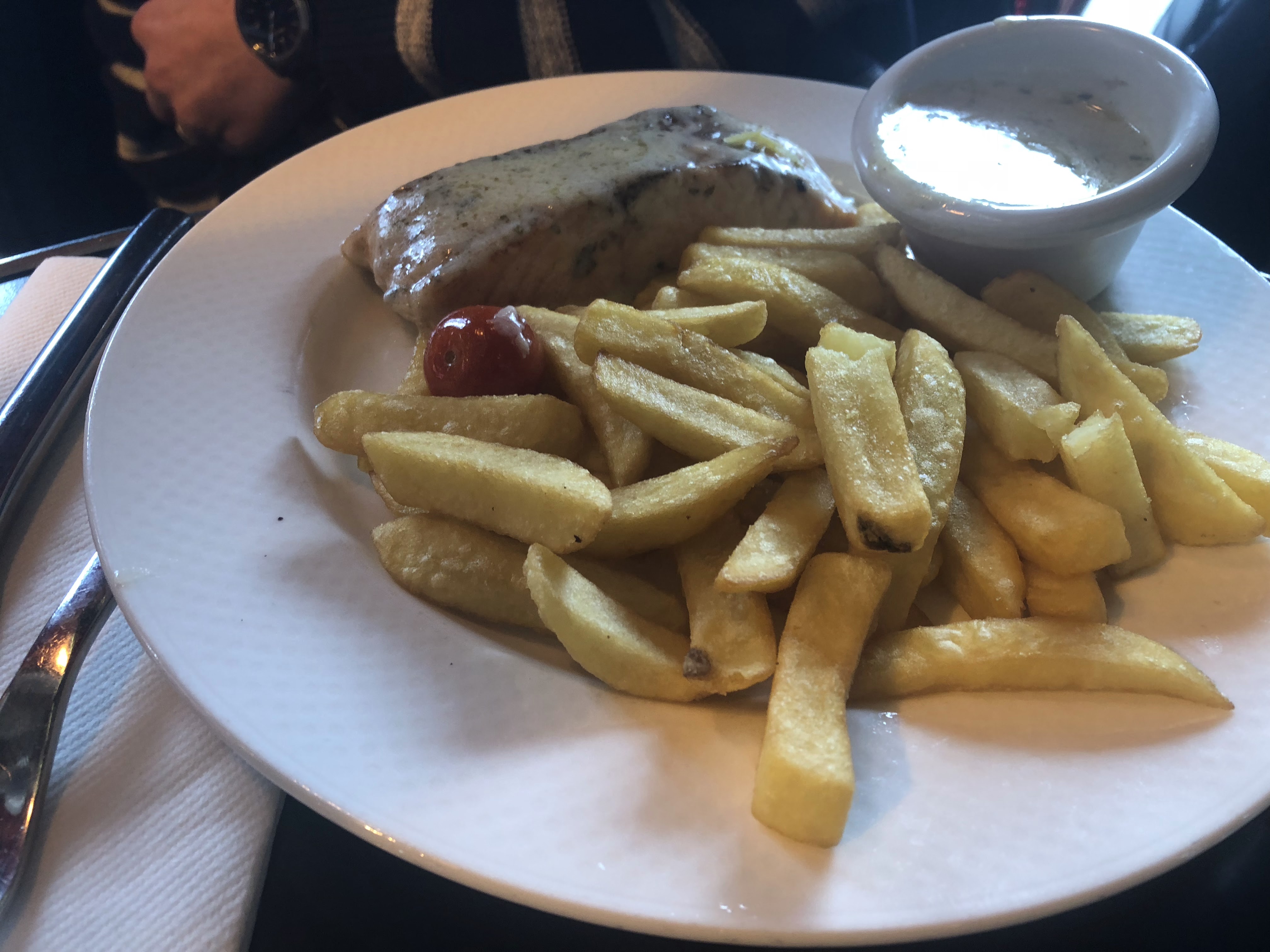 Désagréable. Les serveurs fonctionnent par secteur. Vous pouvez les appeler ils vous répondent que ce n 'est pas eux qui s'occupent de vous. Très long entre chaque plat alors qu'il n'y a personne et apothéose pour le dessert. Le dessert du jour n'est pas disponible et les 3 autres desserts choisis ils ne les avaient pas. Nous avons demandé l'addition et sommes partis. Je ne le conseil pas !