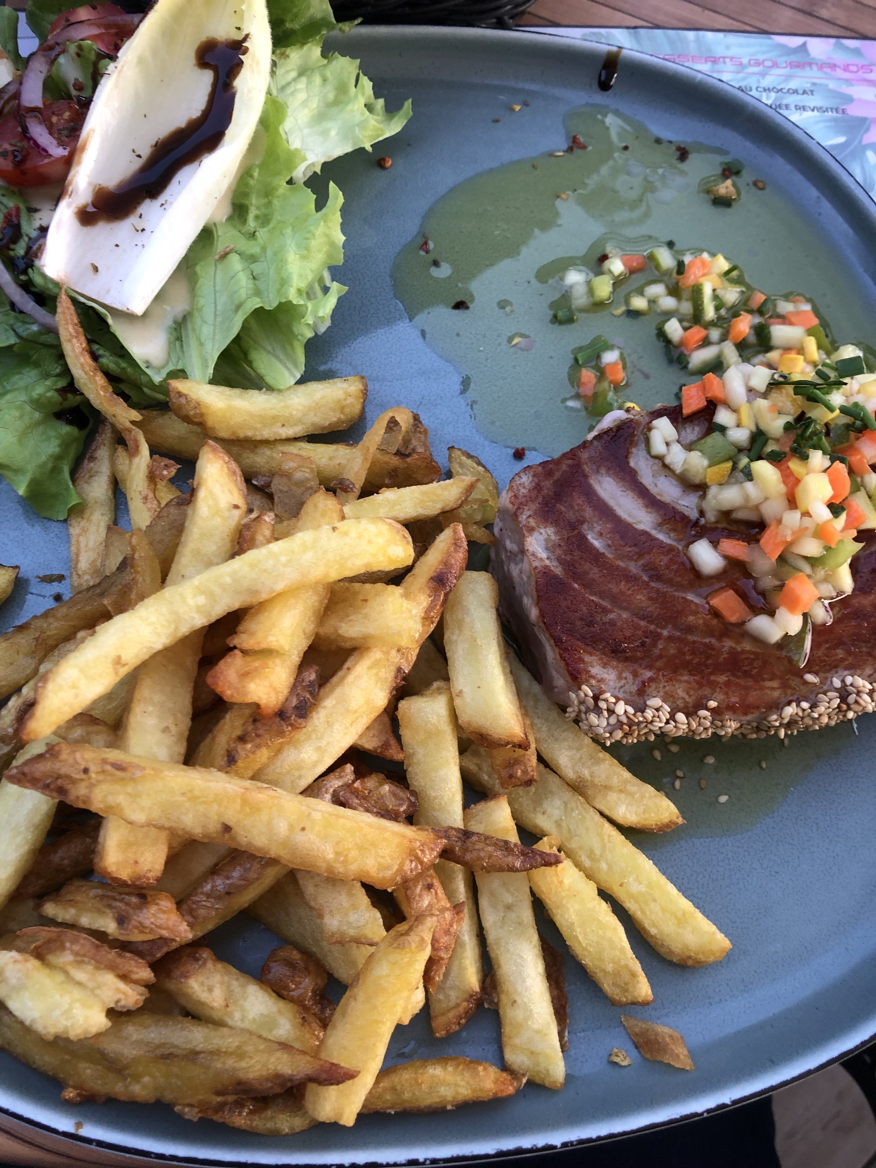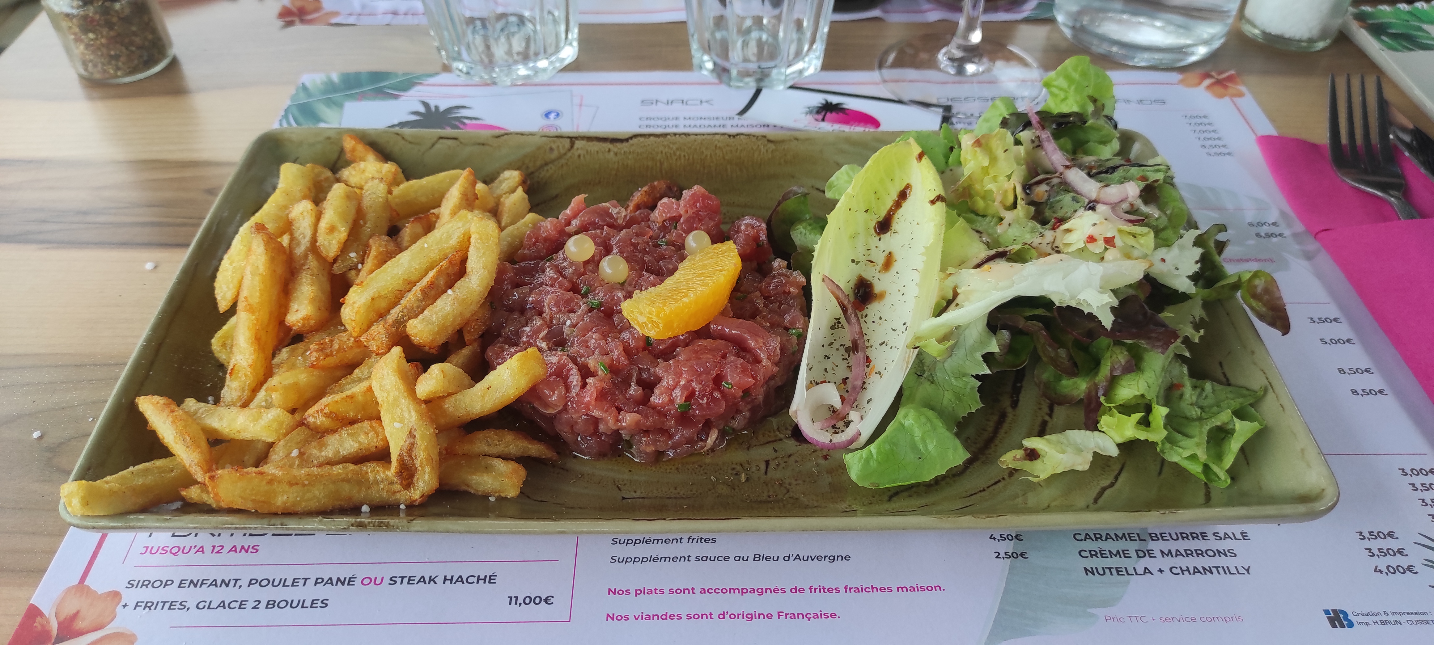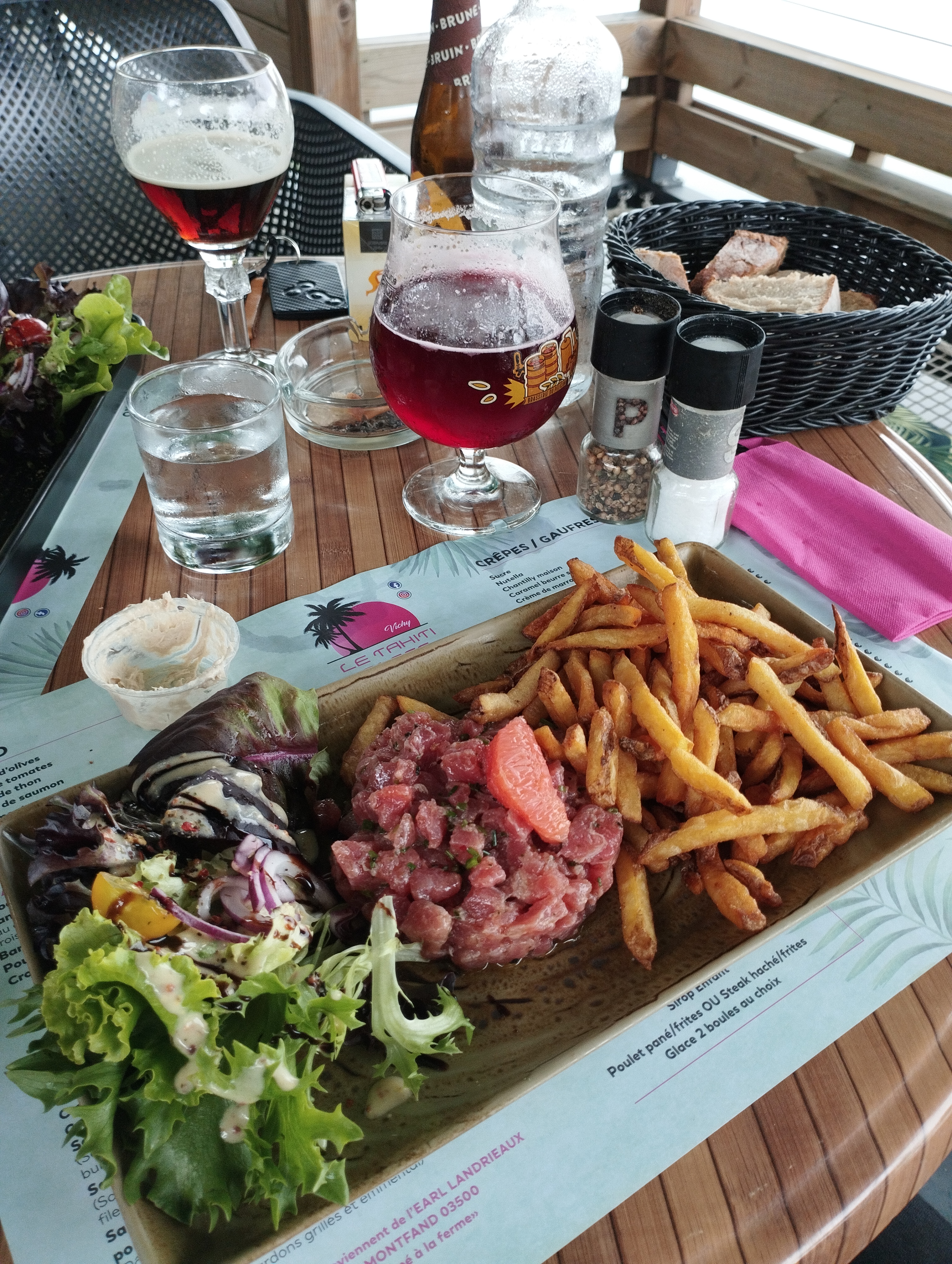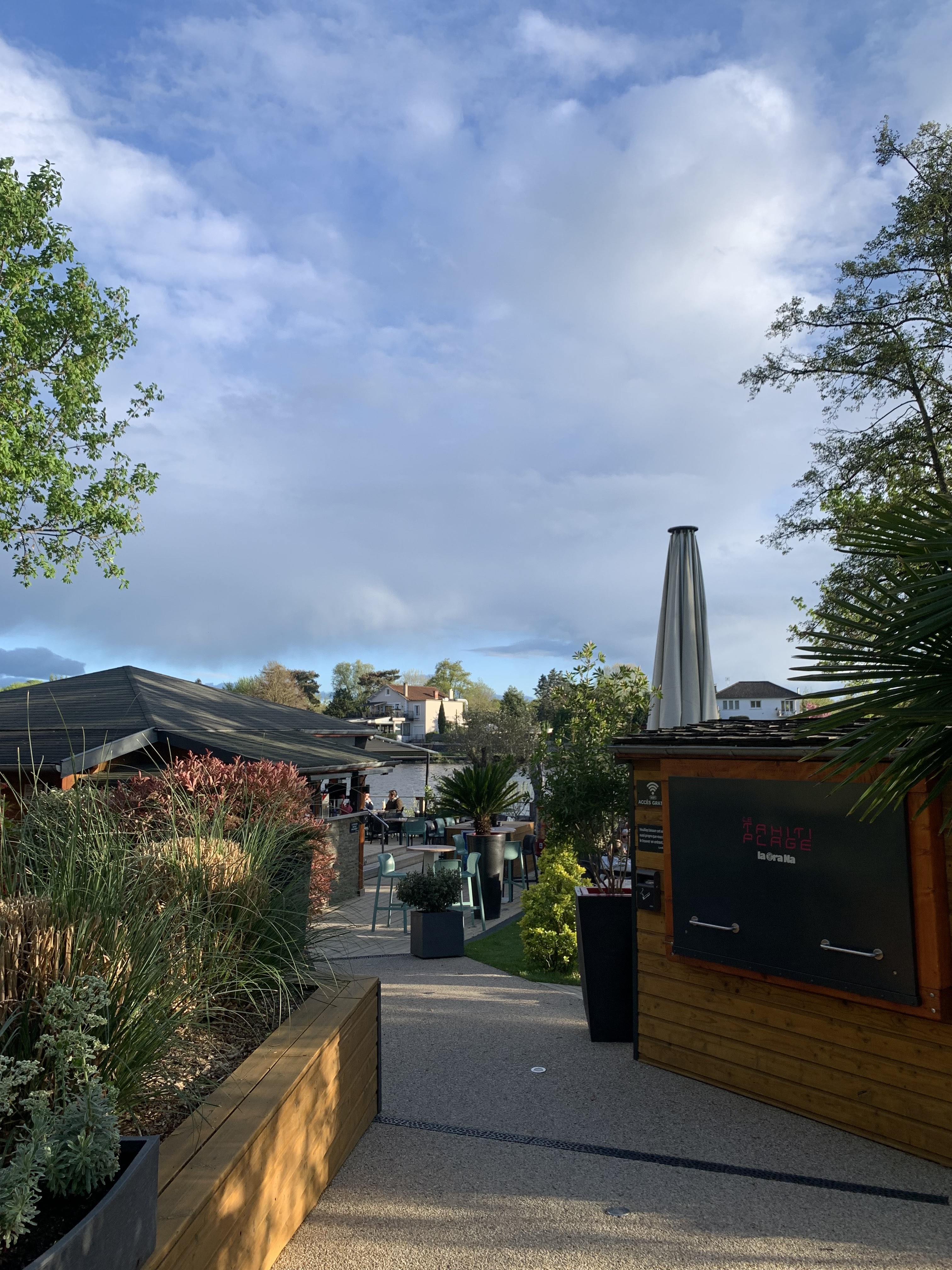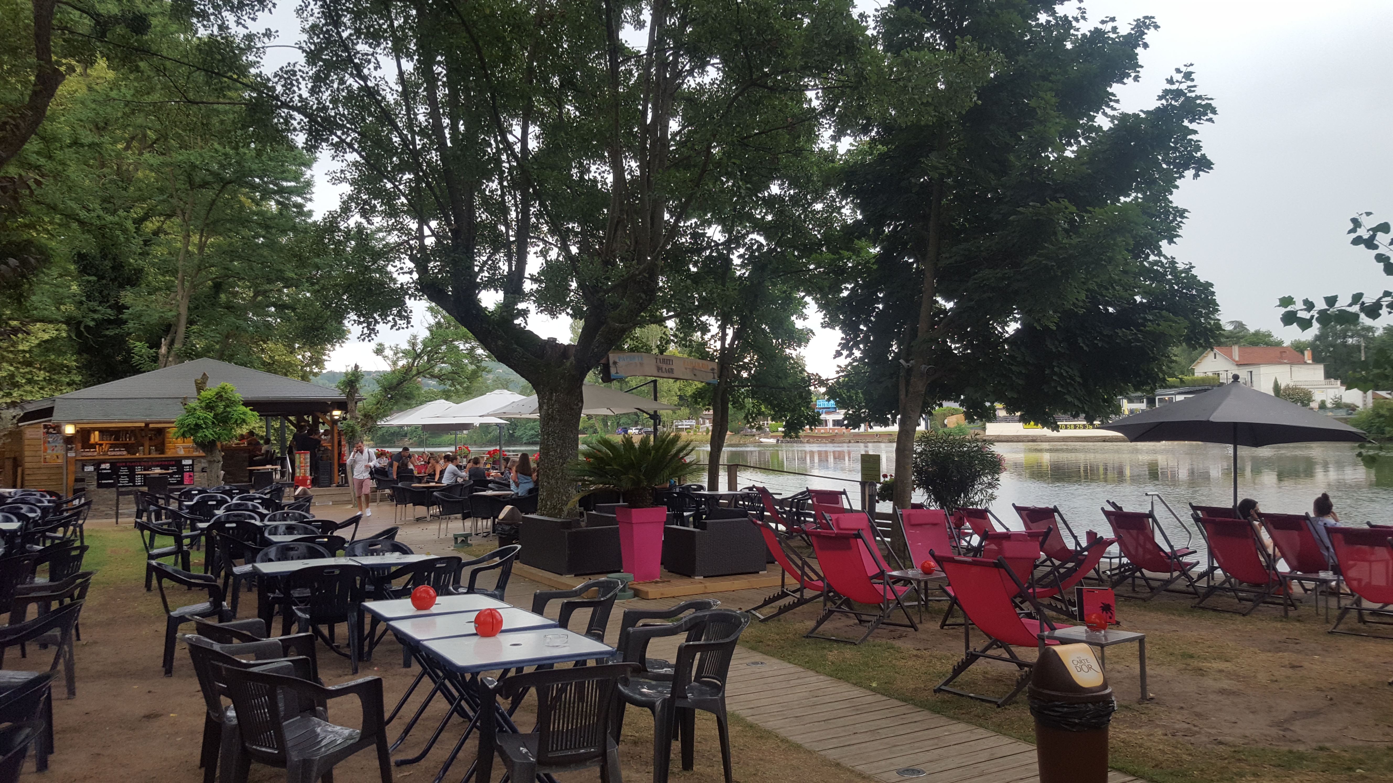 Une première sur Vichy pour un triathlon…enfin encourager un ami qui faisait un triathlon.. Sur les conseils d’une amie locale , on arrive un samedi soir au Tahiti plage. Les bords de l’Allier sont super bien aménagés . Le cadre est très sympathique , il y a du monde , les serveurs sont en plein service: on voit que c’est une affaire qui tourne à plein régime. Nous arrivons un peu en retard par rapport à notre réservation. Le serveur nous fait attendre gentiment, ce qui nous laisse le temps de prendre des cocktails en apéro. La musique monte progressivement et on se croirait en vacances dans le sud. Décoration branchée…on est bien !! Que dire sur le repas…on retrouve les classiques d’une brasserie …c’est bon , c’est bien servi et plutôt rapidement vu le monde . On est servi avec le sourire et rien n’est un problème…toujours important de le signaler. On a bien mangé, bu deux bouteilles de rosé et on a passé un bon moment : on se serait cru en vacances… Une belle affaire qui tourne, on voit que c’est bien tenu par des gens qui connaissent leur métier. On recommande.