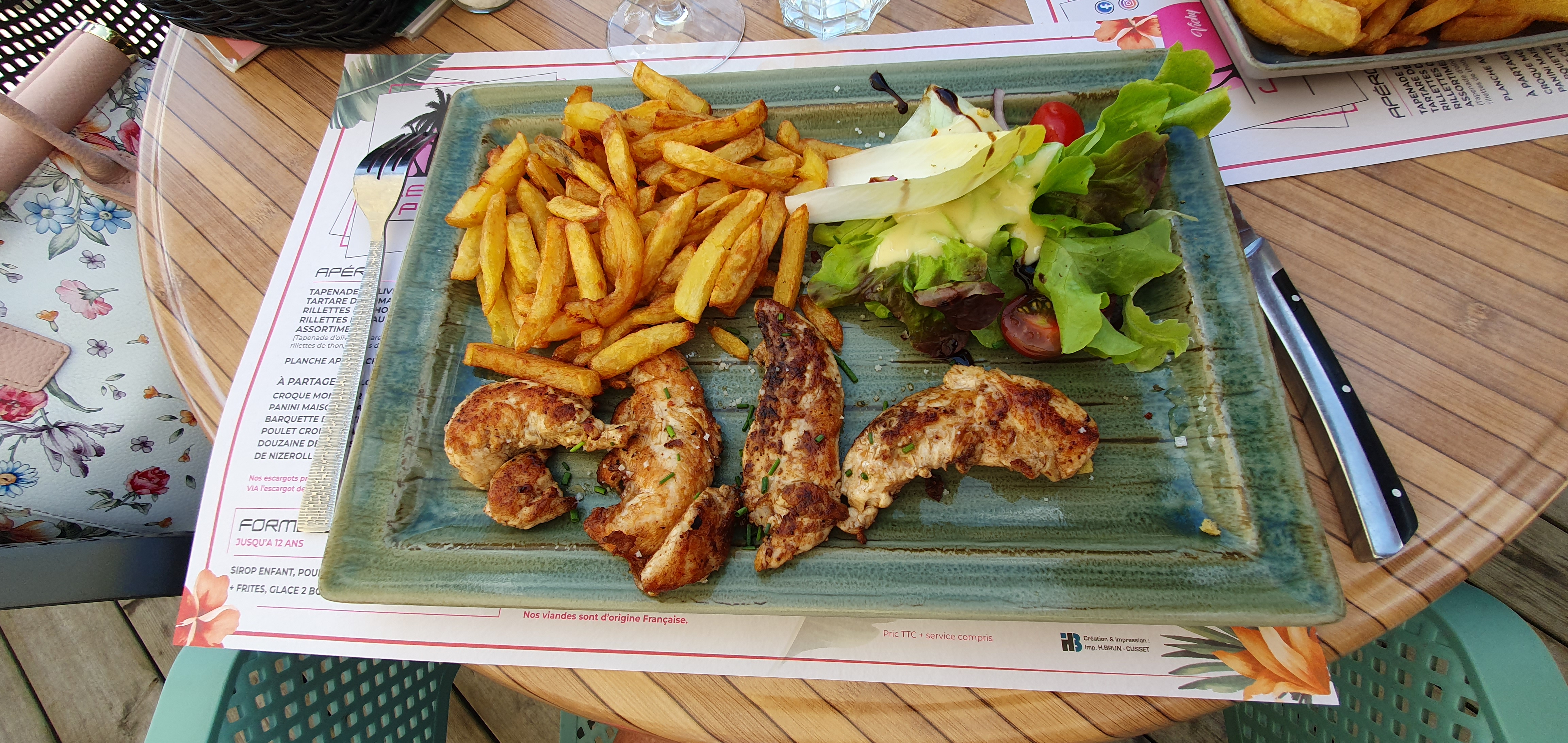 Endroit agréable avec terrasse ombragée et au bord de l'Allier bien apprécié avec 34° au thermomètre. Plats goûteux quantité correcte : faux filet /frites et aiguillettes poulet mais prix excessif (sauce en supplément) Placement et service rapide par serveuse souriante.