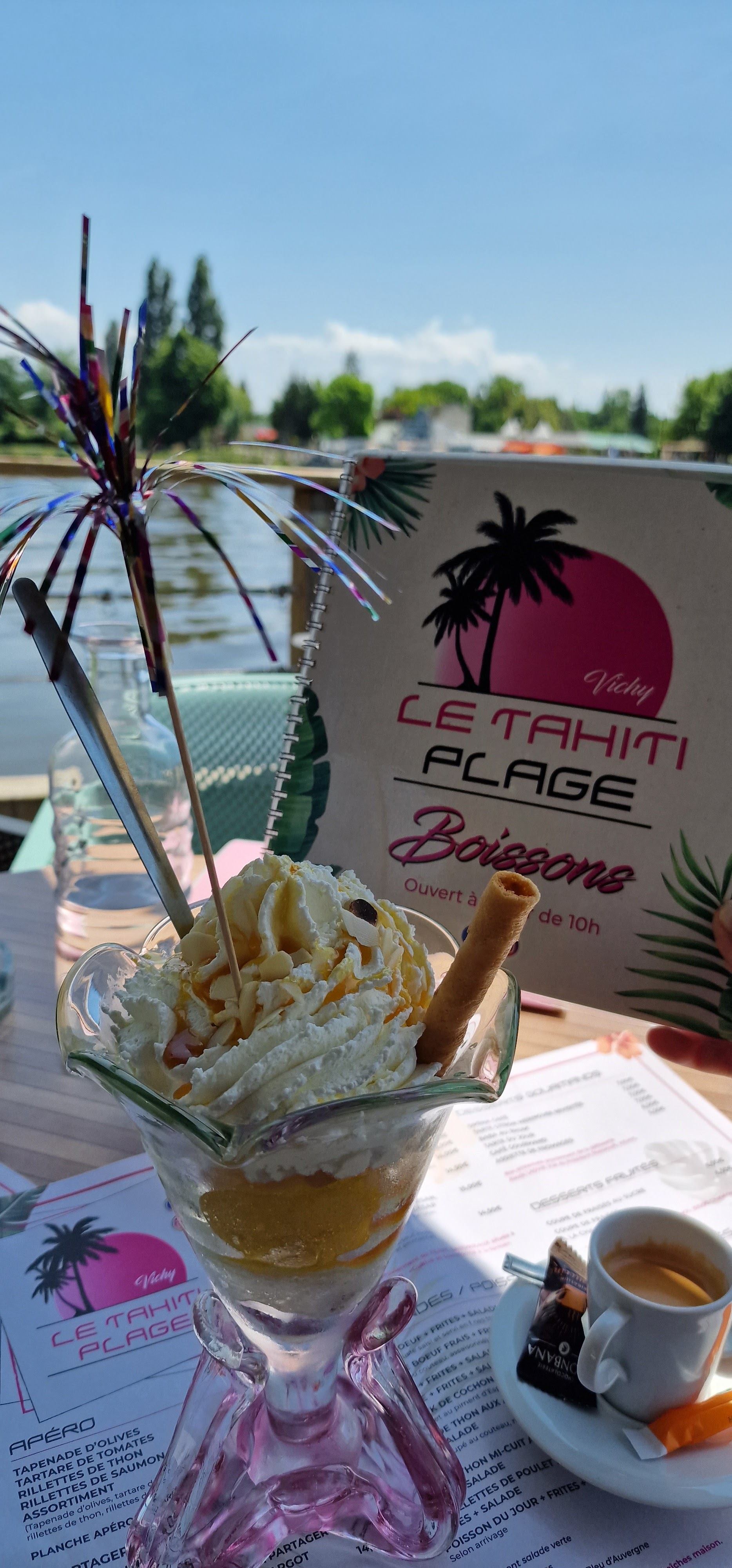 Si vous passez à Vichy, pensez au Tahiti. Pour boire un verre, déguster une glace, manger une gaufre, déjeuner ou dîner. Les plats, les suggestions du jour, les vins sont parfaits et toujours d'une grande fraîcheur. Rapport qualité prix au top ! L'accueil de l'équipe est fort sympathique. Le cadre en bord d'Allier est magique. Nous passons toujours de très bons moments dans cet établissement. Pensez à réserver votre table pour en profiter. Merci à l'équipe des cuisines, du service et aux propriétaires.