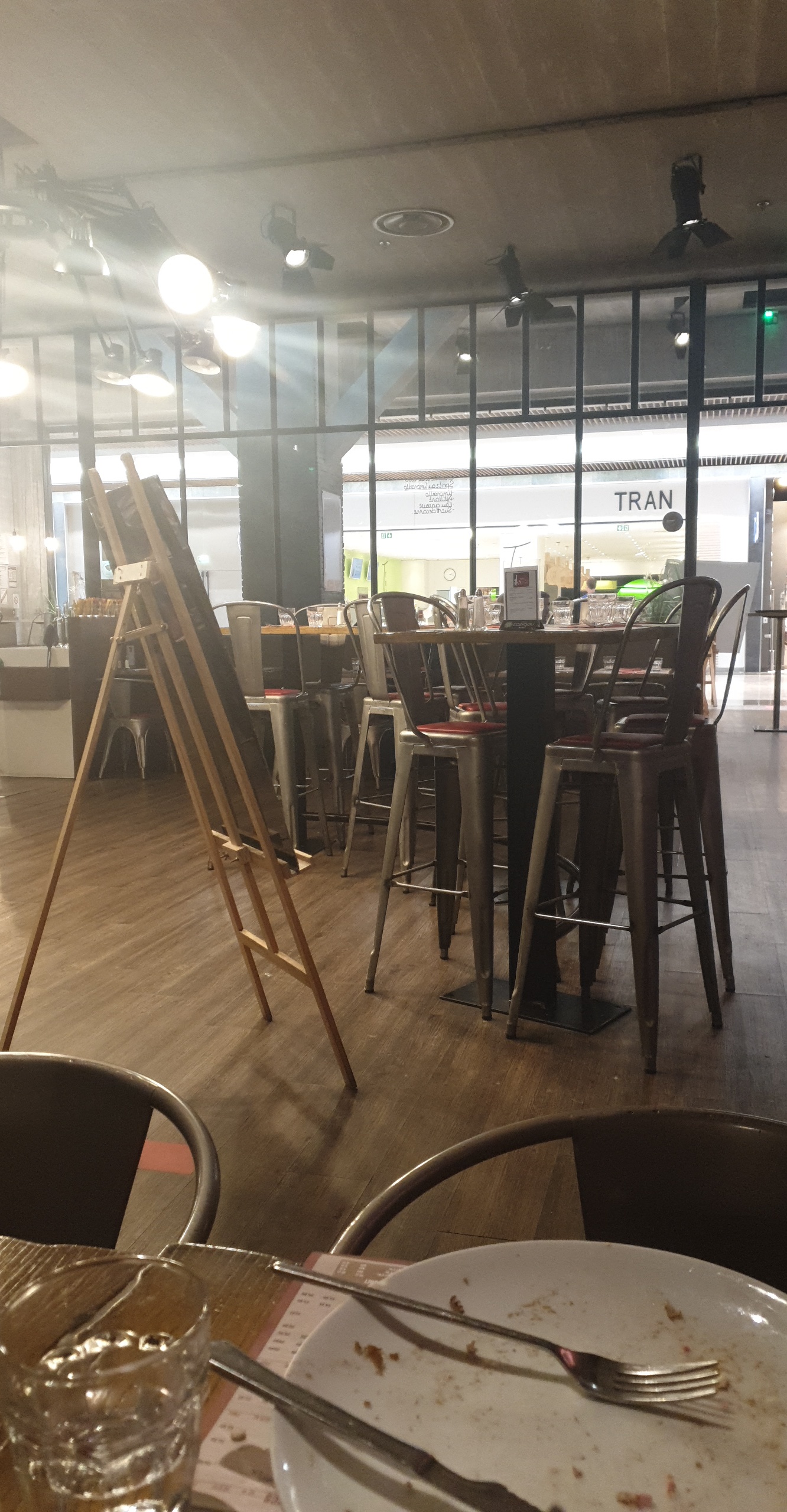 La restauration est correct le service est assez bon mais c'est trop bruyant il n'y a aucun traitement acoustique on se croirait dans un Hall de foire
