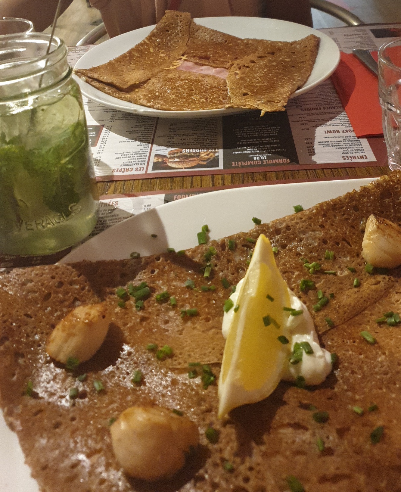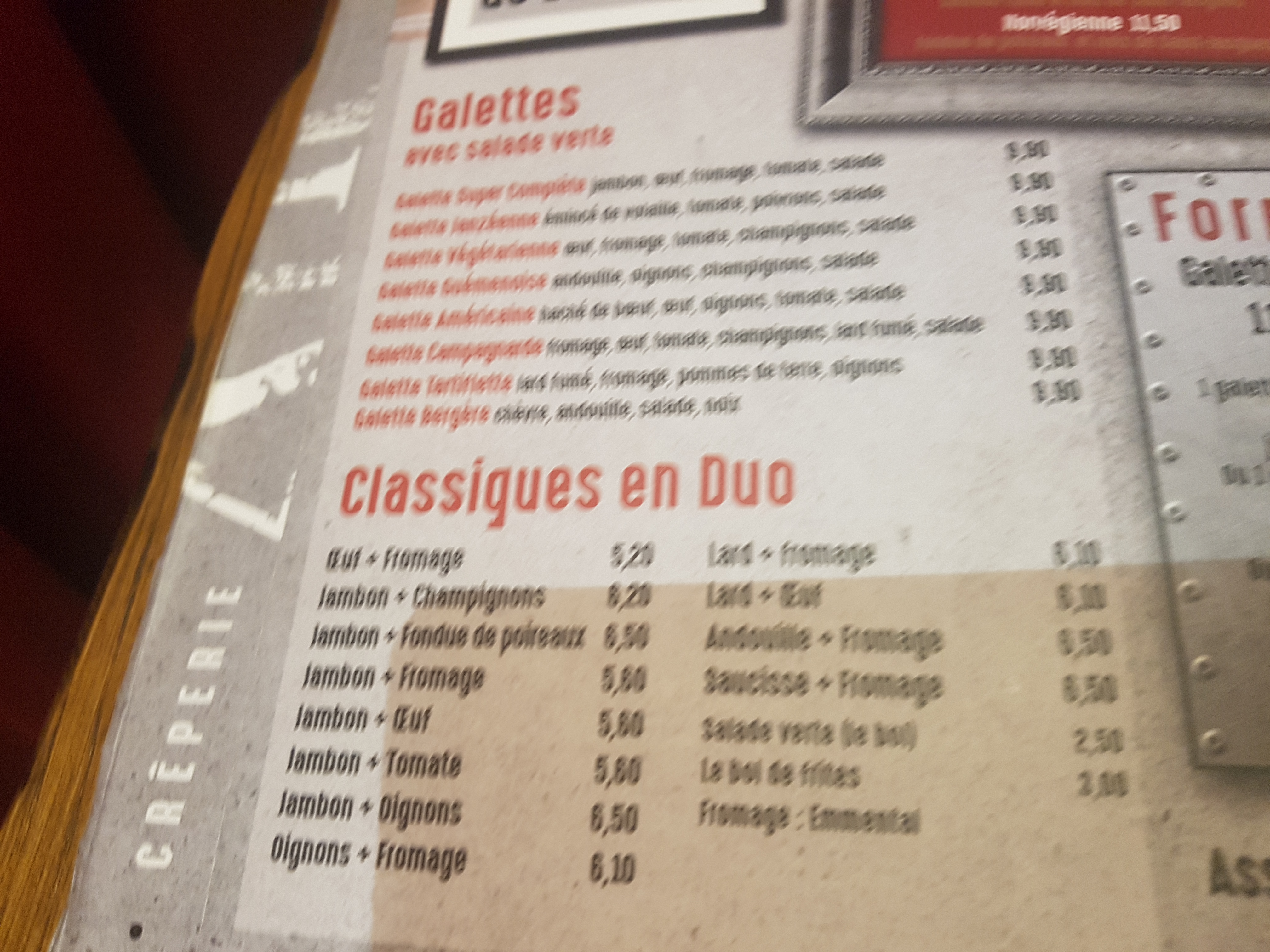 J'ai pris le menu galettes: galette , crêpe et une bolée de cidre à 15,50€,il y a également entrée,plat, dessert du jour, dommage que le restaurant soit aussi bruyant,service rapide