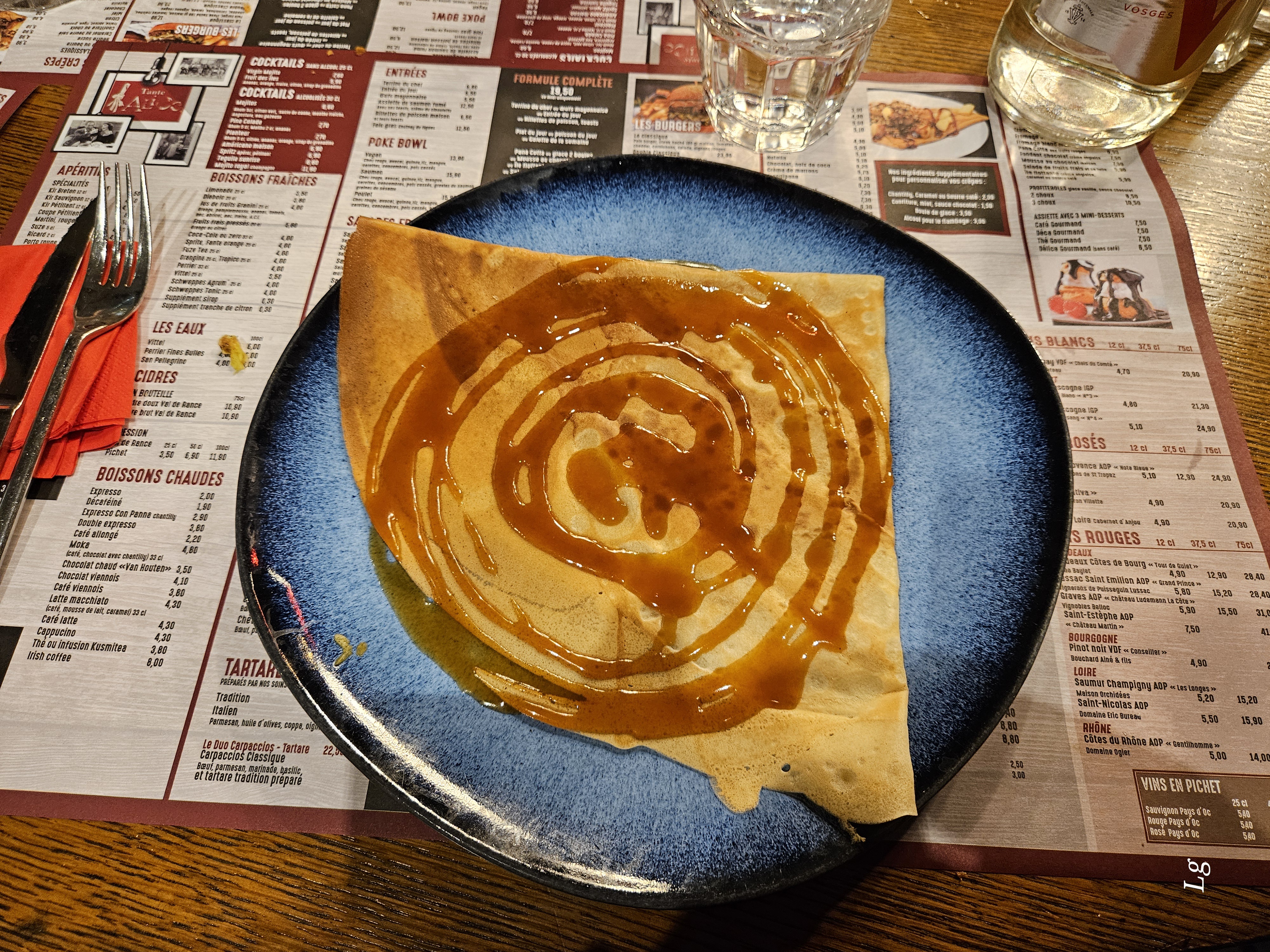 J’ai pris une crêpe au sucre. Trop cuite et sèche. Serveuse désagréable qui lève les yeux au ciel car j’ai changé mon jus d’orange en jus de pomme pendant qu’elle prenait la commande…