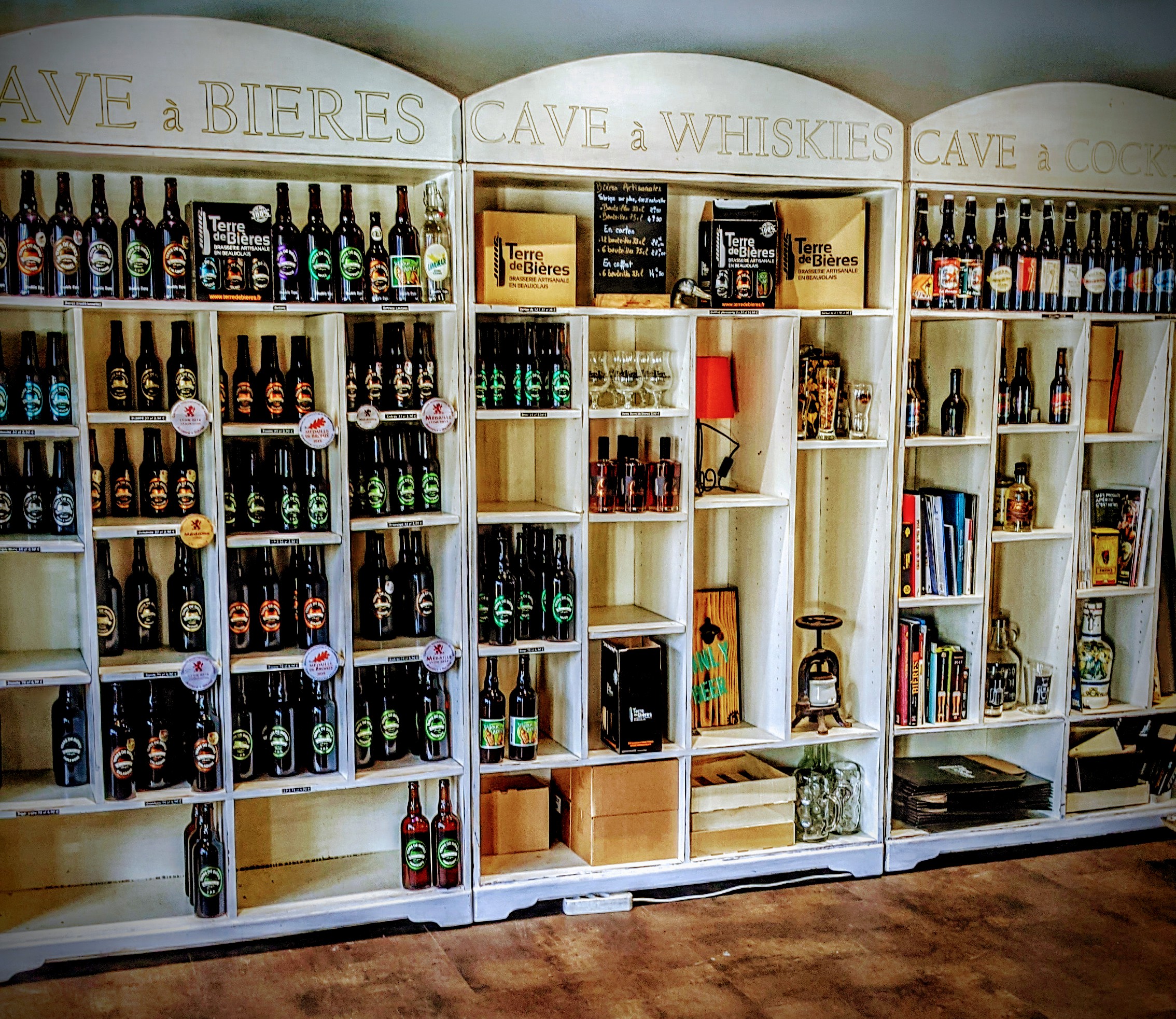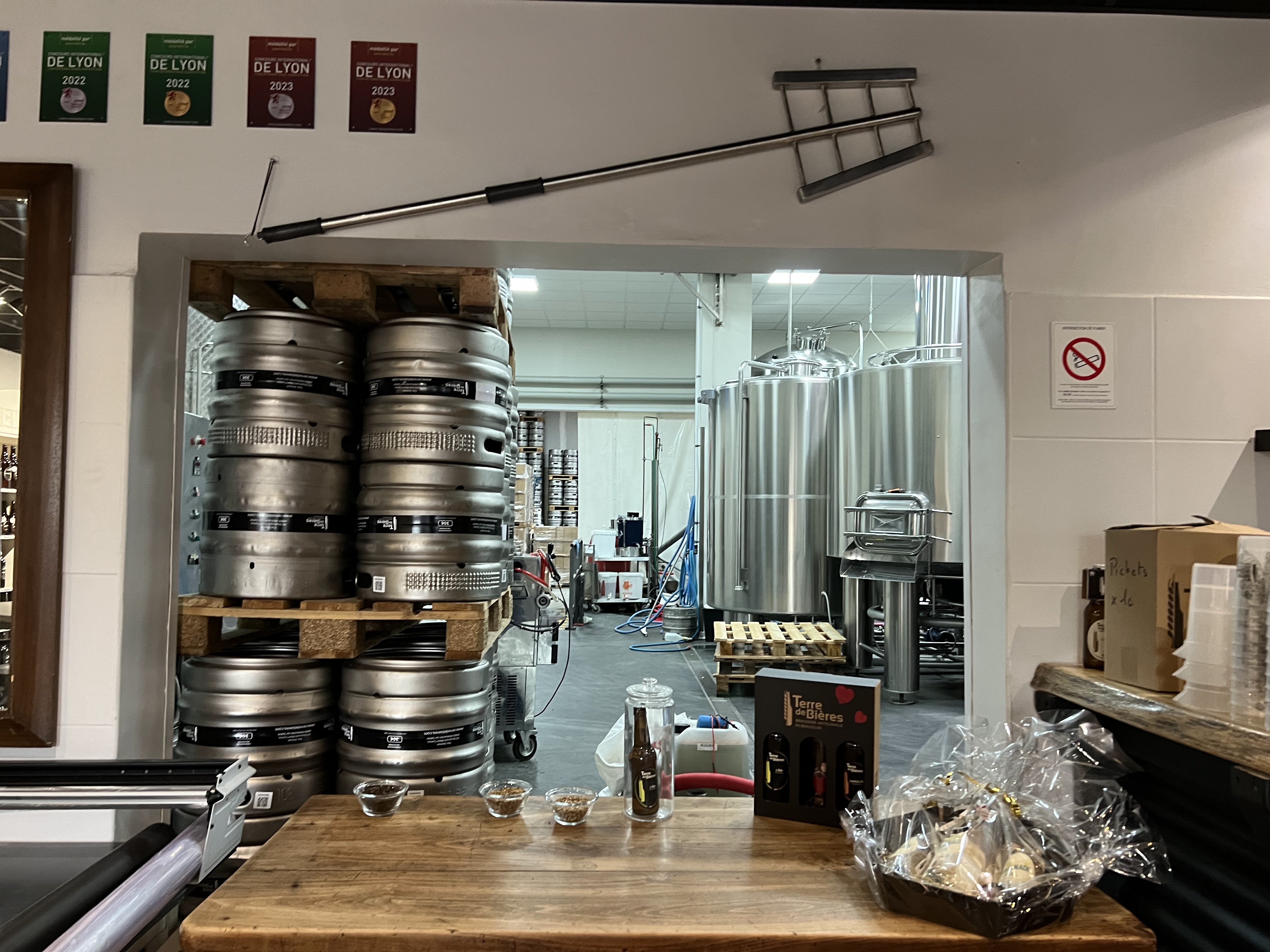 Voilà un lieu qui m'intriguait, vu de mon bureau je voyais pas mal de va et vient signe qu'il y avait certainement matière à satisfaire l'Amateur de bière que je suis. Aujourd'hui je me suis décidé à pousser la porte afin de satisfaire ma curiosité. De l'extérieur on ne se doute pas de la découverte d'une brasserie où l'on peut voir l'ensemble de l'installation avec les belles cuves rutilantes en inox. Bref on est dans l'ambiance et en bon local guide Google je poste quelques photos avec cet avis. J'ai été accueilli par la patronne du lieu, très sympathique et qui n'hésite pas à faire découvrir les coulisses de la brasserie, parfait, qui n'apprécie pas de voir l'endroit où est fabriqué ce que l'on aime. Et la bière dans tout ça, et bien elles sont là devant moi au moment où je rédige cet avis, et elles sont bonnes. Je me suis penché sur les blondes ce soir. Fraîches, l'amertume est là savamment dosée, le pétillant pas trop prononcé, facile et agréable à siroter, la couleur dorée invite à la déguster. Généralement je suis plus bière belge, il faudra donc que je teste les autres bières de Terre de bière, plus fortes, des triples etc... Pour en faire la comparaison. Mais pour l'heure je recommande cette bière beaujolaise.