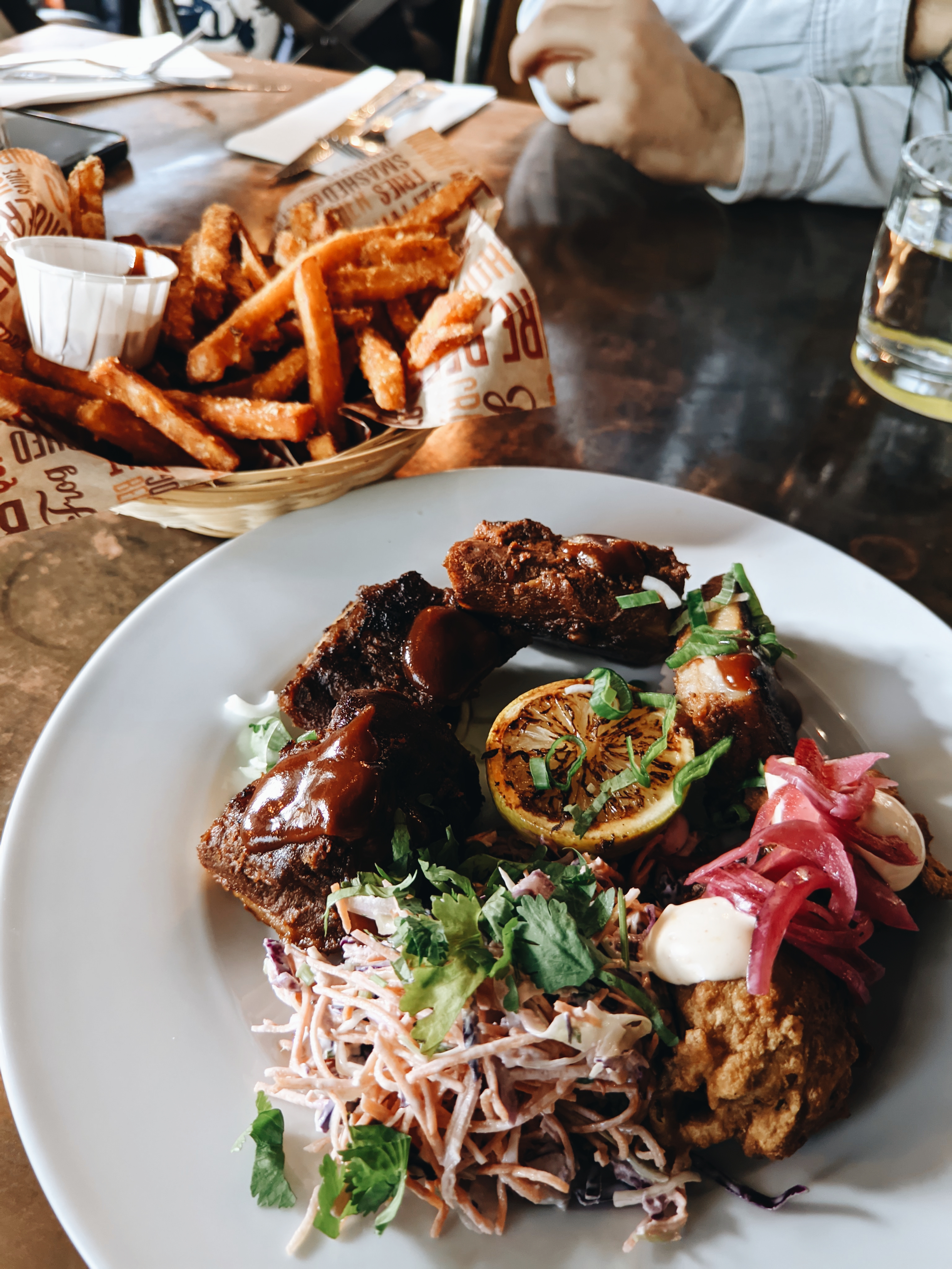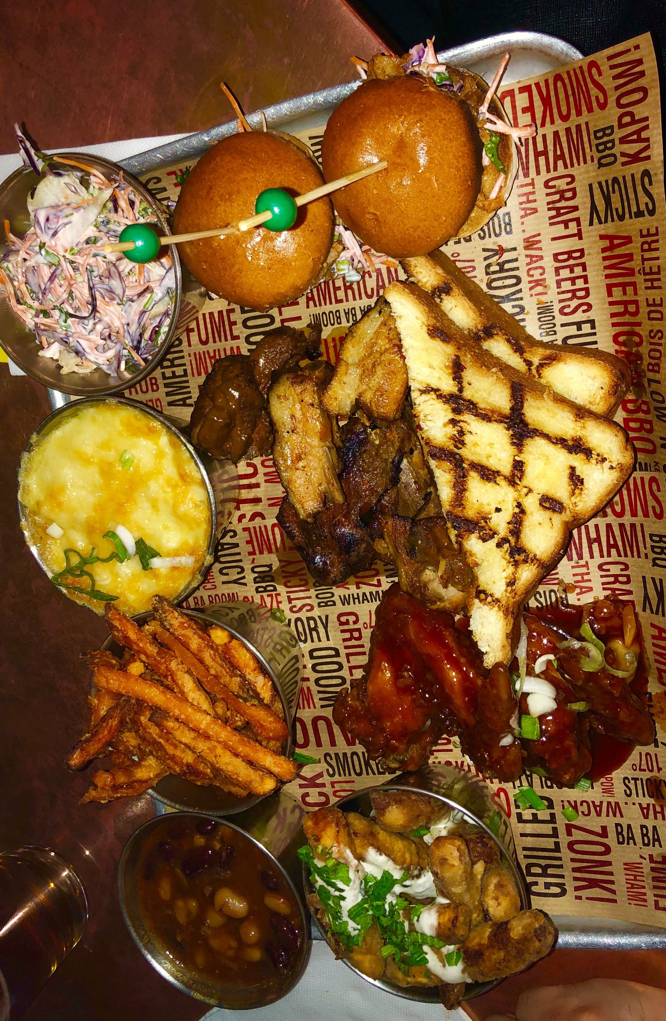 L'endroit est super sympa. J'y suis venue pour déjeuner entre collègues mais je pense que ça doit être plus sympa de nuit pour boire un verre. Niveau service le serveur est revenu nous demander deux fois ce que nous avions commandé car il n'avait pas pris de notes (difficile pour une table de 10 de tout retenir). Il y a eu pas mal de loupés sur la commande (des boissons en trop que nous n'avions pas commandées) mais les serveurs ont été sympas et ça n'a pas posé de problèmes. Les plats sont arrivés relativement vite et relativement en même temps. J'ai commandé des ribs et l'assiette était super conséquente pour cette tranche de prix. Je n'ai pas tout fini tellement c'était copieux. J'ai malheureusement dû laisser la moitié de mes frites de patates douces et ma croquette de maïs (qui n'était pas hyper intéressante au demeurant). Les ribs étaient pas mal, le coleslaw un peu sec et fade. Je n'ai pas trouvé d'intérêt au citron brûlé. Mon plat était froid quand j'ai mangé car j'ai un peu attendu mais je pense que de base il n'était pas bien chaud tout de même. Expérience somme toute sympa, d'autant plus qu'il est difficile de servir de grandes tablées. Merci pour l'accueil !
