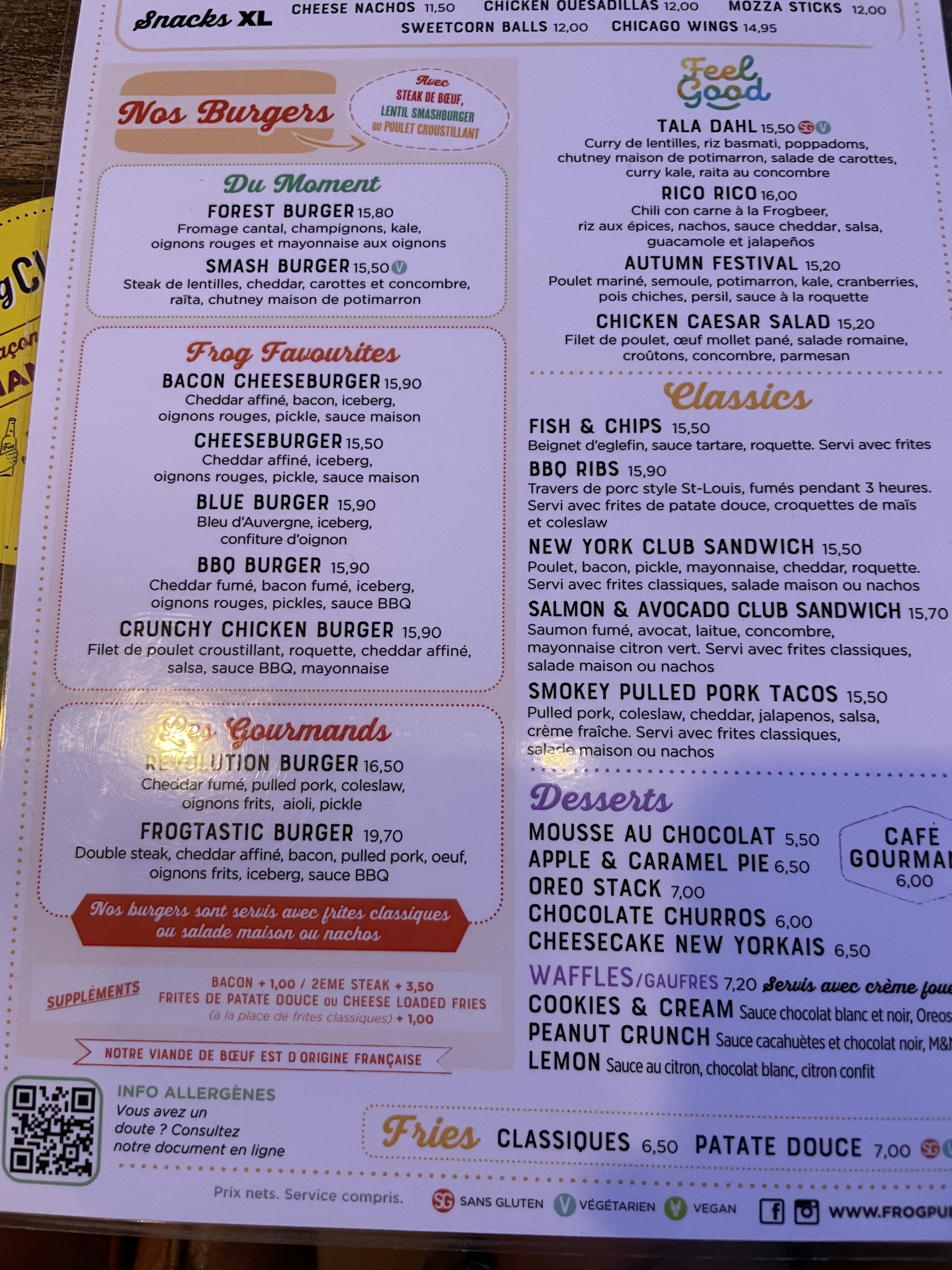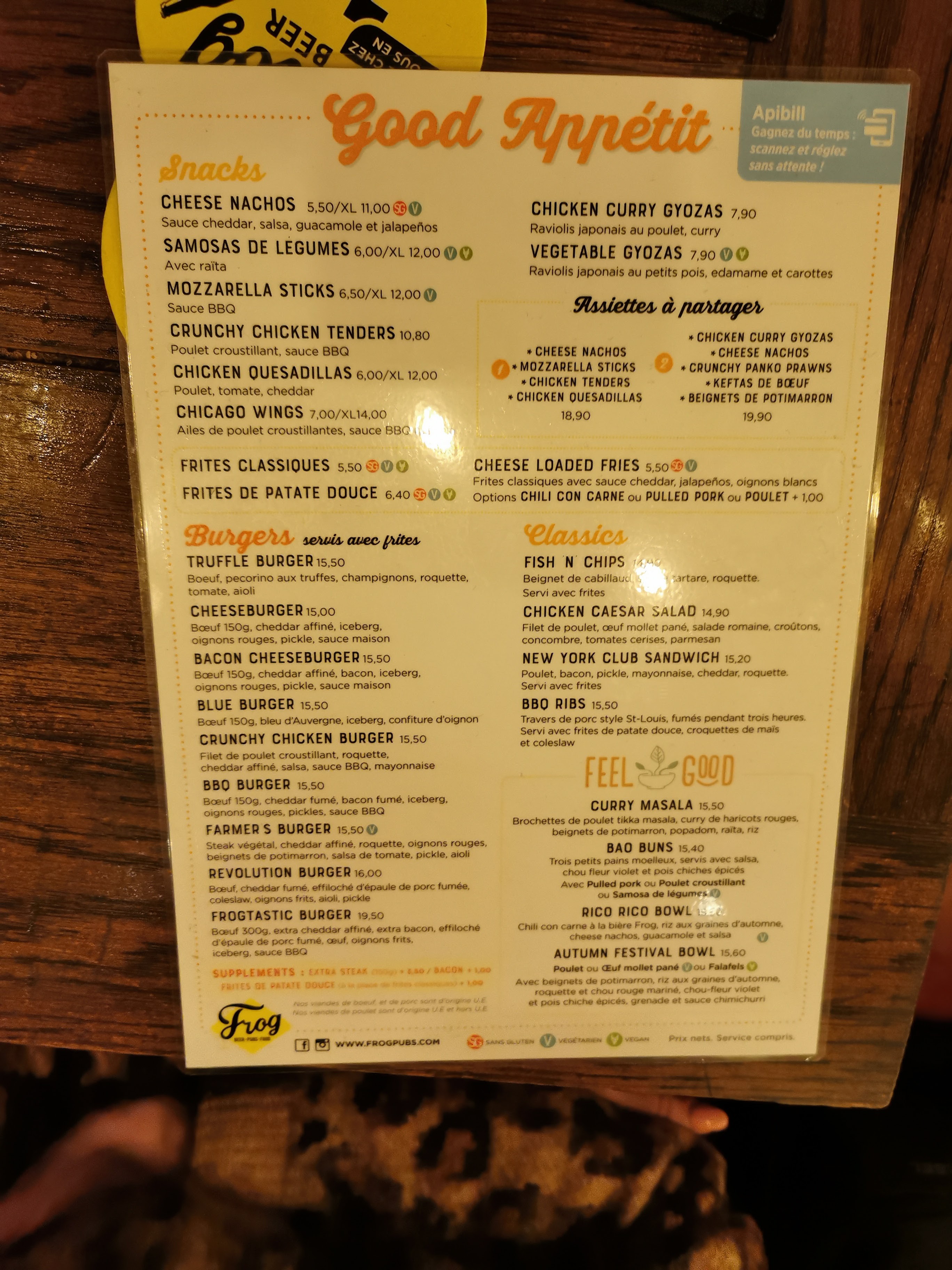 L'ambiance, la nourriture et les boissons sont bien, c'est un Frog. Les prix sont raisonnable pour Paris. Par contre le service... Pas catastrophique, mais une erreur/oubli à chaque fois. Un quart d'heure d'attente pour une bière bouteille oubliée, obligé d'aller la chercher nous même au bar. OK c'est difficile de recruter en ce moment, mais accordez plus de temps à la formation des nouveaux.