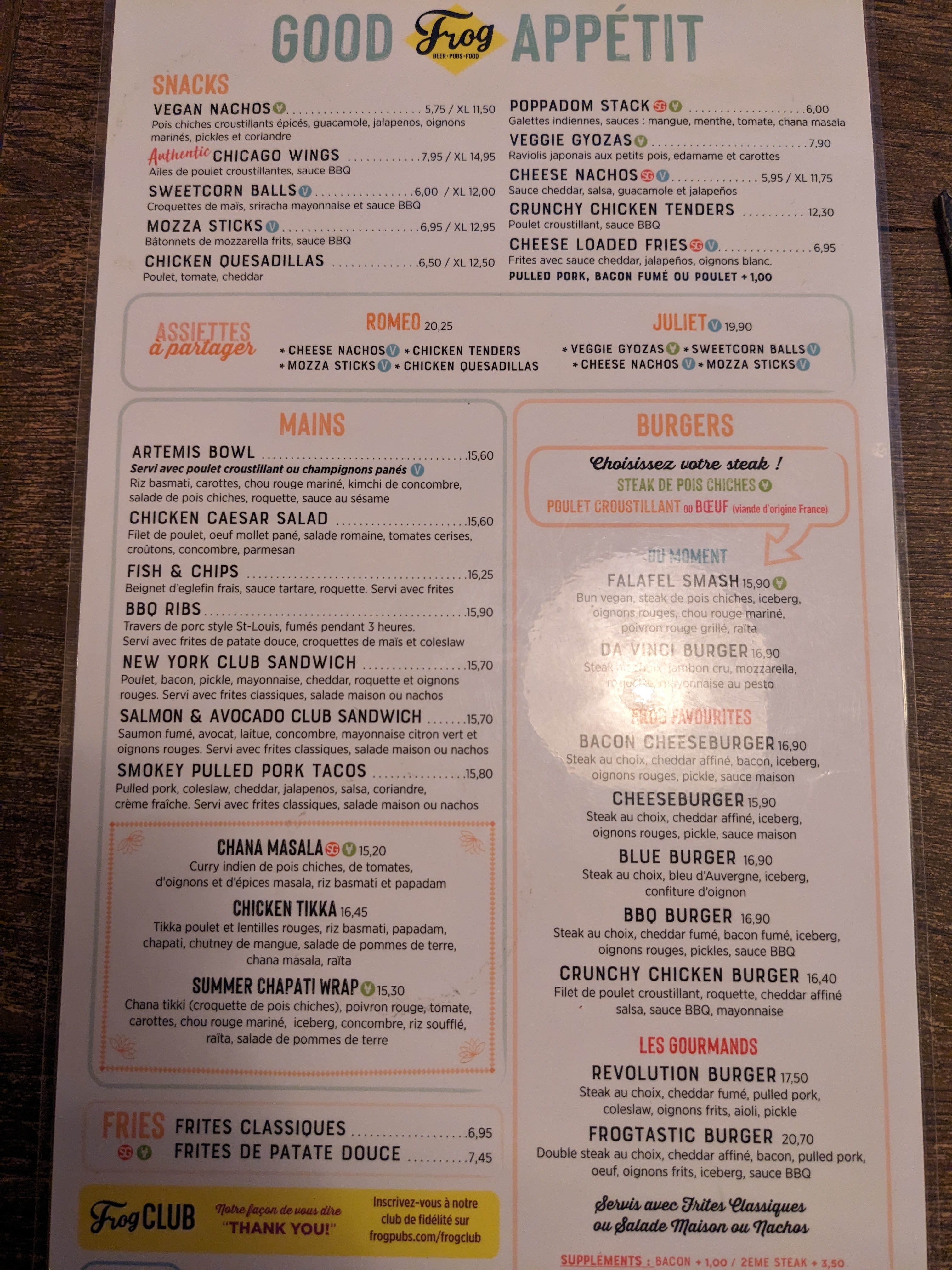 Plusieurs fois que je me rends au Frog rue Montmartre sur Grands Boulevards (le meilleur de Paris) et j’ai toujours été agréablement surprise par le service au top (et les excellents mozza sticks) ! Vous serez chanceux si vous êtes servi(e)s par la serveuse Marina, très serviable, très agréable, elle fera tout pour que vous passiez un bon moment. Je recommande cet endroit à 100% !