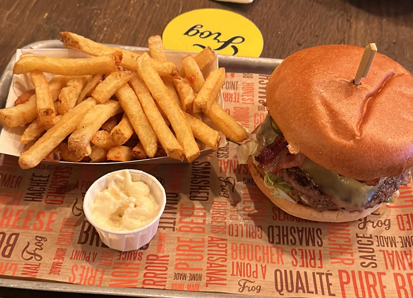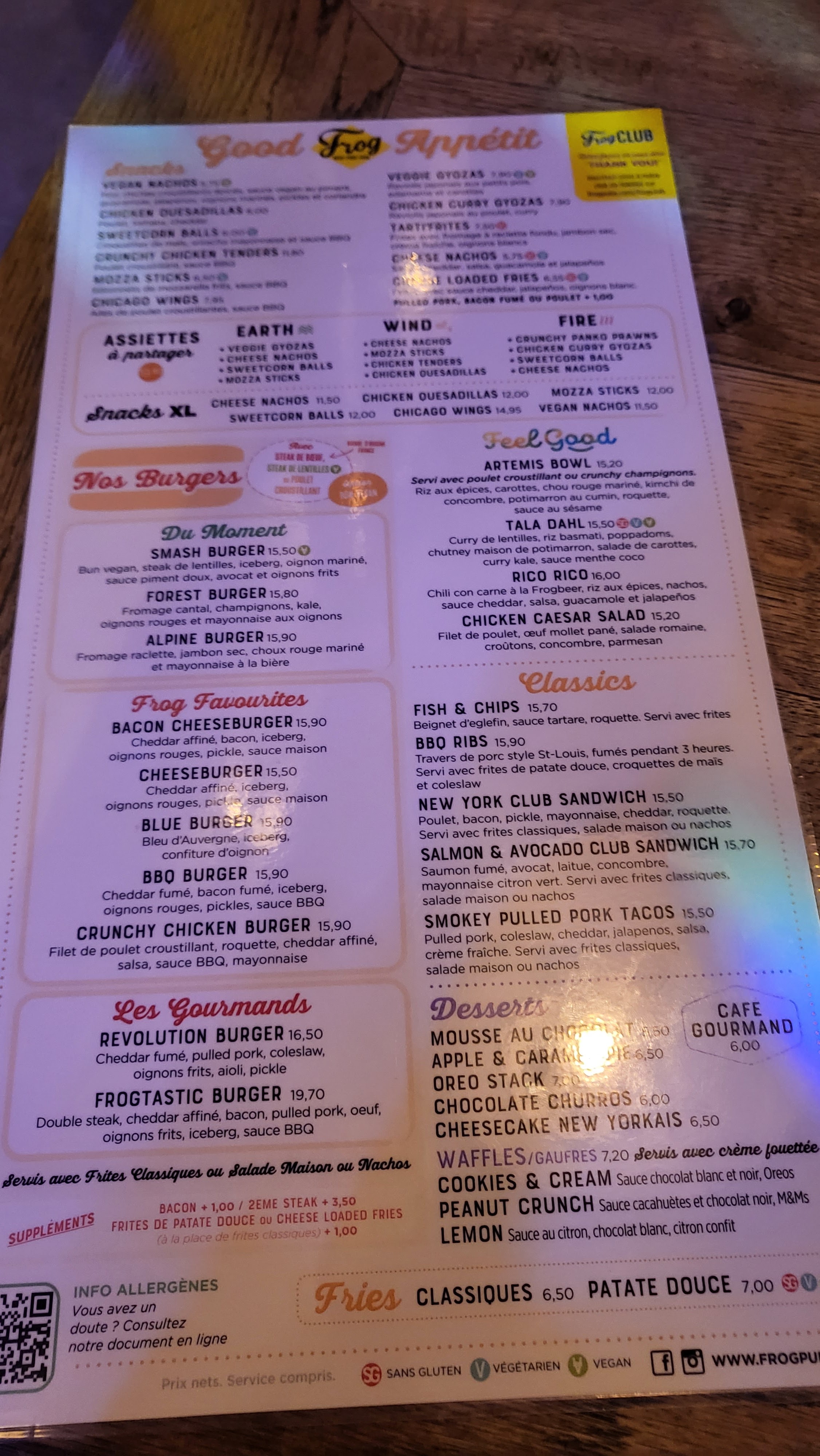 Première fois que je vais dans ce Frog. Les cocktails étaient réussi et les burgers tress bons. La décoration est très sympa. J'ai pu m'installer à une table à 18h45 alors que ma réservation était à 20h15..... merci 🥳🥰