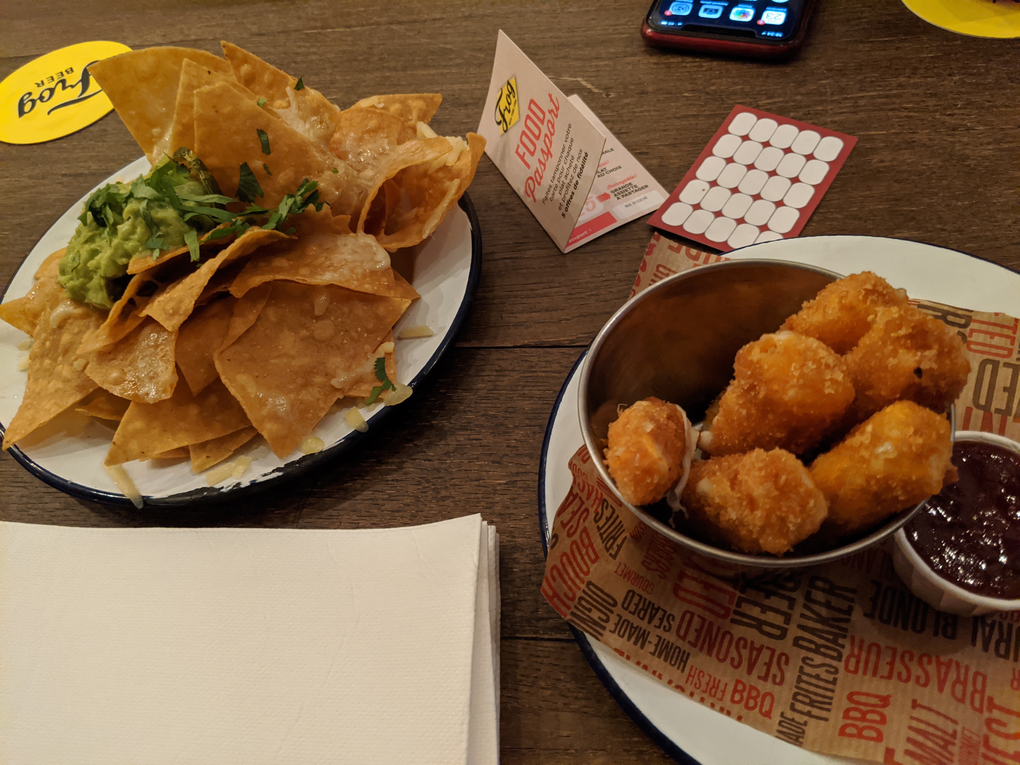 Comme toujours dans un pub Frog, la bière était très bonne. C'était notre première fois dans cette grenouille en particulier et, malheureusement, les nachos, qui sont généralement un bon pari, étaient très médiocres. Nous avons demandé des jalape os supplémentaires, mais lorsque la nourriture est arrivée, il n'y en avait pas du tout. Je n'ai pas pu identifier ce qui passait pour du fromage, mais il n'y en avait pas beaucoup non plus. Les autres plats du bar avaient l'air bien. Si un plat ne peut pas être préparé avec tous les ingrédients, alors très bien, mais mentionnez-le au moins - nous avons peut-être commandé autre chose. Dans l’état actuel des choses, nous avions tous les deux très faim et nous l’avons quand même mangé. J'en ai parlé à la serveuse et elle a semblé surprise, il semblait donc que la commande avait été passée correctement. Nous avons déjà mangé cela dans d'autres pubs Frog et cela a généralement été très bon. C'est la chose la plus basique de votre menu, les gars, si vous n'y parvenez pas, nous reviendrons peut-être pour une bière, mais nous transmettrons la nourriture, merci.