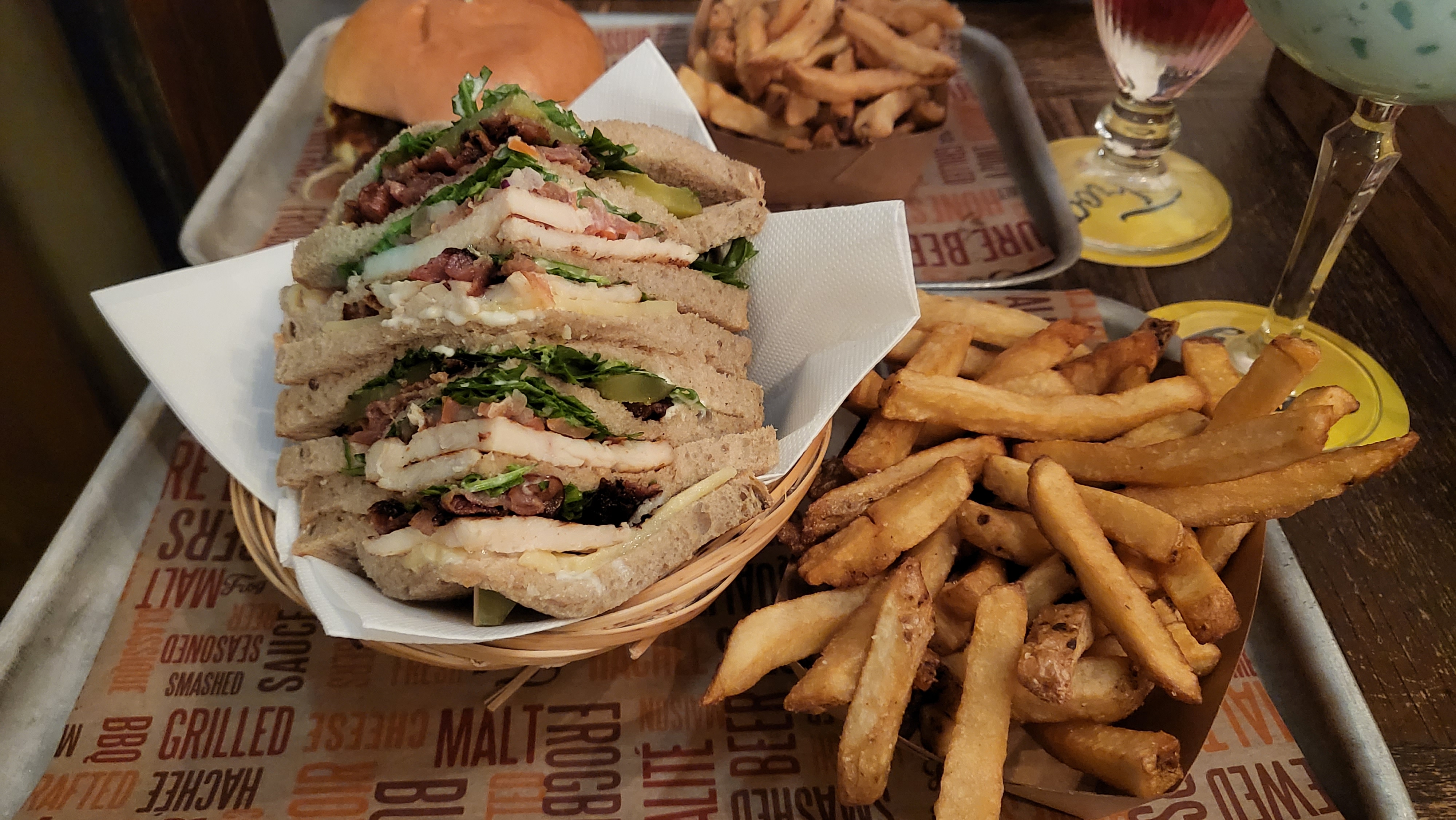 Nous étions un groupe de 4. J'ai commandé le burger au poulet, 2 d'entre nous ont choisi le burger au bœuf et le dernier a choisi un club sandwich. Ce dernier était ok, les hamburgers au bœuf étaient adéquats. J'ai dû pourchasser notre serveur pour lui demander où se trouvait mon burger au poulet car il n'était pas servi avec les autres. Je pense qu'on l'a oublié. Au bout de 10 minutes supplémentaires, j'ai eu mon hamburger mais il était à peine mangeable. Le poulet n'était pas à la hauteur, très moelleux. Le service est à désirer. Les salles de bain étaient vraiment sales mais apparemment celle pour personnes handicapées était propre. Je ne recommanderais pas cet endroit à moins de monter prendre un verre.