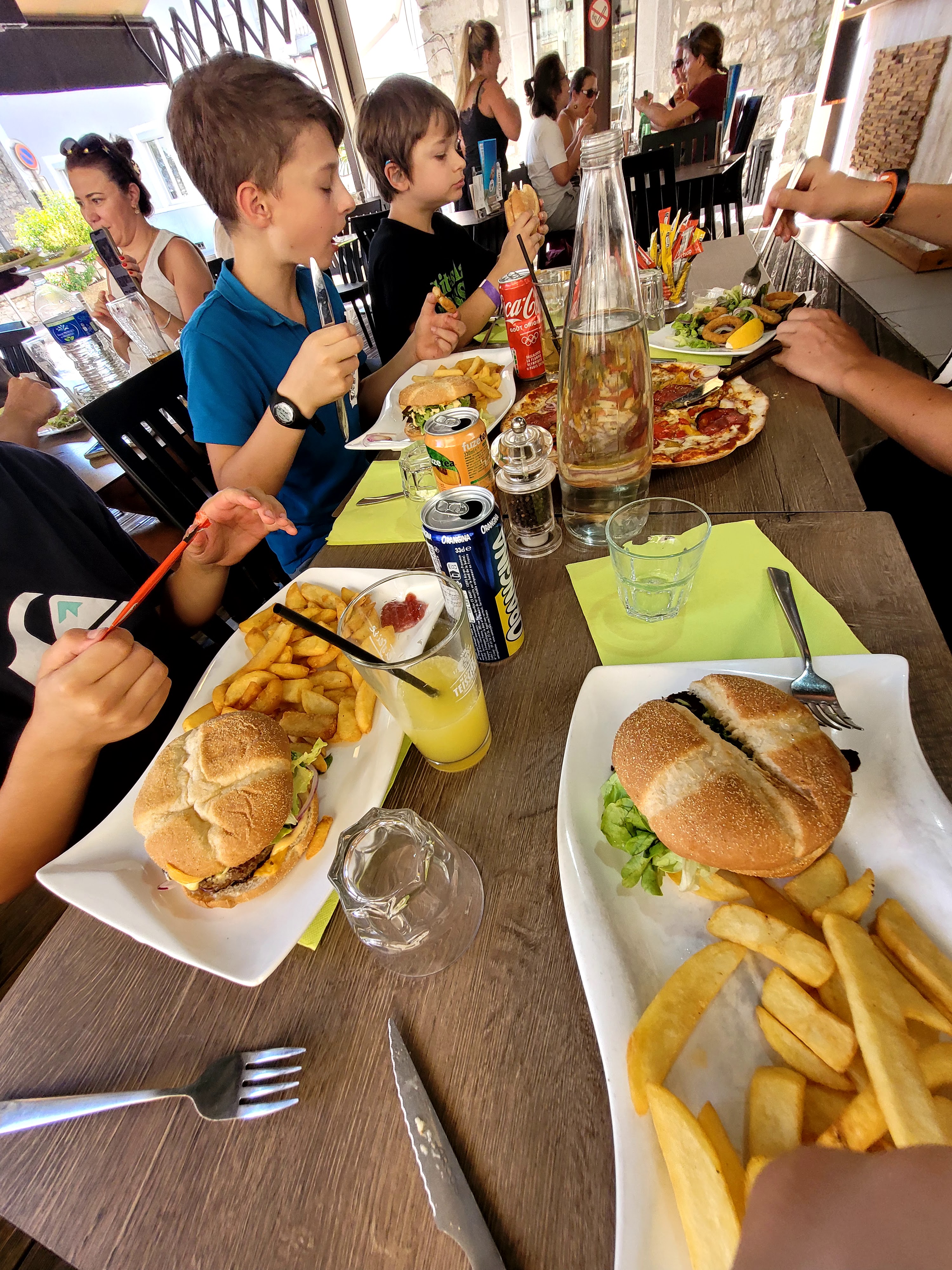Bons hamburgers maison, menus enfants variés (hamburger nuggets mais aussi tagliatelles avec garnitures au choix bolo saumon etc) tables très rapprochées en terrasse. 1 seul toilette mixte.