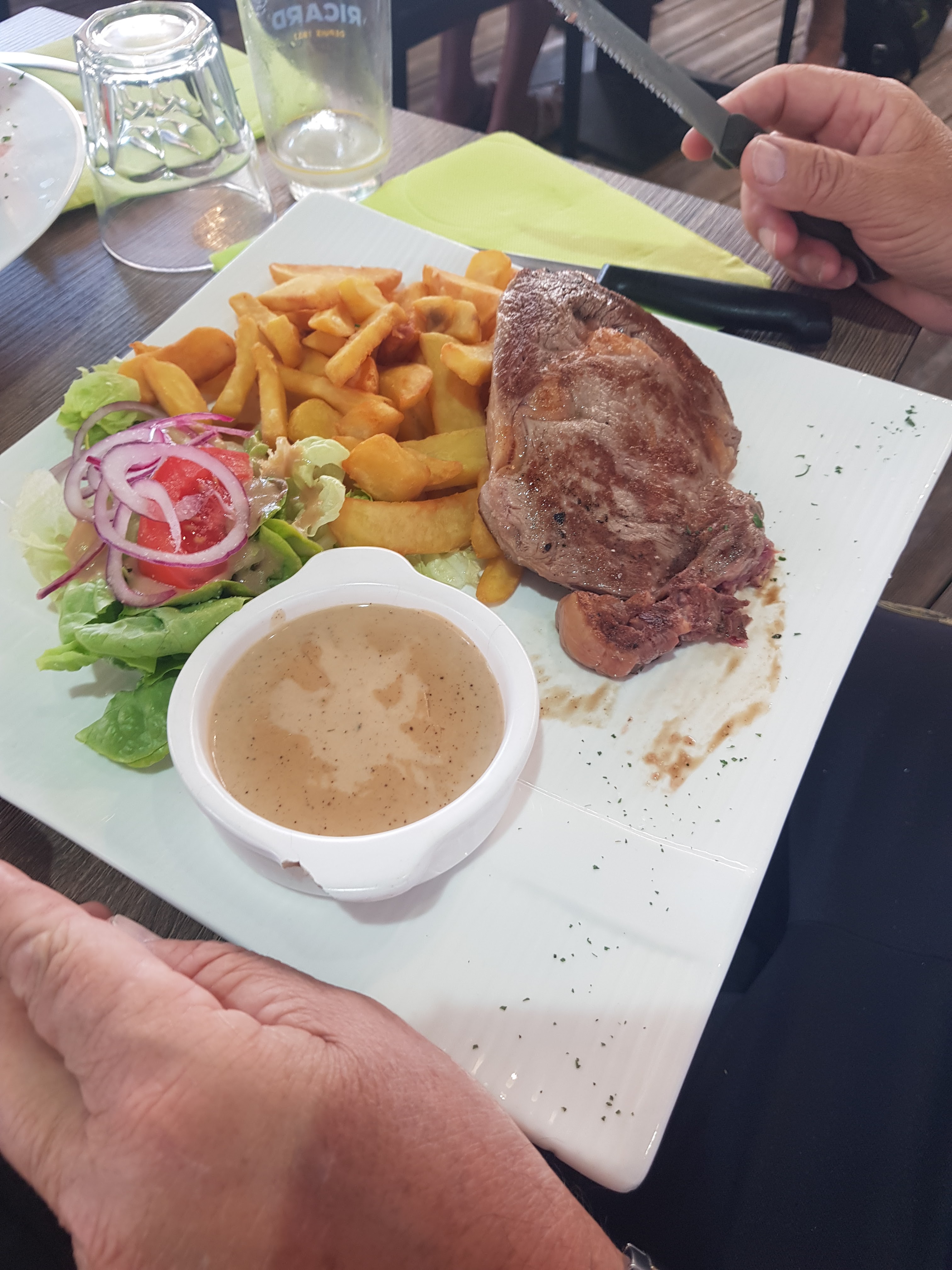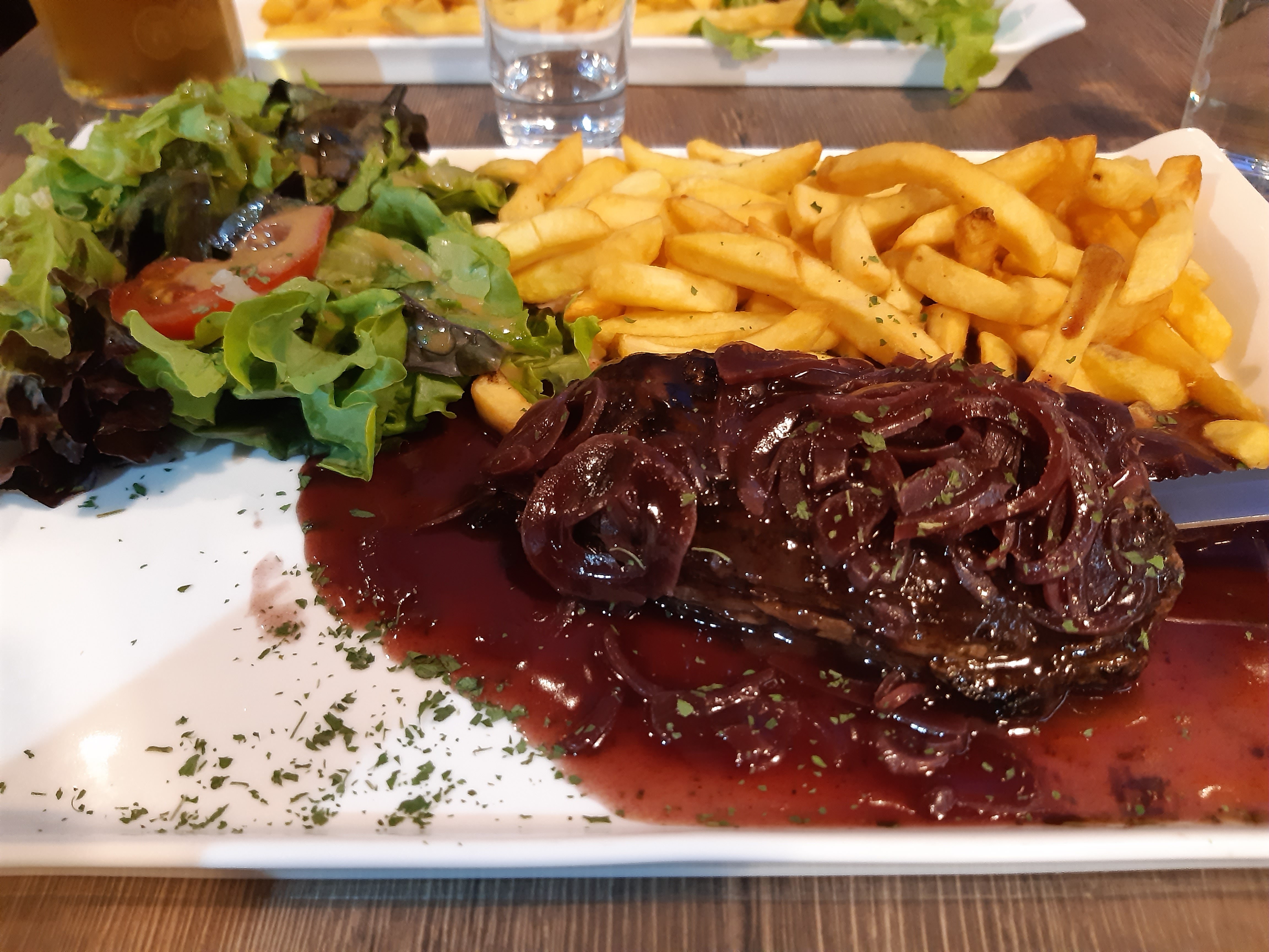 Personnel sympa ..bon acceuil chalereux...cuisine copieuse et bonne...le fish and chips tres bon d apres mon fils...la bavette tres tendre et la sauce echalottes confites au vin rouge delicieuse...le tartare bien...et les salades copieuses ...menus enfants rien a redire...accepte les ancv...que du bon ...si vous vous arretez a ruoms...n hesitez pas