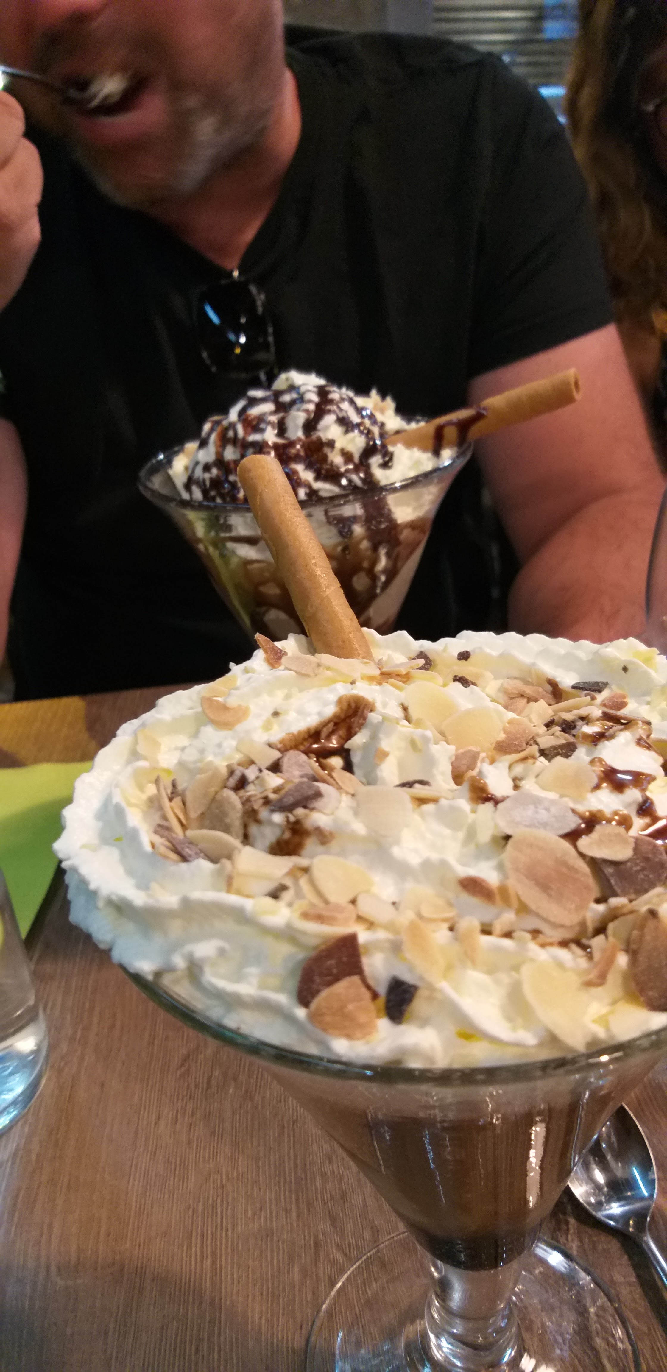 Bonjour mon mari et moi ont été contents ensemble des serveurs agréables Glaces très bonnes, quantités normales, prix raisonnable par rapport au alentour, et la décor sympathique. Cordialement Mme Chareyre Marjorie