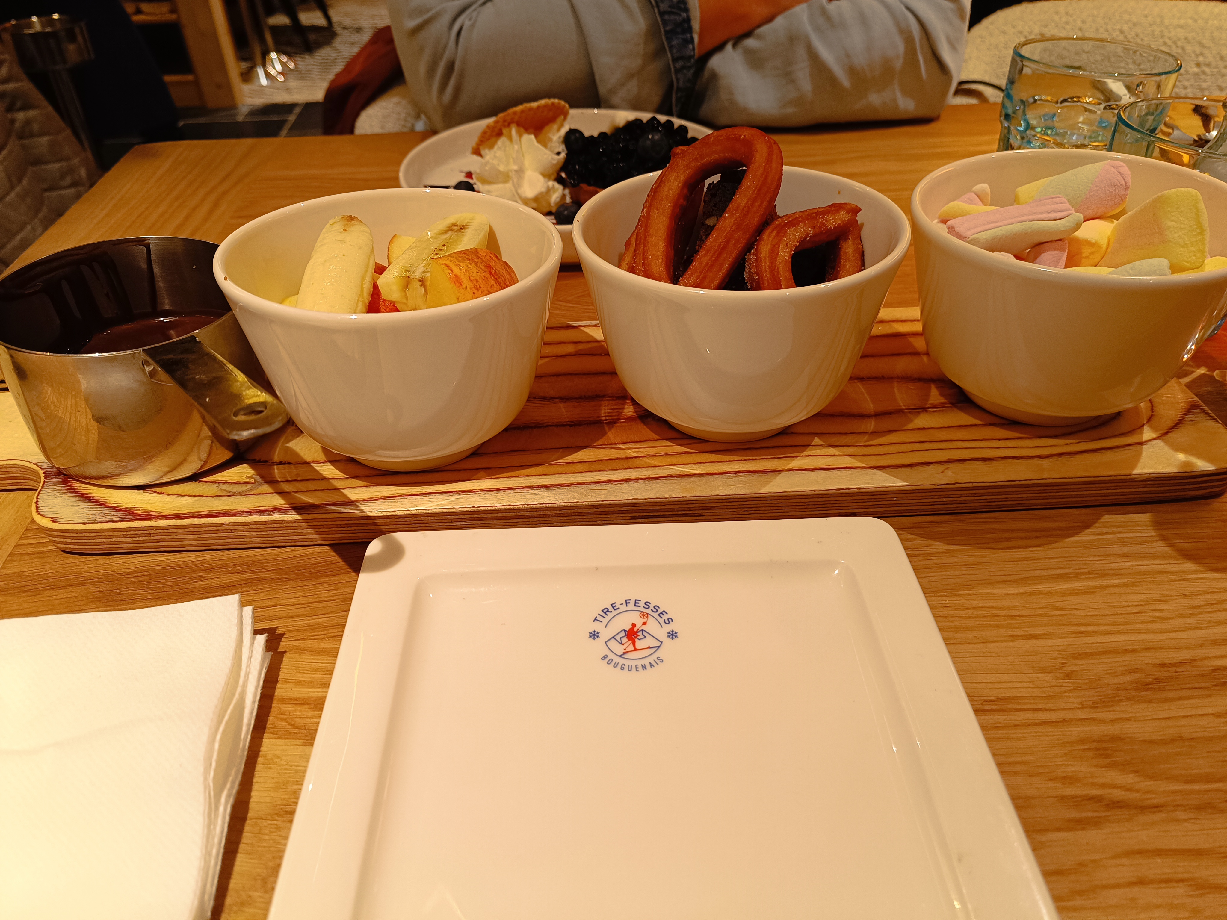 Très bonne découverte, superbe decos, service rapide 1h( apéro , fondu , dessert ) On ce croirait vraiment dans un chalet , la fondu n’est pas écœurante ( fondu au cèpes )1 assiette de charcuterie suffit pour 2 personnes. Le service est rapide et le personnel est chaleureux. Au plaisirs de revenir.
