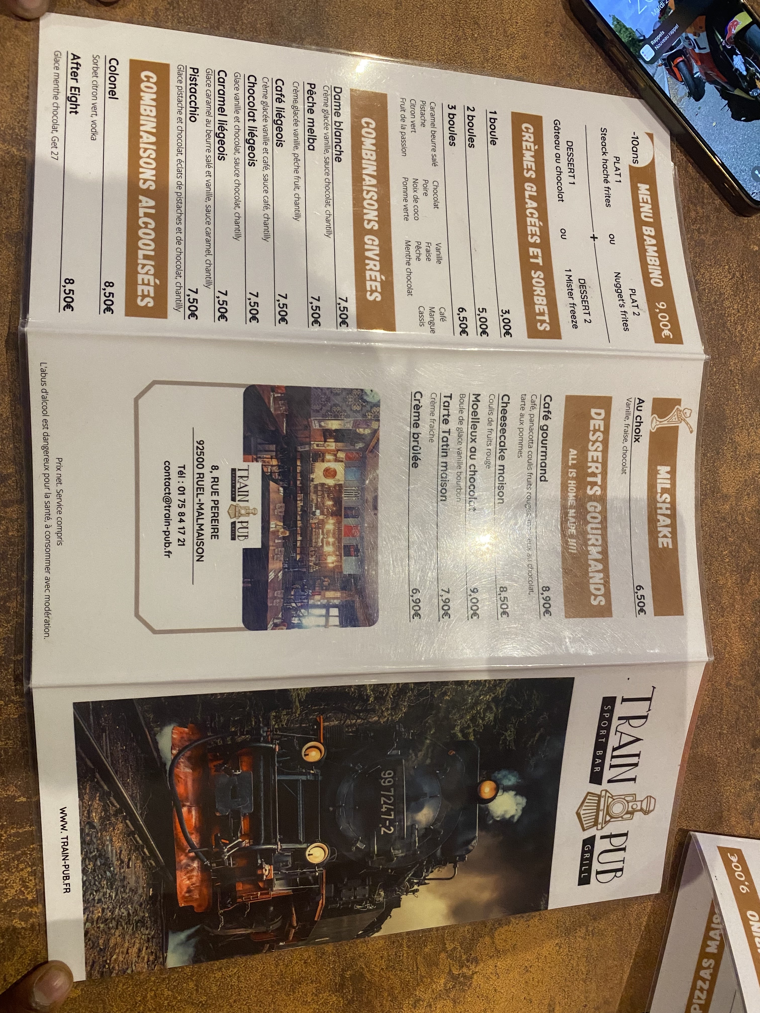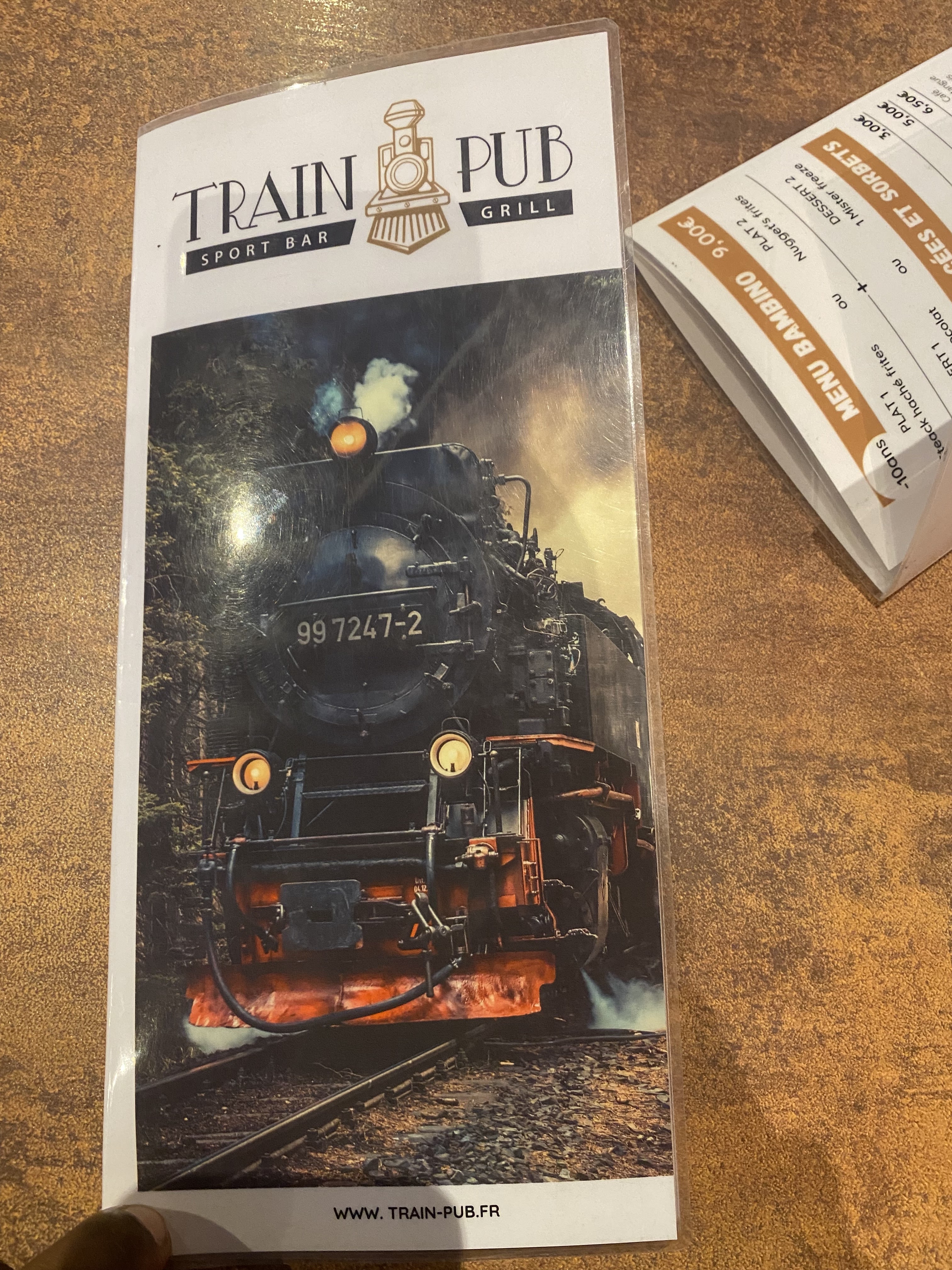 On cherchait où aller voir (perdre) le PSG et par hasard mon pote et moi nous nous sommes retrouvés au TRAIN PUB. Malgré la défaite nous avons passé un super moment car l'équipe assurant le service et le bar est super sympa. A ne pas rater Faïza, une petite nana rigolote avec une patate de folie... Pour l'ambiance, nous avons adoré l'endroit. Alors comme disait Valérie merci pour ce moment ! et à bientôt. Pascal et Franck.